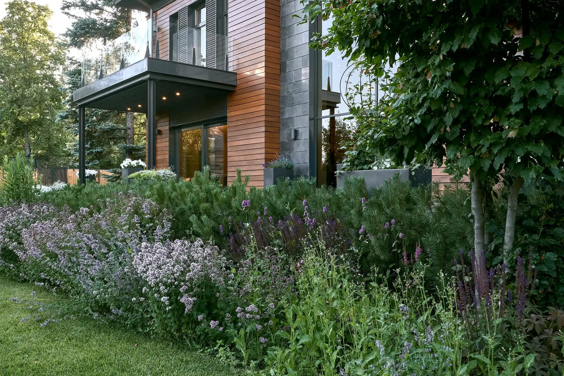 النباتات هنا ليست مجرد ديكورات. جميع عناصر البيئة تطور علاقات معها. حديقة زهور مشرقة وديناميكية تؤكد على الهندسة والإيجاز في المساحات الخارجية، وأشجار الصنوبر المنخفضة والضخمة تحافظ على الحدود على طول الشرفات، وحجر المسارات يكرر الحجر على الواجهات. تفصيل يتبع تفصيل.