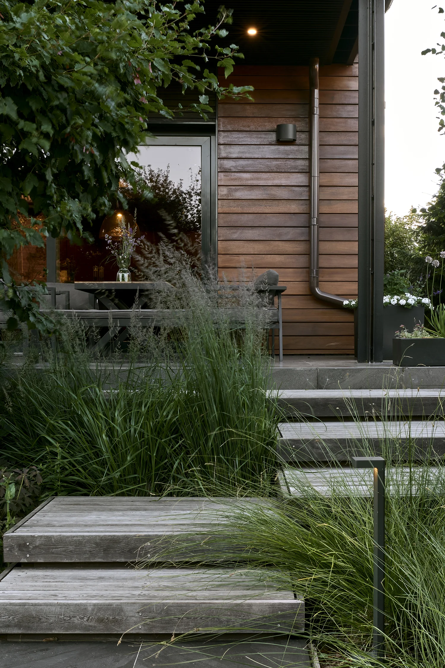 عائلة هذا المنزل لا تفتقد العطلات والسفر. كل يوم يحيطون بمشهد طبيعي آسر. العمارة الإسكندنافية لا تغفر الإهمال في محيطها — الشرفات والمروج امتدت بشكل طبيعي للحياة خارج المساحات الداخلية.