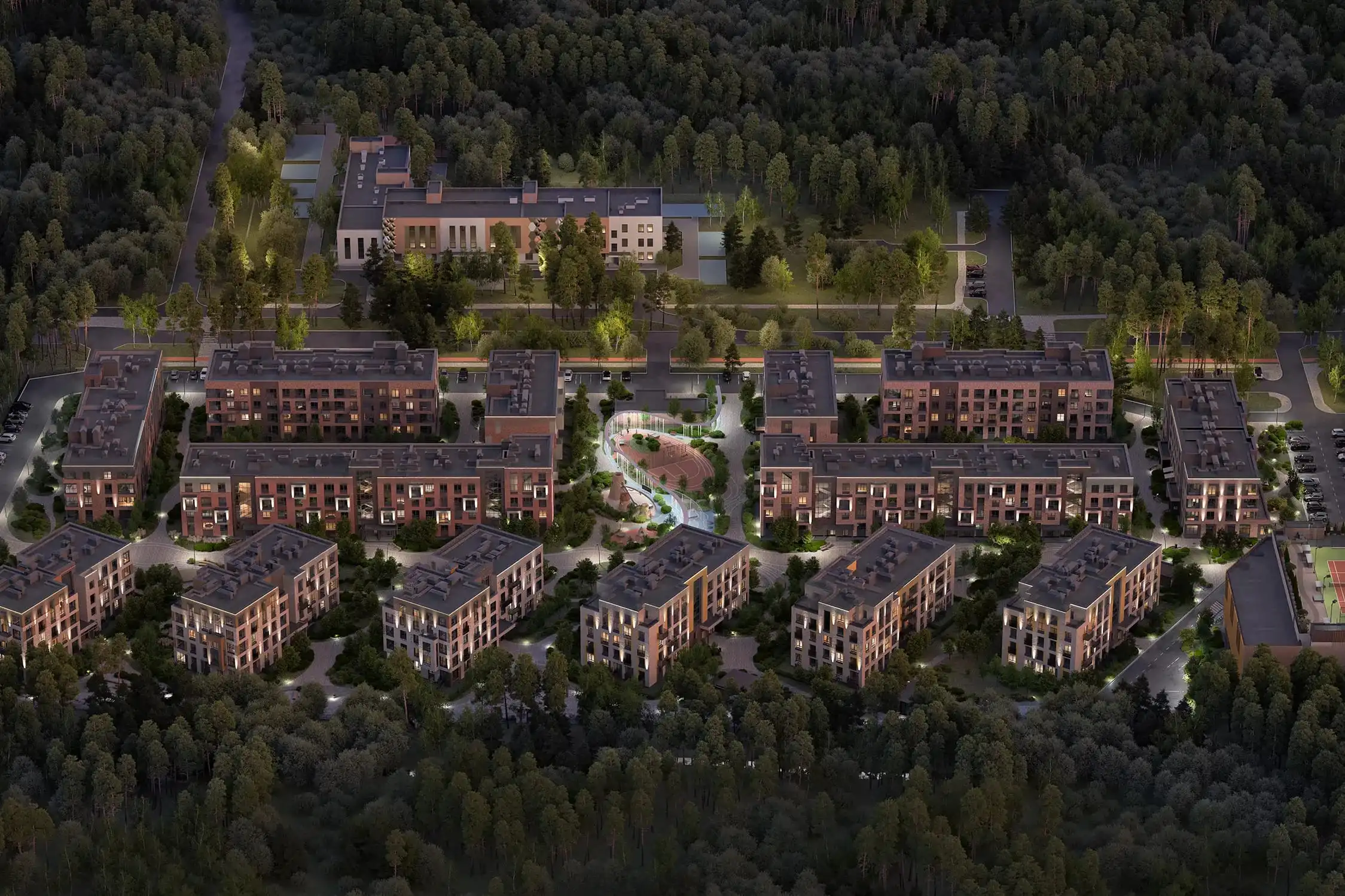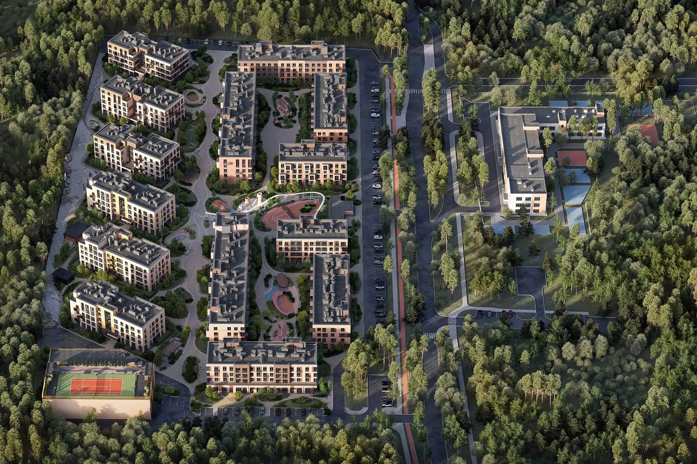 في صميم المفهوم، نستخدم صورة ظلية للخطوط، نوع من صورة موجة من خليج فنلندا تدخل المجمع السكني. هذا يخلق بنية متدفقة لم تفقد راحتها الوظيفية. يمكن الوصول إلى كل كتلة بالسيارة، ويشمل الإقليم منطقة حفلات، ومنطقة للرياضة وألعاب الأطفال، حديقة مجتمعية، وممر فني مع أجنحة للاستجمام والشواء، وكذلك قوس يؤدي إلى الغابة. توحد كل هذه العناصر من خلال خطوط بلاستيكية وأنيقة تلطف من صرامة العناصر المعمارية. تم اختيار الأشكال المعمارية الصغيرة بأسلوب الآرت ديكو الحديث مع إشارة إلى أفكار المهندس المعماري الفنلندي ألفار آلتو والسعي نحو البساطة الاسكندنافية، التي هي ضرورية هنا. من بين التقنيات المبتكرة مقاعد مدفأة ومصابيح بالأشعة تحت الحمراء لتدفئة مناطق معينة.