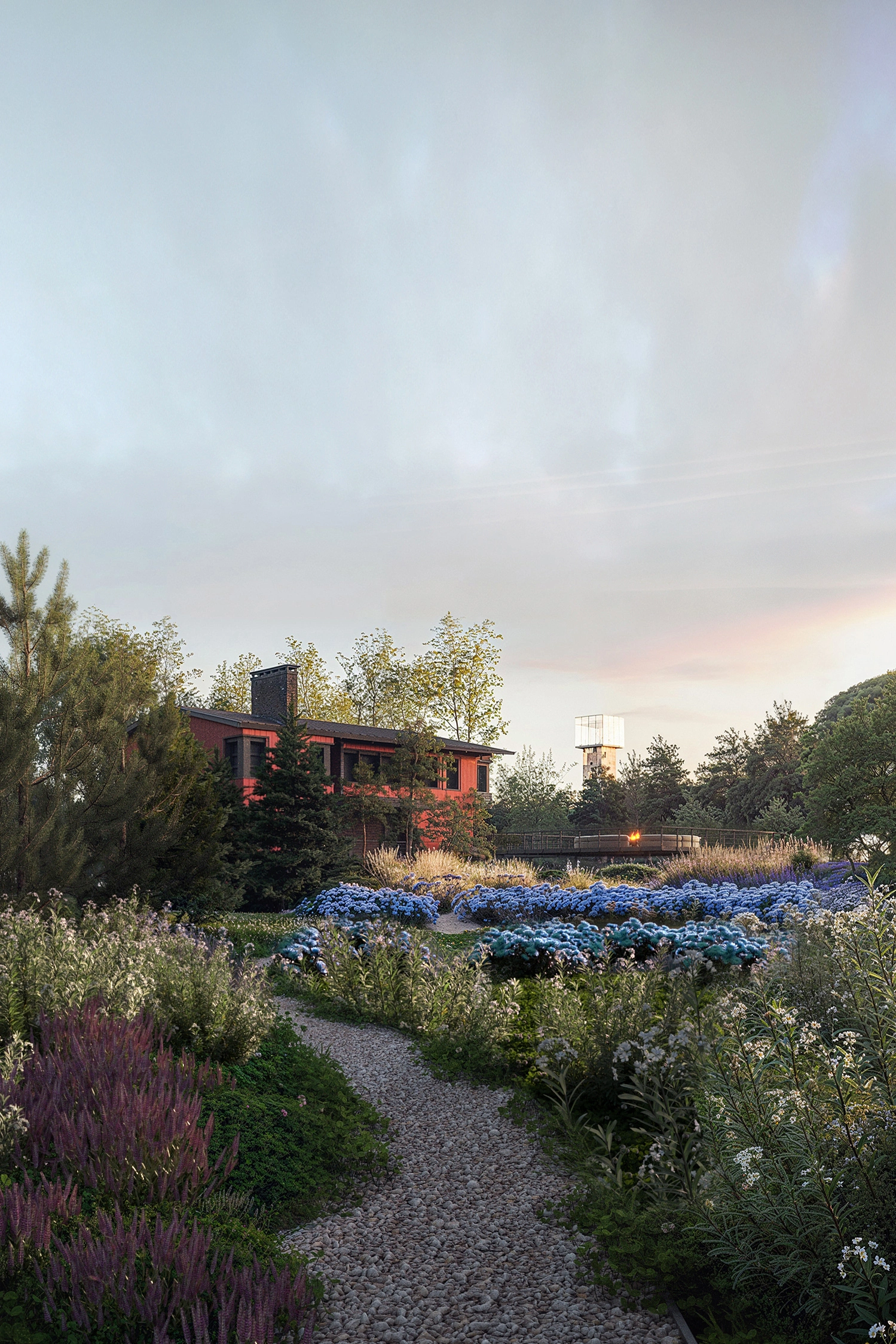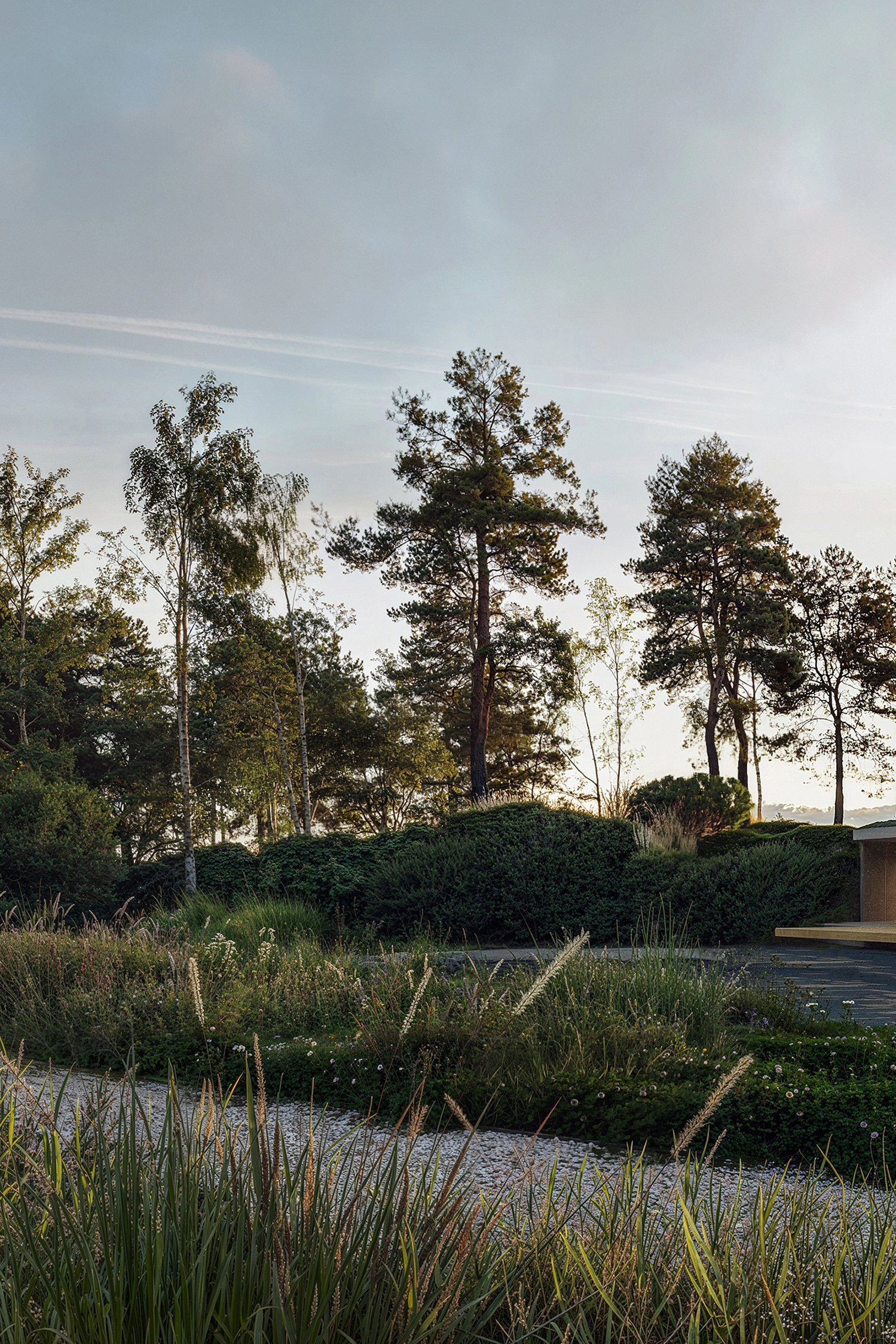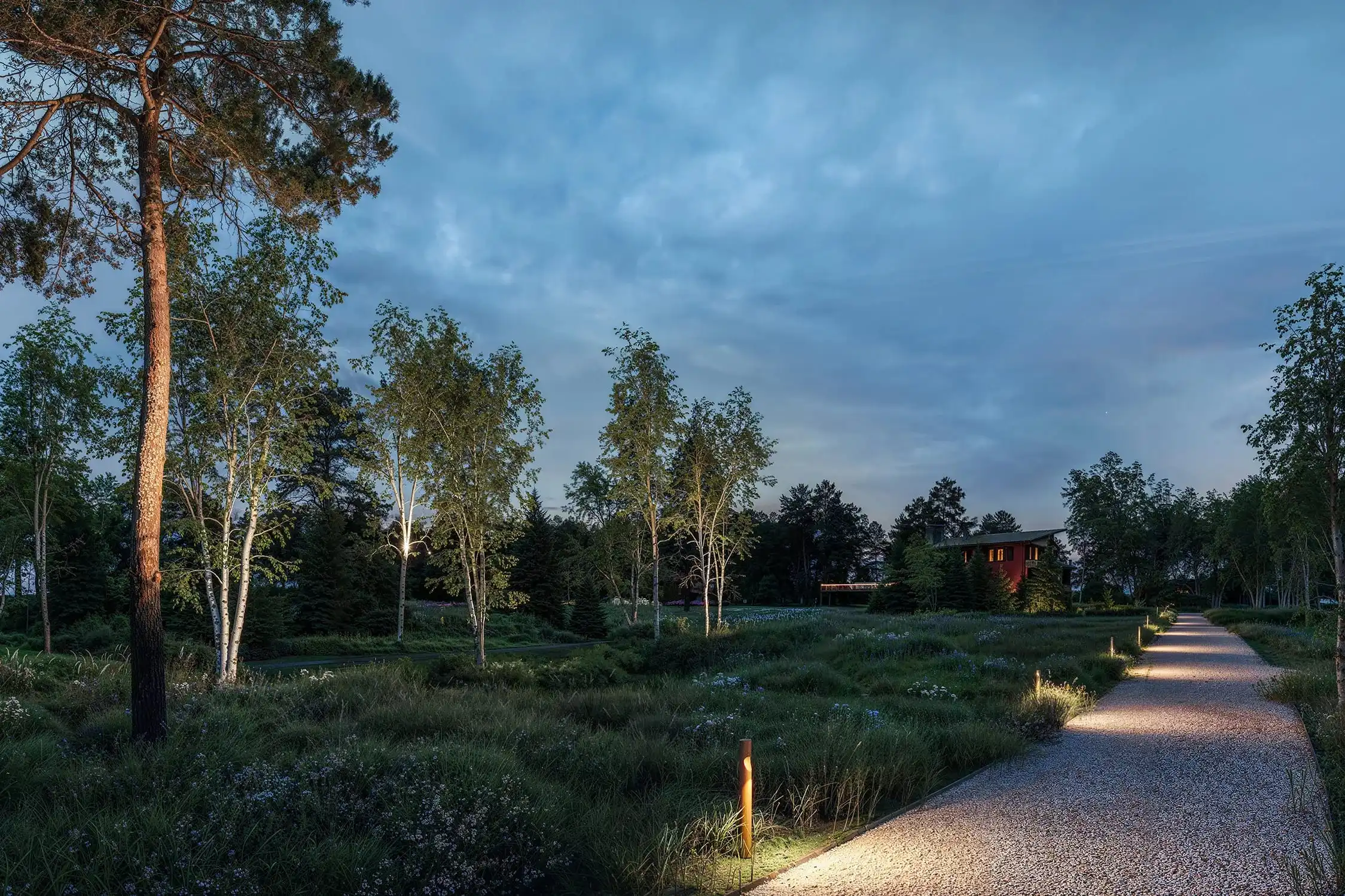 Eine besondere Bedeutung erlangte der Damm, der nicht nur dem Schutz des Geländes vor Wind, Wildtieren und neugierigen Blicken dient. Es hat auch einen Pavillon, einen Grillbereich und ein offenes Wohnzimmer mit einem grünen Dach untergebracht. Die Landschaftsgestaltung erfolgt im Wiesenstil, wobei besonderes Augenmerk auf die Schaffung eines Sammelarboretums gelegt wird, da das Sammeln einzigartiger Pflanzen ein Hobby des Gartenbesitzers ist.