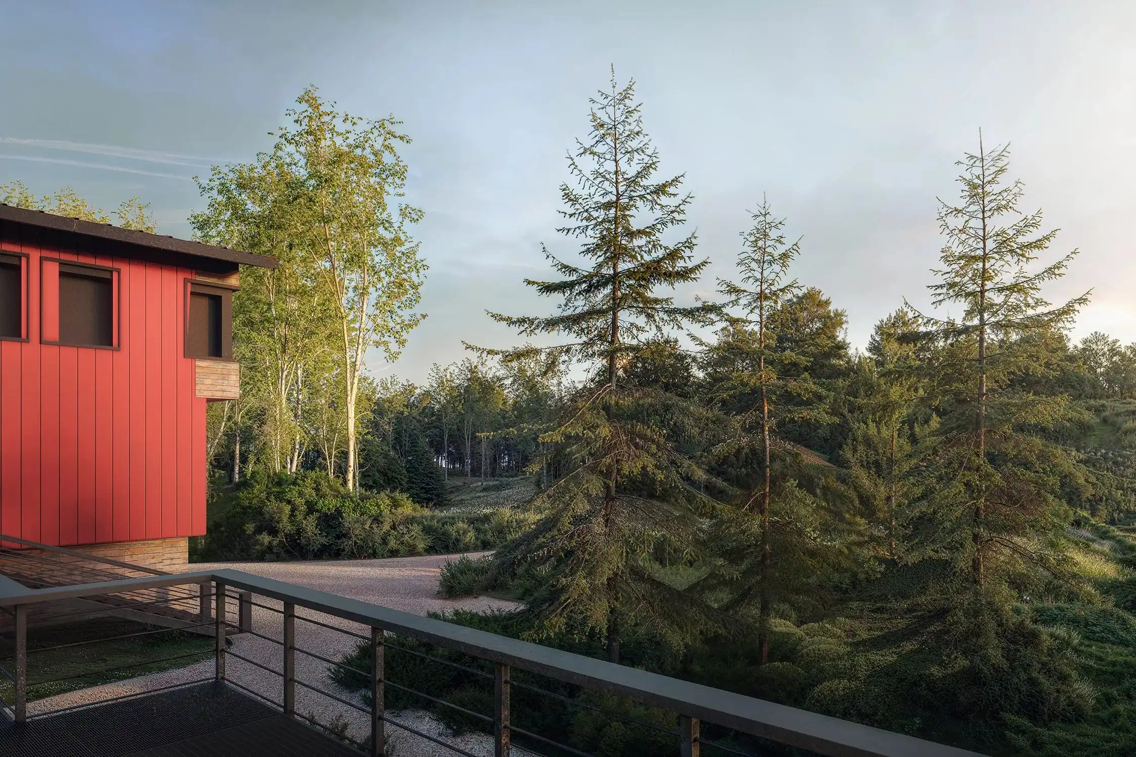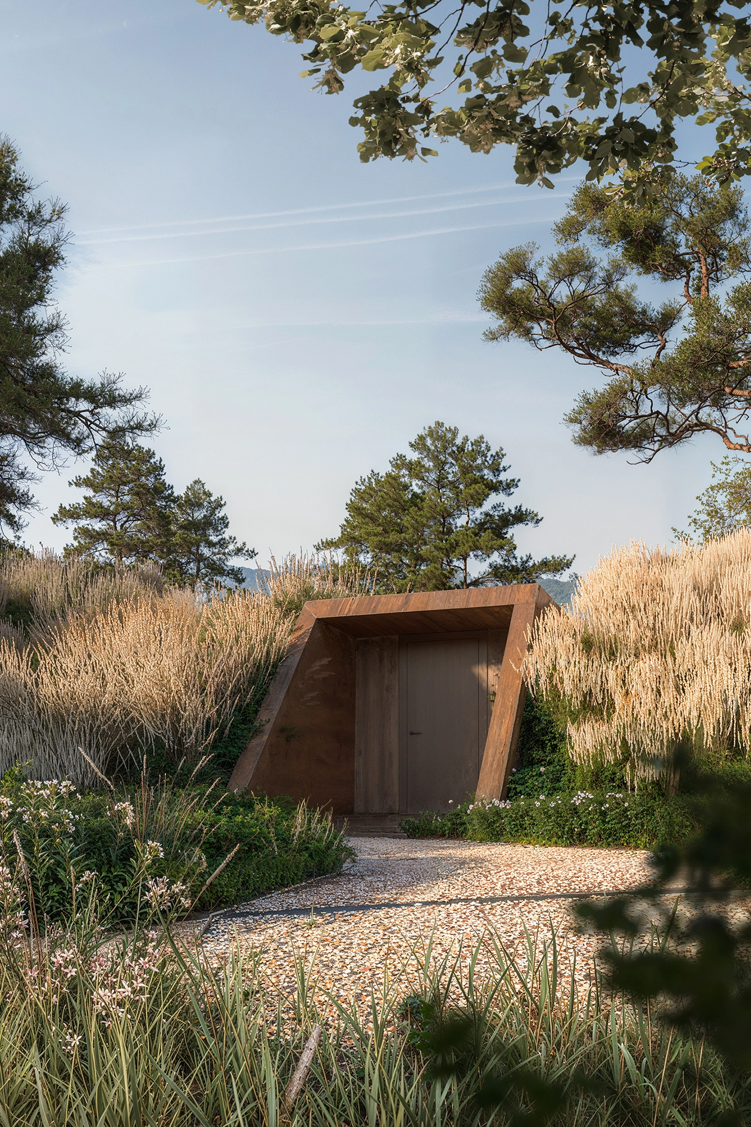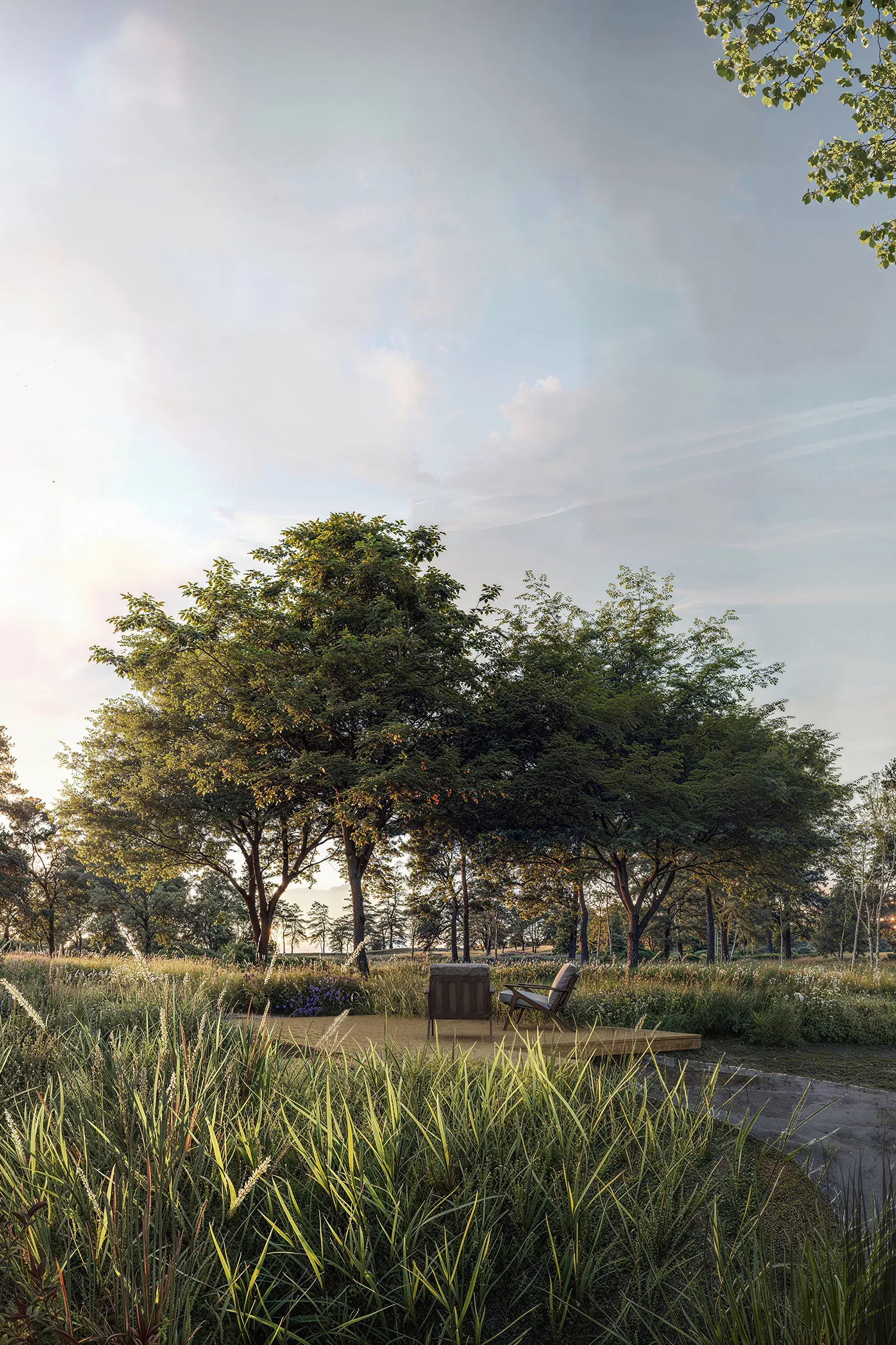Eine besondere Bedeutung erlangte der Damm, der nicht nur dem Schutz des Geländes vor Wind, Wildtieren und neugierigen Blicken dient. Es hat auch einen Pavillon, einen Grillbereich und ein offenes Wohnzimmer mit einem grünen Dach untergebracht. Die Landschaftsgestaltung erfolgt im Wiesenstil, wobei besonderes Augenmerk auf die Schaffung eines Sammelarboretums gelegt wird, da das Sammeln einzigartiger Pflanzen ein Hobby des Gartenbesitzers ist.