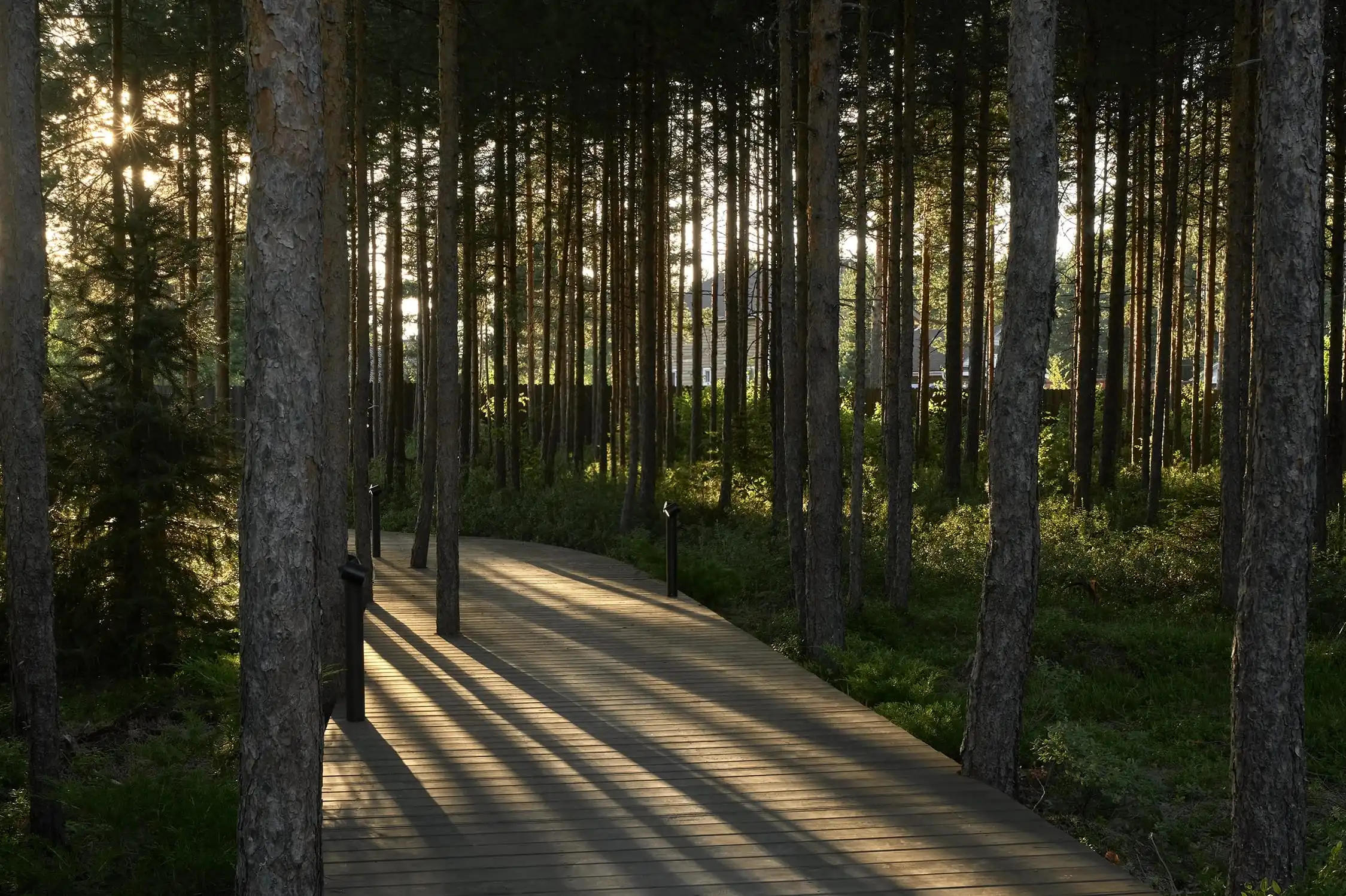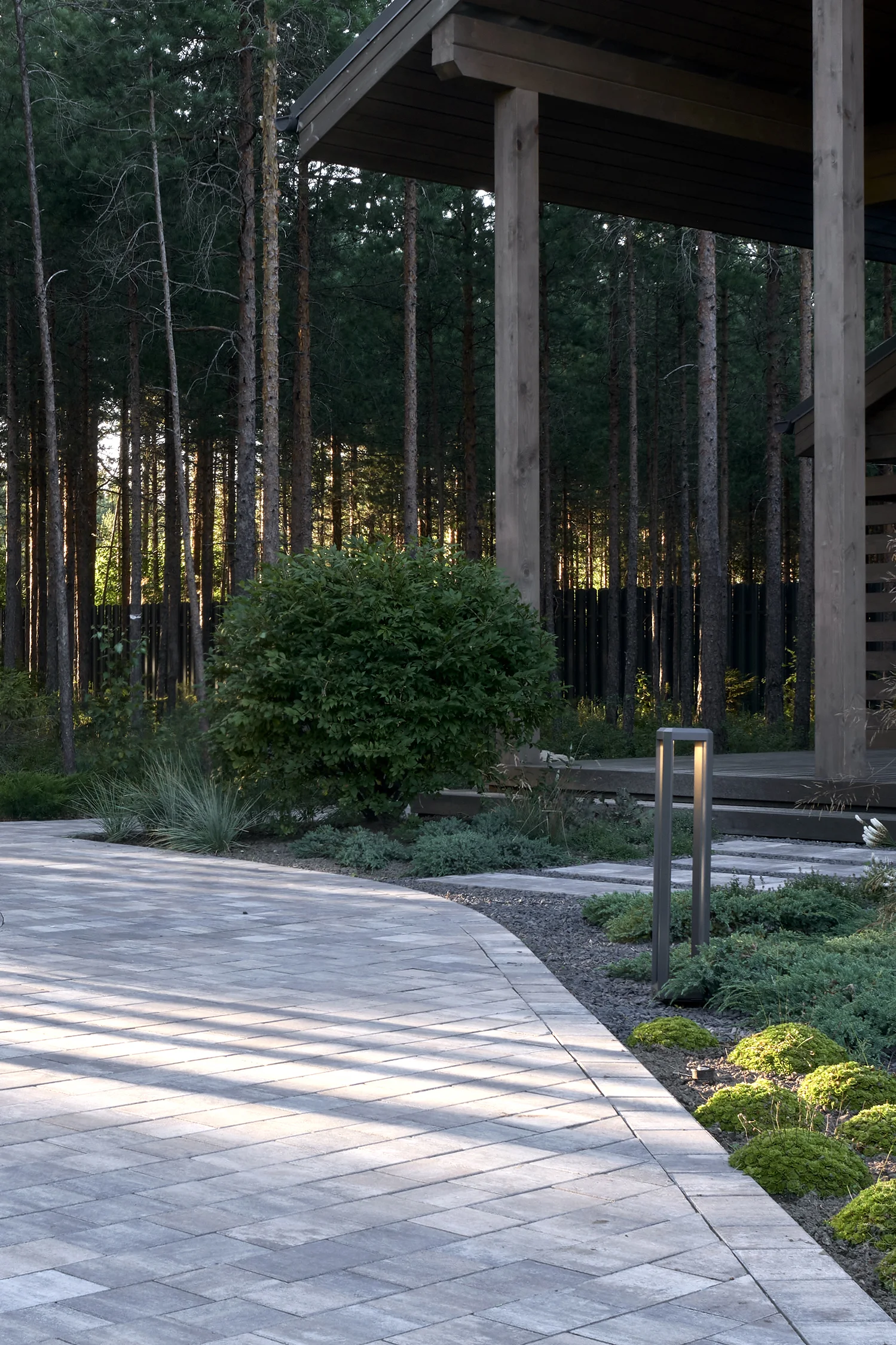 Um mit dem wertvollen Waldgebiet zu spielen, konzentrierten wir alle Bauten. Das Grundstück wurde in zwei Teile geteilt. Einen ließen wir unberührt, überwachsen mit Moos, Heidelbeeren und Preiselbeeren. Den zweiten haben wir gerodet und Inseln geschaffen – Waldwiesen und Rasen mit Mikroklee. Es ist angenehm, zwischen ihnen spazieren zu gehen, für Erwachsene nachzudenken und für Kinder frei zu laufen und Beeren zu sammeln.