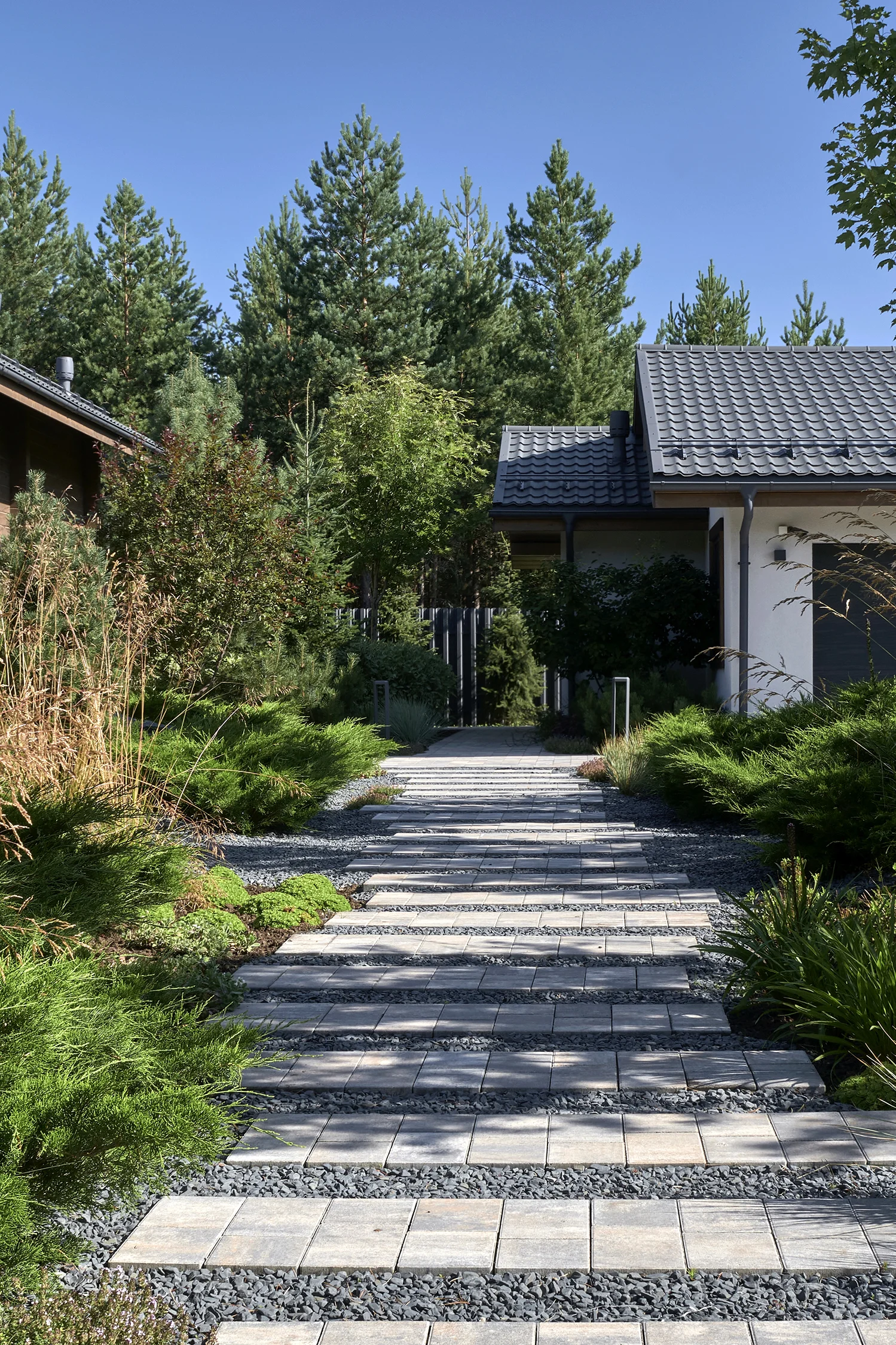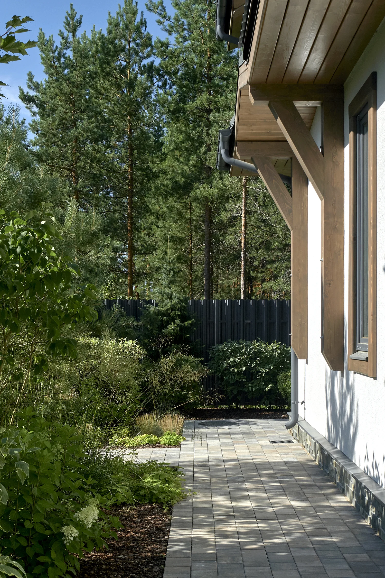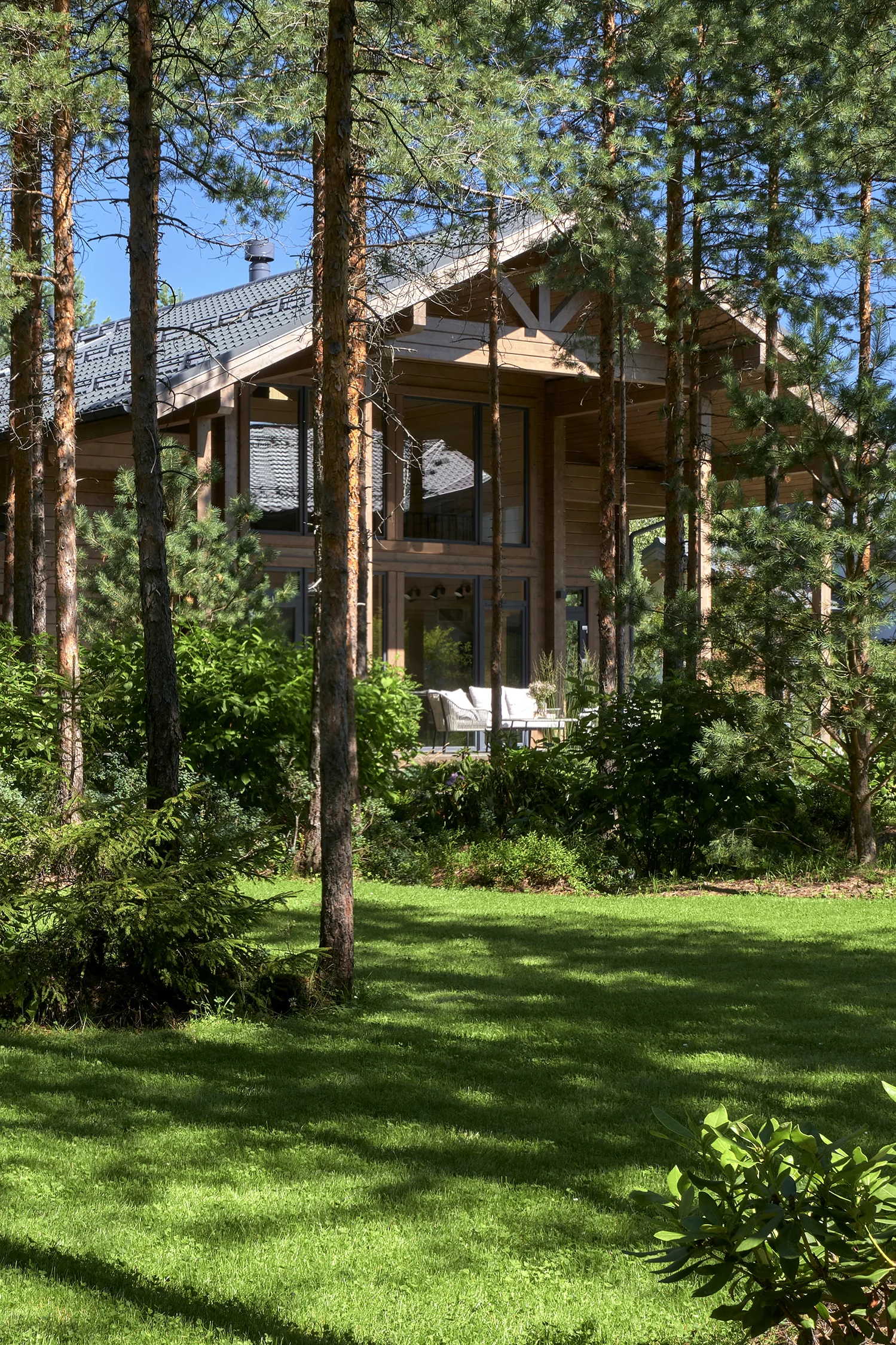 Die Geometrie der großen Wiese wurde von den Auftraggebern bestimmt – ihre Parameter entsprechen einem professionellen Badmintonplatz. In dieser sonnigen Zone fühlen sich auch die Liegestühle für die Sieger wohl, wenn das Match gespielt ist. Und danach können sich die Spieler auf ihre Häuser verteilen, die diskret voneinander durch einen Hügel mit karelischen Steinen, Gräsern und Kiefern in der Mitte verborgen werden.
