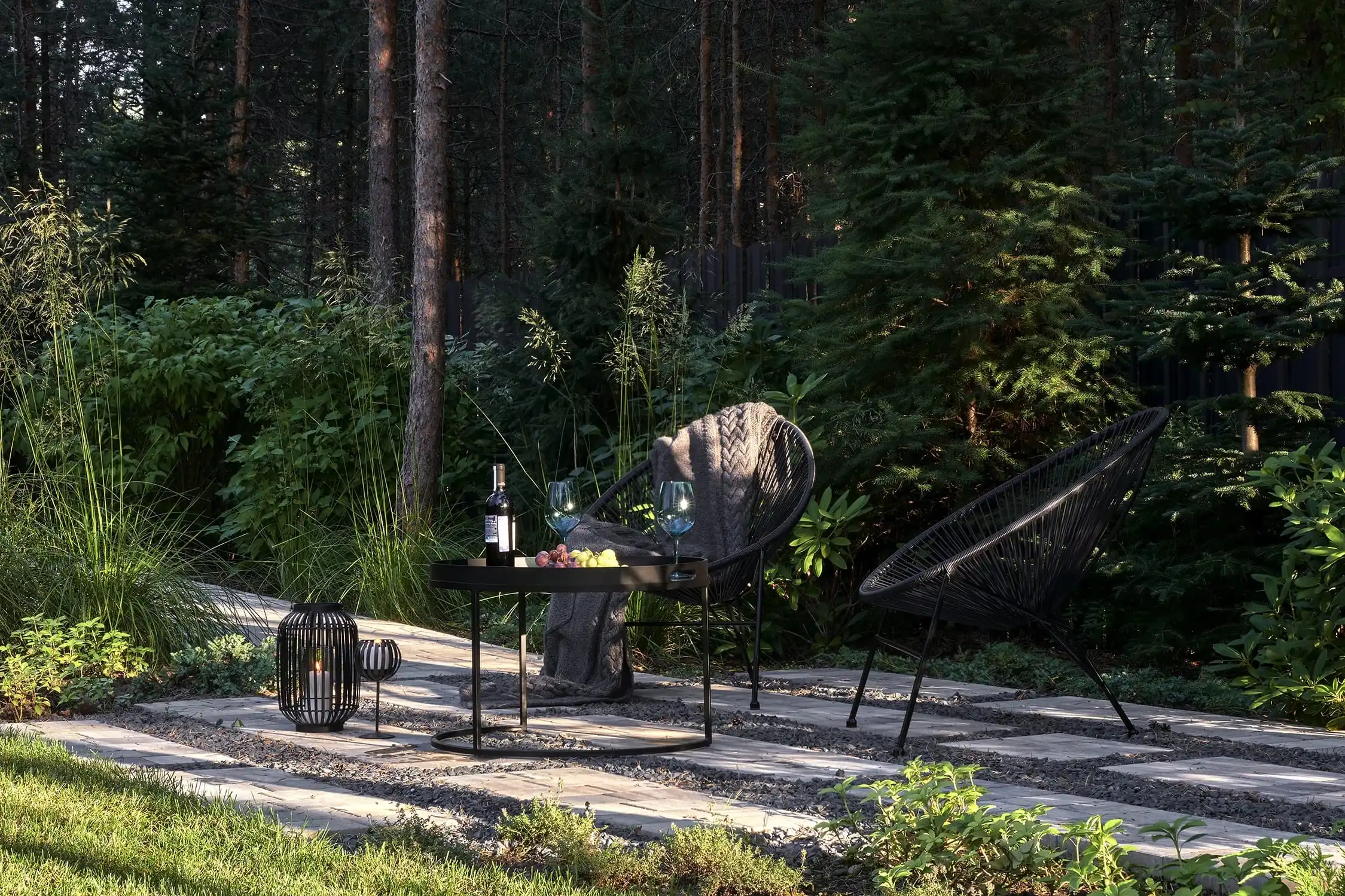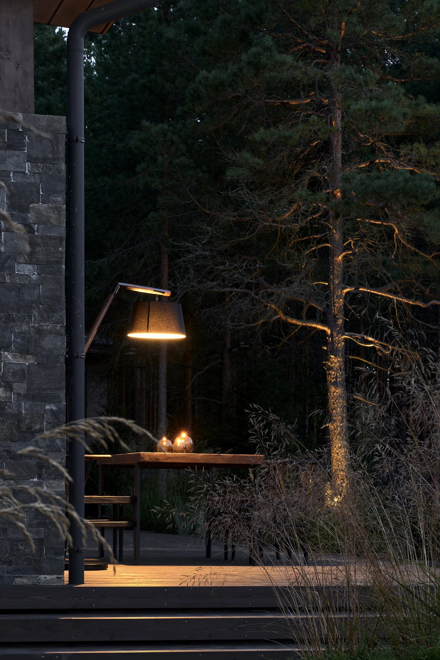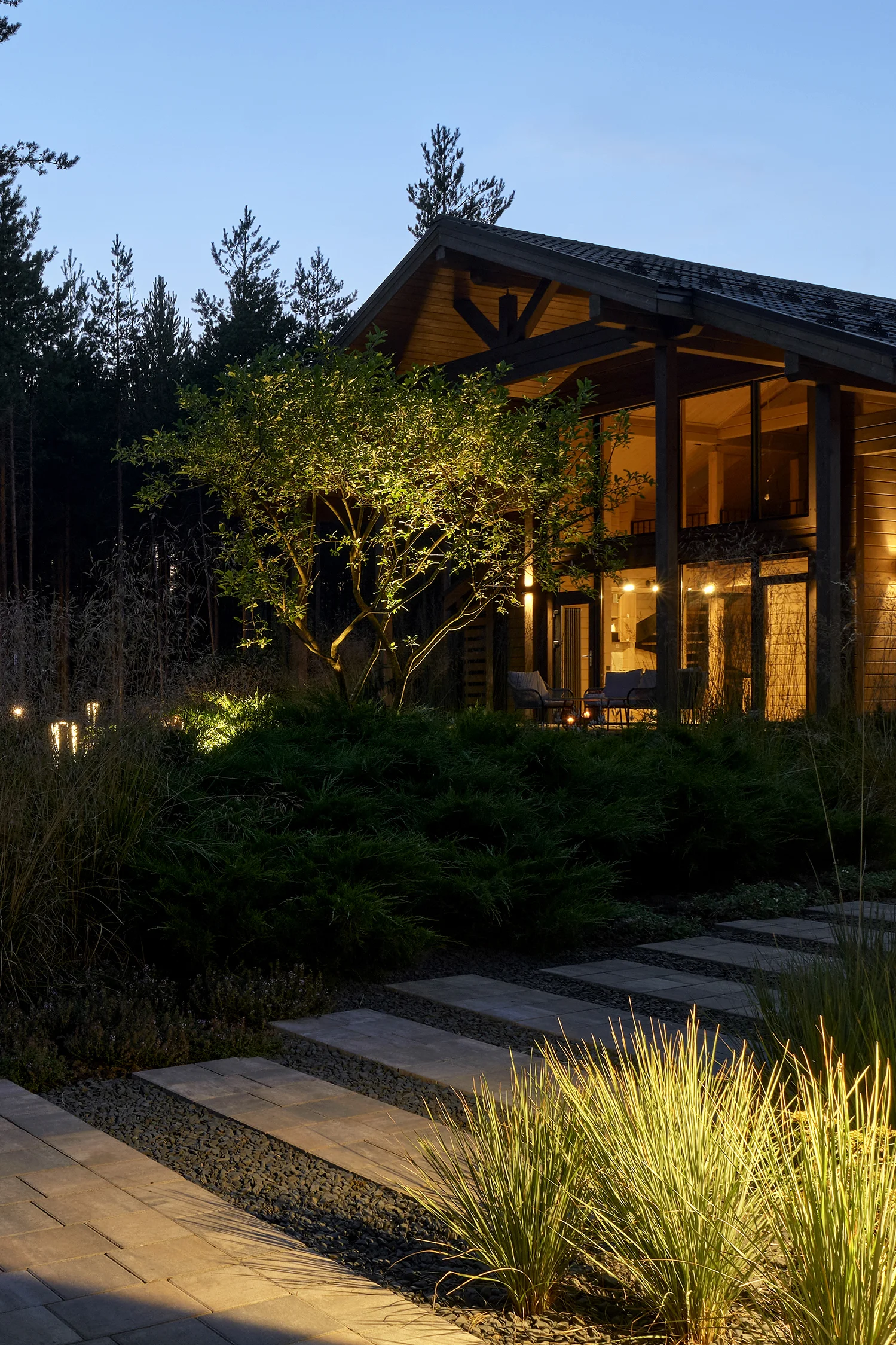 Die Geometrie der großen Wiese wurde von den Auftraggebern bestimmt – ihre Parameter entsprechen einem professionellen Badmintonplatz. In dieser sonnigen Zone fühlen sich auch die Liegestühle für die Sieger wohl, wenn das Match gespielt ist. Und danach können sich die Spieler auf ihre Häuser verteilen, die diskret voneinander durch einen Hügel mit karelischen Steinen, Gräsern und Kiefern in der Mitte verborgen werden.