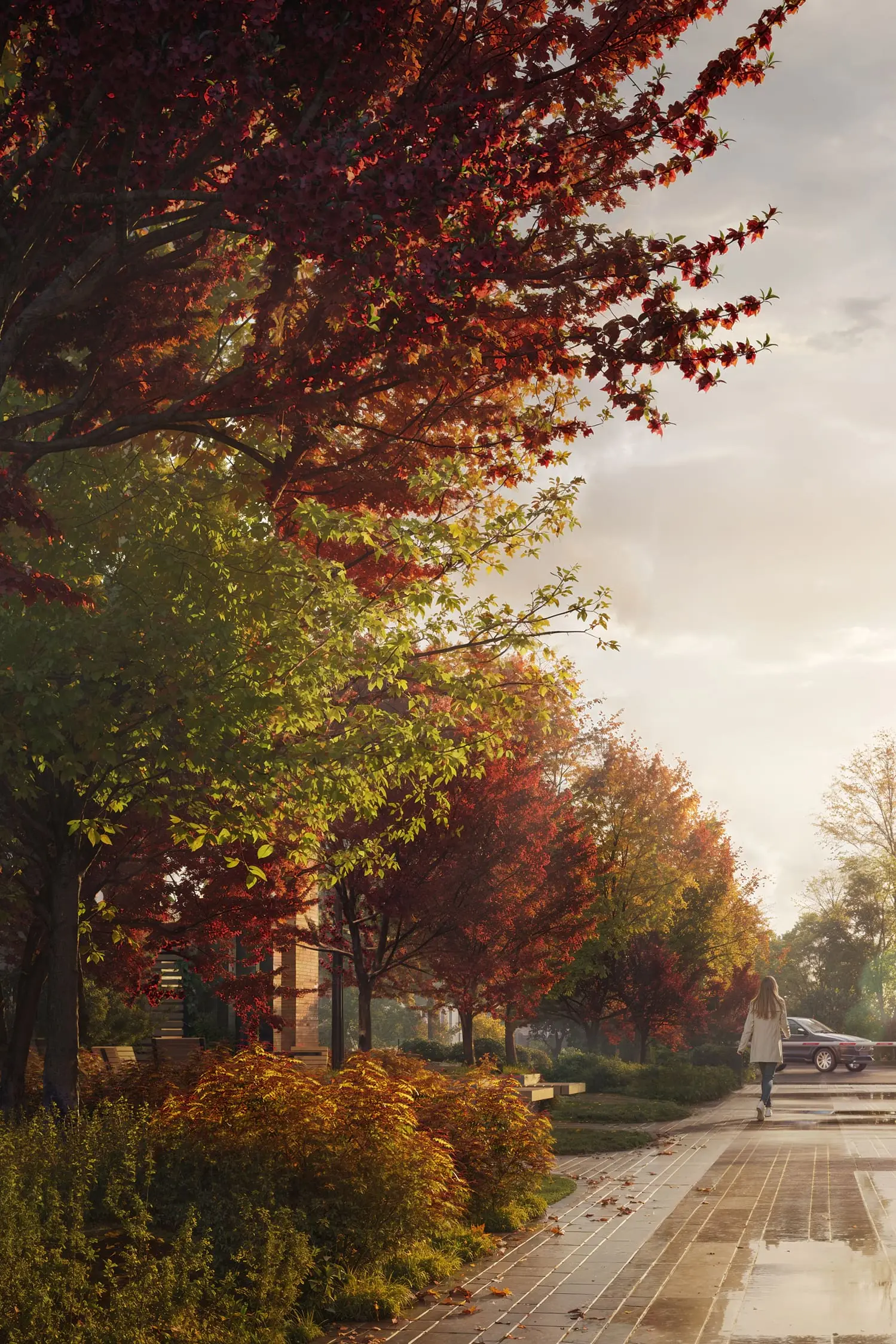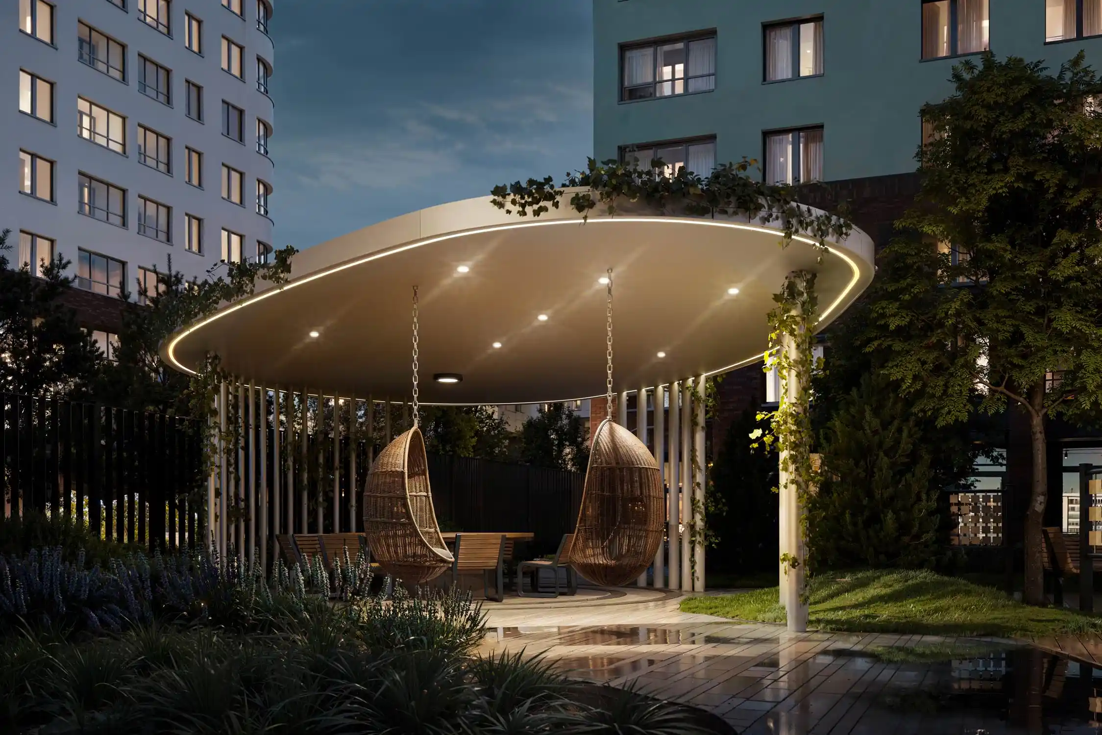 Das Prinzip der Permeabilität ist hier zum Schlüssel geworden. Wir haben die Landschaftsgestaltung in architektonische Strukturen auf der Ebene des ersten und zweiten Stockwerks integriert. Sie haben Metallvordächer in Form von Linien aufgestellt, die die breiten Kronen von Nadel- und Laubbäumen durchdringen und einen “Spinneneffekt” erzeugen. Dies verstärkt das Gefühl eines natürlichen, “atmenden” Raumes, gibt ein Gefühl der Sicherheit und ermöglicht es einer Person, sich nicht in der Nähe von Gebäuden mit hohen Etagen zu verlieren, sondern einen harmonischen Zustand zu spüren.