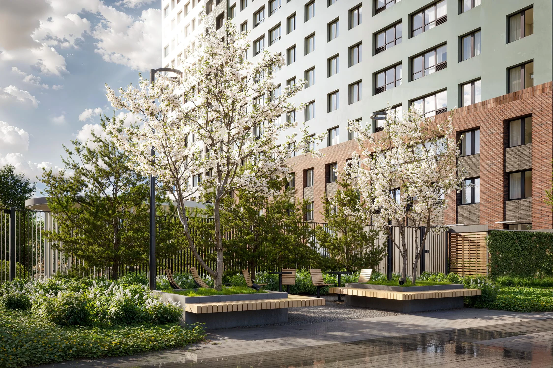 Besonderes Augenmerk wurde auf Obstbäume gelegt. Ihre Schlüsselrolle ist nicht die Ernte, sondern die Ästhetik: dekorative Obstkulturen mit verlängerter Blüte. Sie blühen länger und heller als normale Arten und schaffen spektakuläre visuelle und aromatische Akzente. Obwohl die Blütezeit relativ kurz ist, spielt sie eine wichtige Rolle — bringt die Bewohner der Natur näher, erinnert an saisonale Veränderungen und vermittelt ein Gefühl für einen lebendigen Raum.