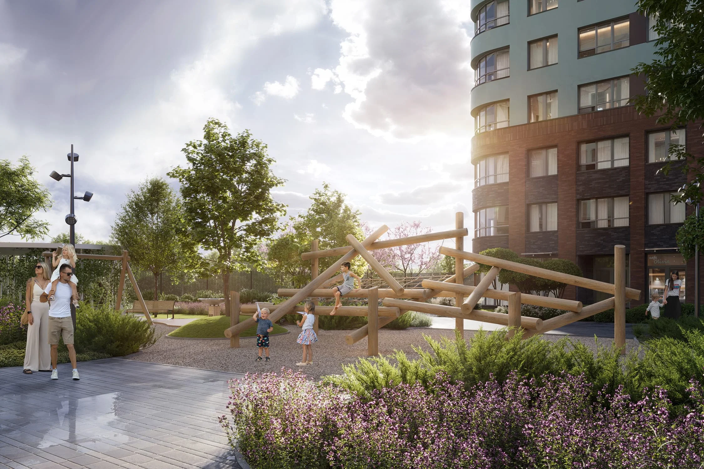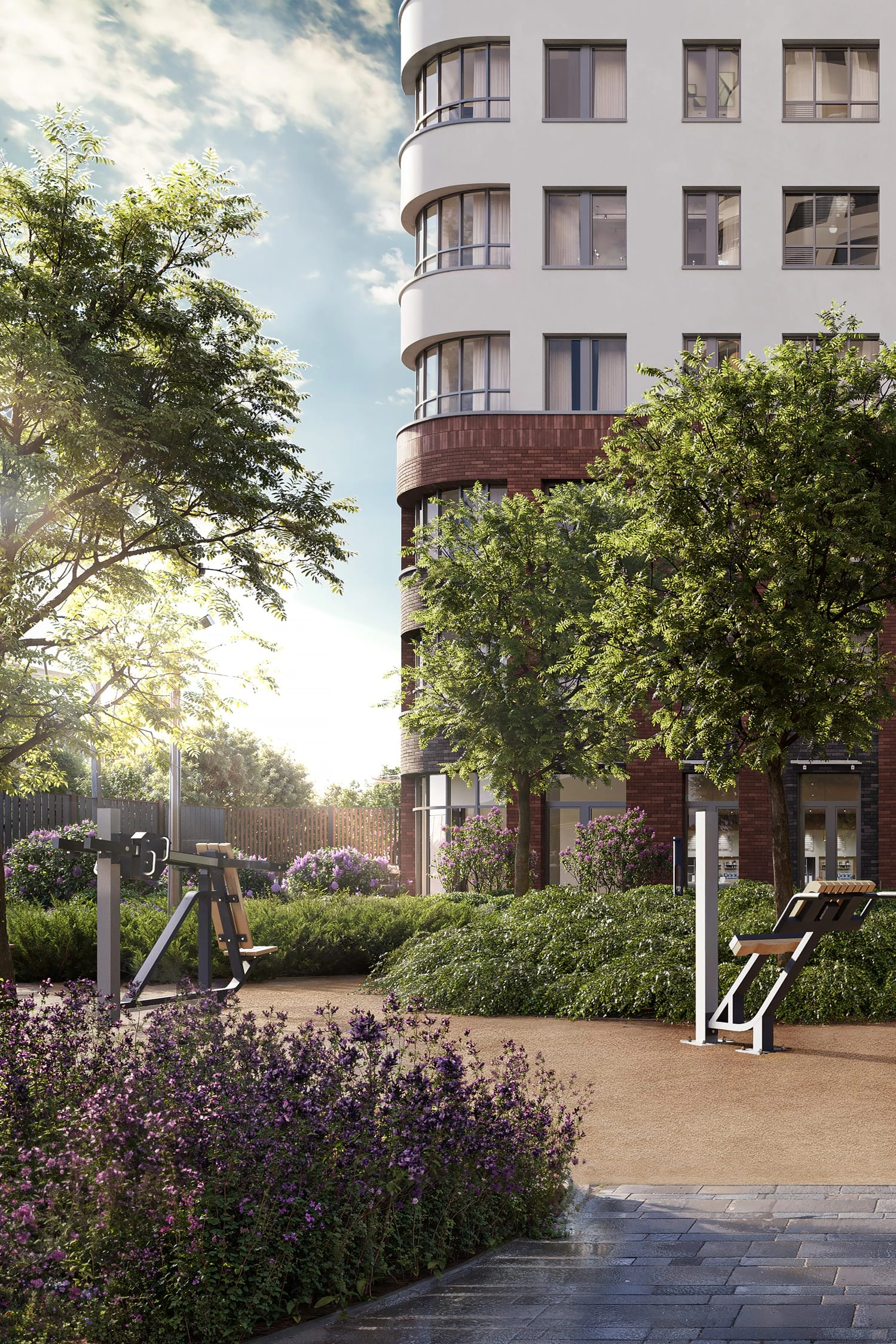 Vielschichtige Landschaft mit grünen Dächern und Obstalleen Die Grundlage des Konzepts war die Lage des Viertels, die einen besonderen Ansatz diktierte — der periphere Teil von St. Petersburg, wo starke Winde und hoher Grundwasserspiegel liegen.