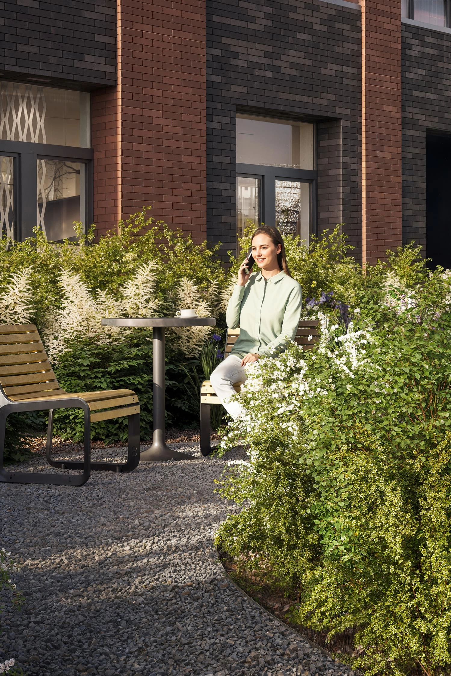 Bei der Arbeit an dem Projekt haben wir versucht, eine Umgebung zu schaffen, die im Laufe der Zeit nicht an Relevanz verliert. Dies bedeutet nicht, helle Akzente aufzugeben, sondern vielmehr ein Gleichgewicht zwischen Zurückhaltung und Ausdruckskraft zu suchen. Zum Beispiel haben wir “auffällige” Blumen vermieden, aber nicht zu Lasten der Vielfalt: Exotische Pflanzen werden mit natürlichen Materialien kombiniert, wie zum Beispiel Terrassenbretter, die in Landschaftsbereichen verwendet werden. Diese “grünen Inseln” teilen nicht nur Funktionsbereiche (Sport, Kinder), sondern bilden auch eine harmonische Landschaft.