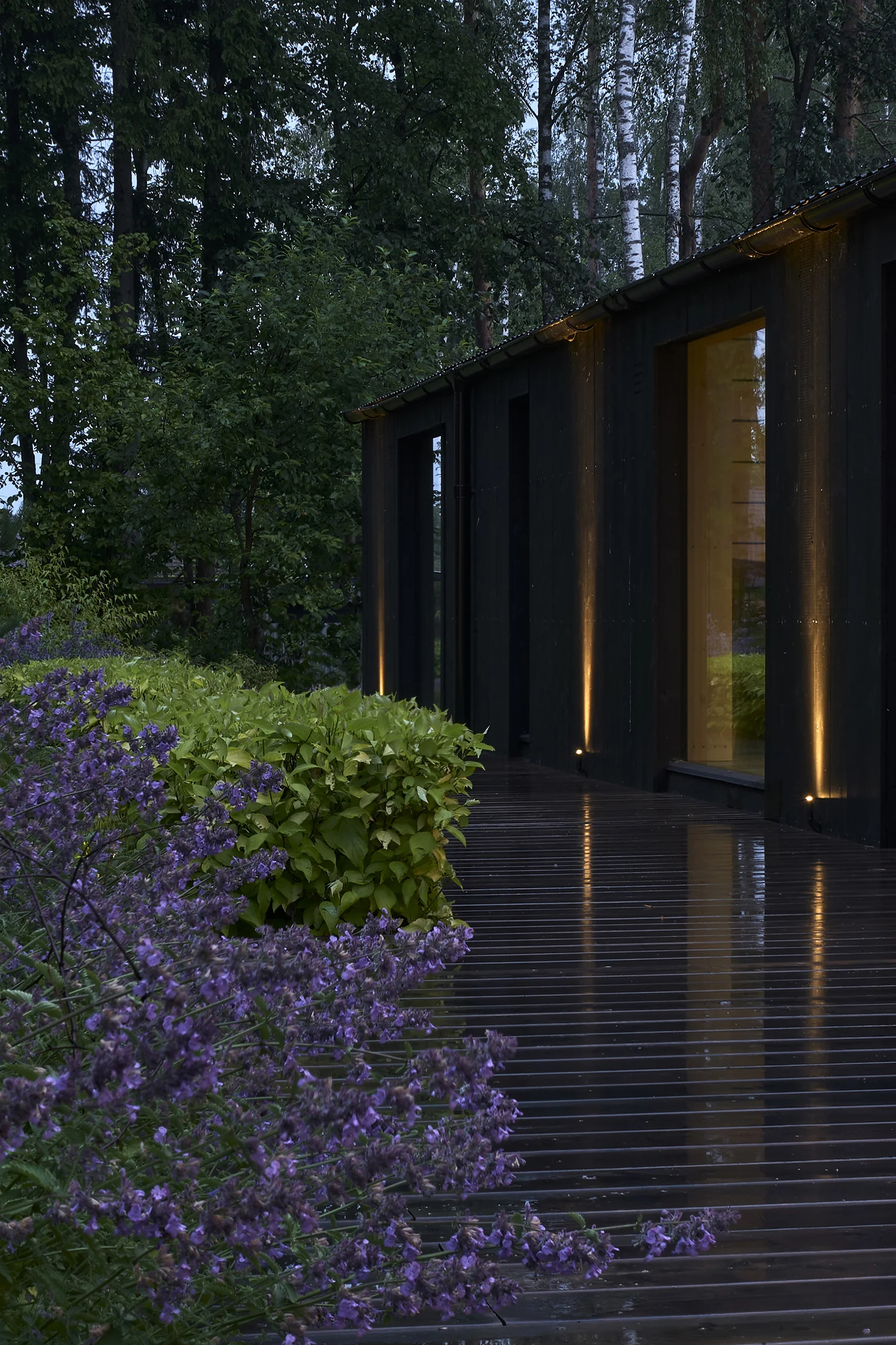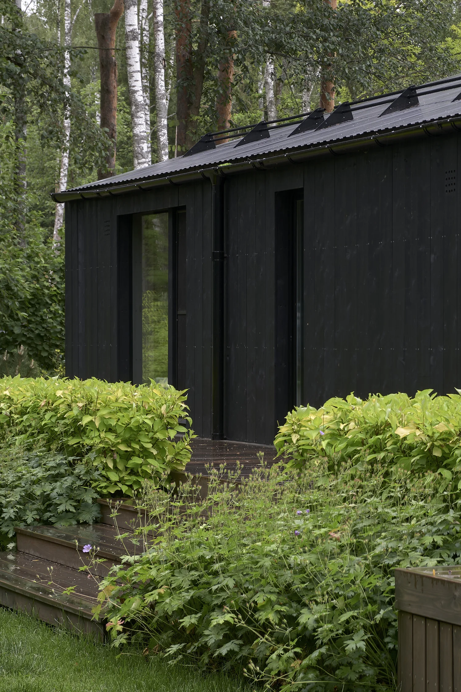 Wherever the house masters and their guests settle to unwind, they are surrounded by dense flower beds with flowing shapes that soothe the eye with a cool palette of greens and purples. All those keeping with the best traditions of the Scandinavian garden (with a capital letter). Naturally, as it should, a path emerges from the shadows in the woods into the light, leading to a little field that extends beyond the garden.