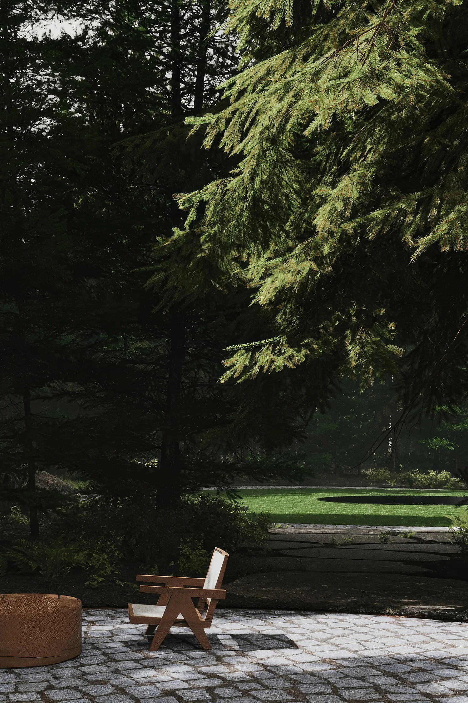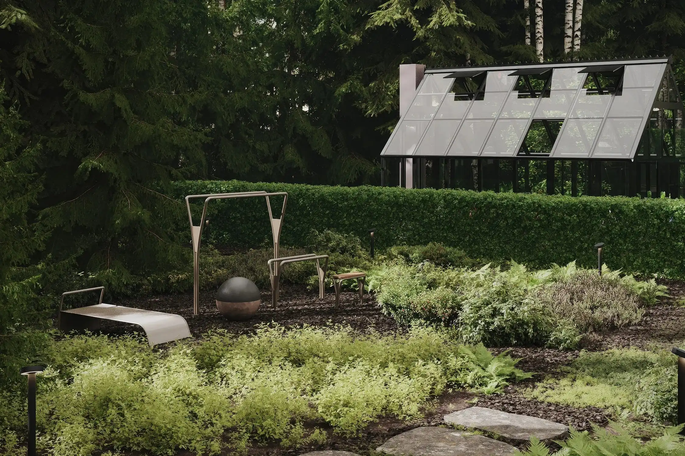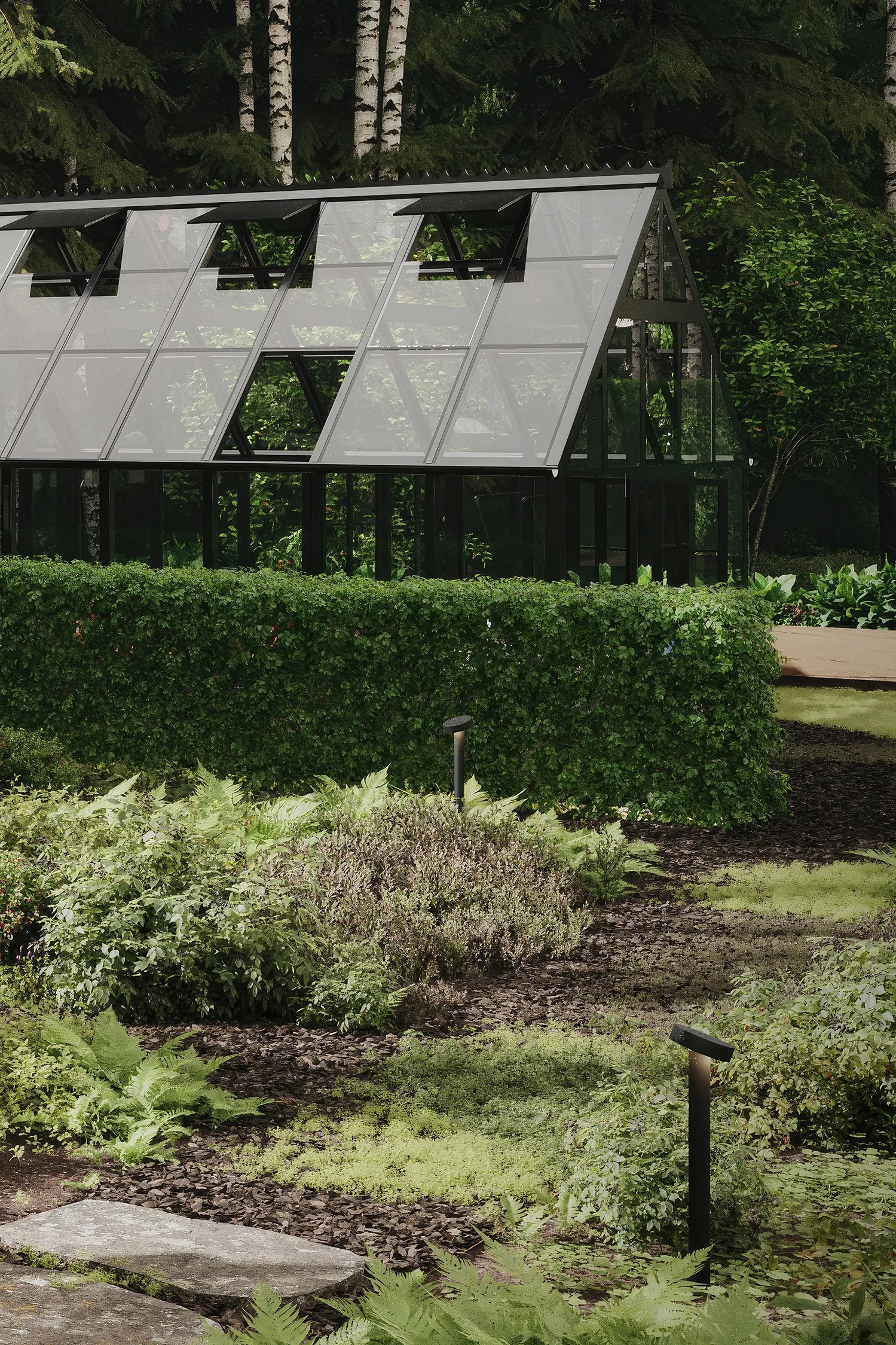 The garden gains its sacredness from the attention paid by the architect to individual elements. This is precisely the example where details make all the difference. The round pond surrounded by trees resembles a magical spring, transforming the garden into a place for reflection and solitude, and harvest into a ritual. A stylized aqueduct distributes the flows and sounds of water throughout the territory, reminiscent of the turbulent icy rivers of the local mountains. Even the children's playhouse and playground look almost primitive — made of charred and «weathered» wood.