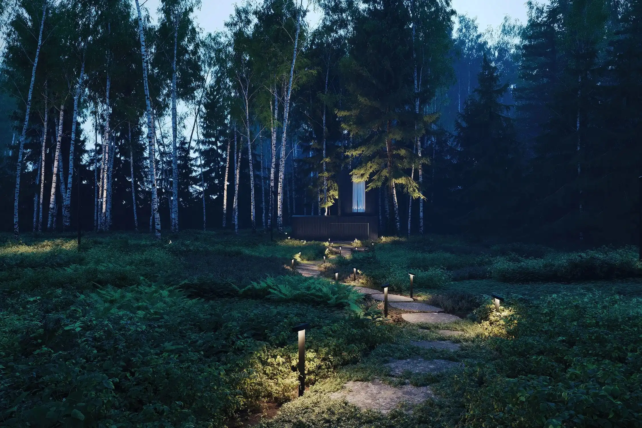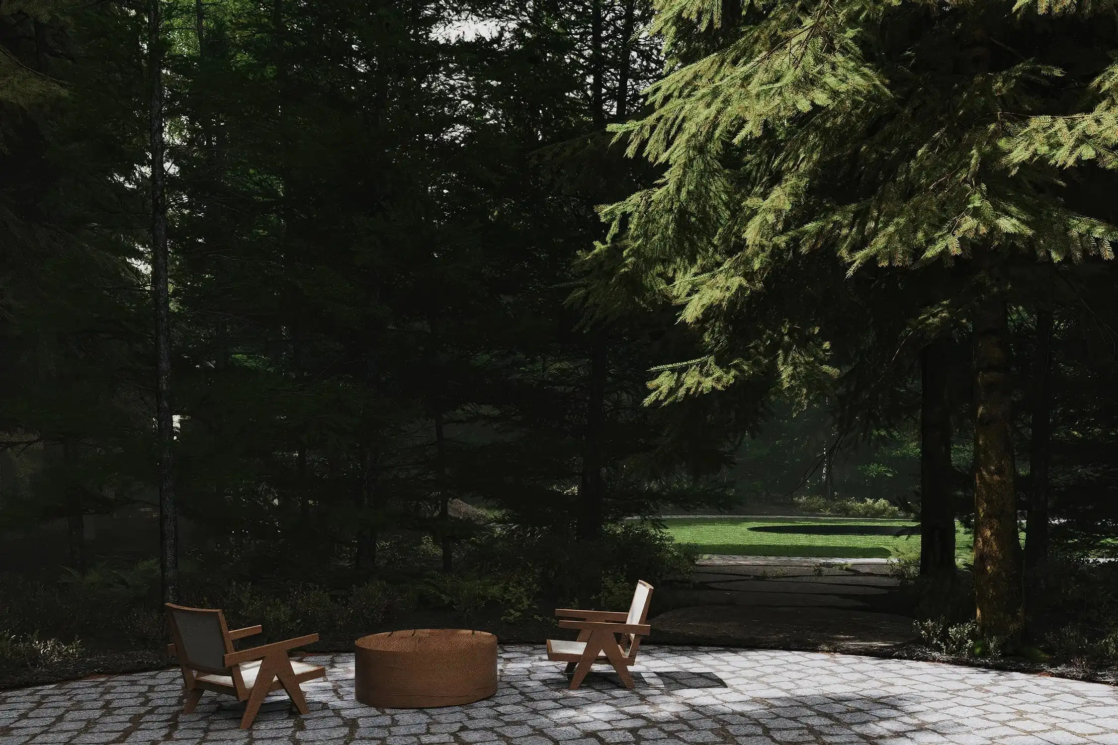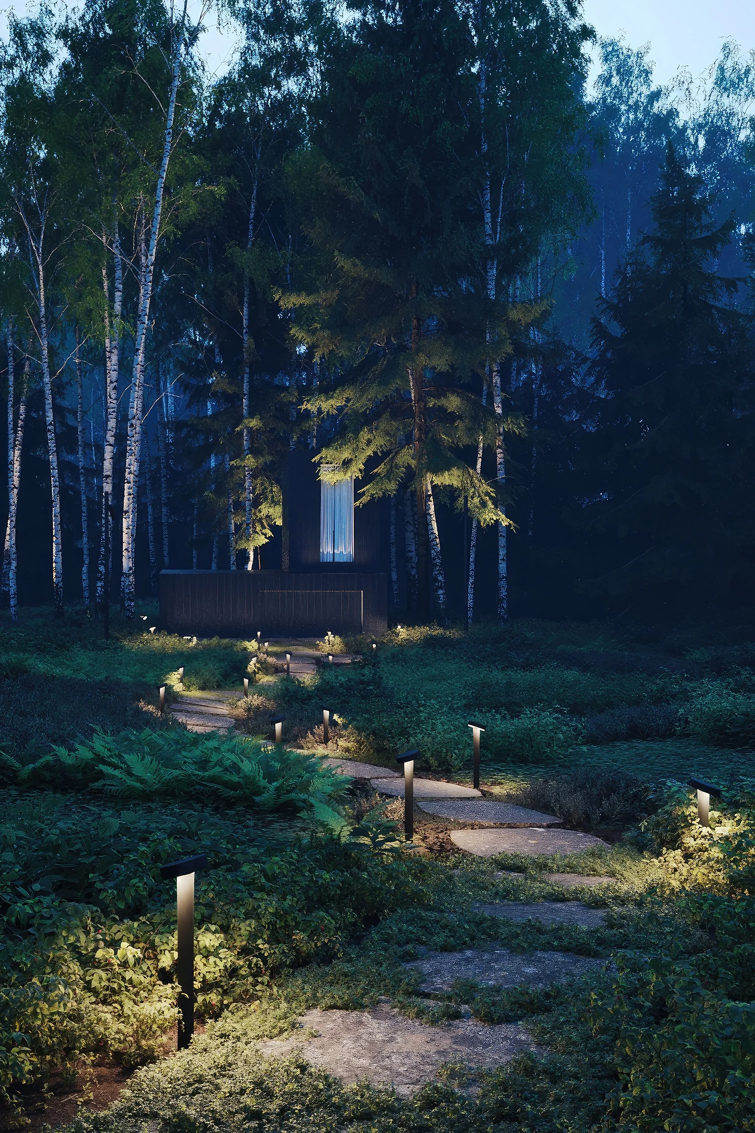 The garden gains its sacredness from the attention paid by the architect to individual elements. This is precisely the example where details make all the difference. The round pond surrounded by trees resembles a magical spring, transforming the garden into a place for reflection and solitude, and harvest into a ritual. A stylized aqueduct distributes the flows and sounds of water throughout the territory, reminiscent of the turbulent icy rivers of the local mountains. Even the children's playhouse and playground look almost primitive — made of charred and «weathered» wood.