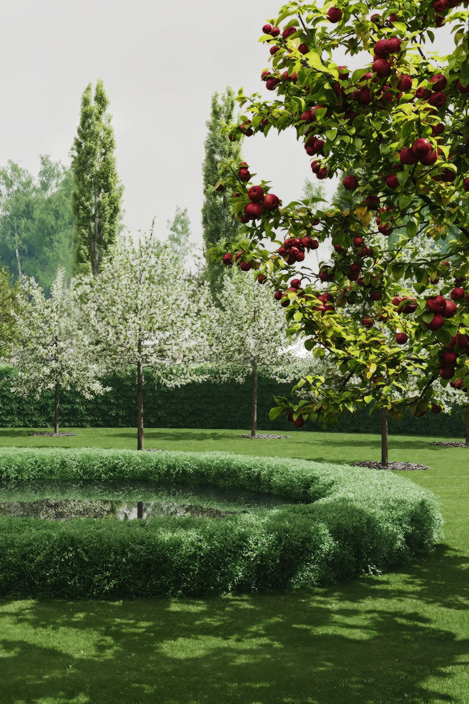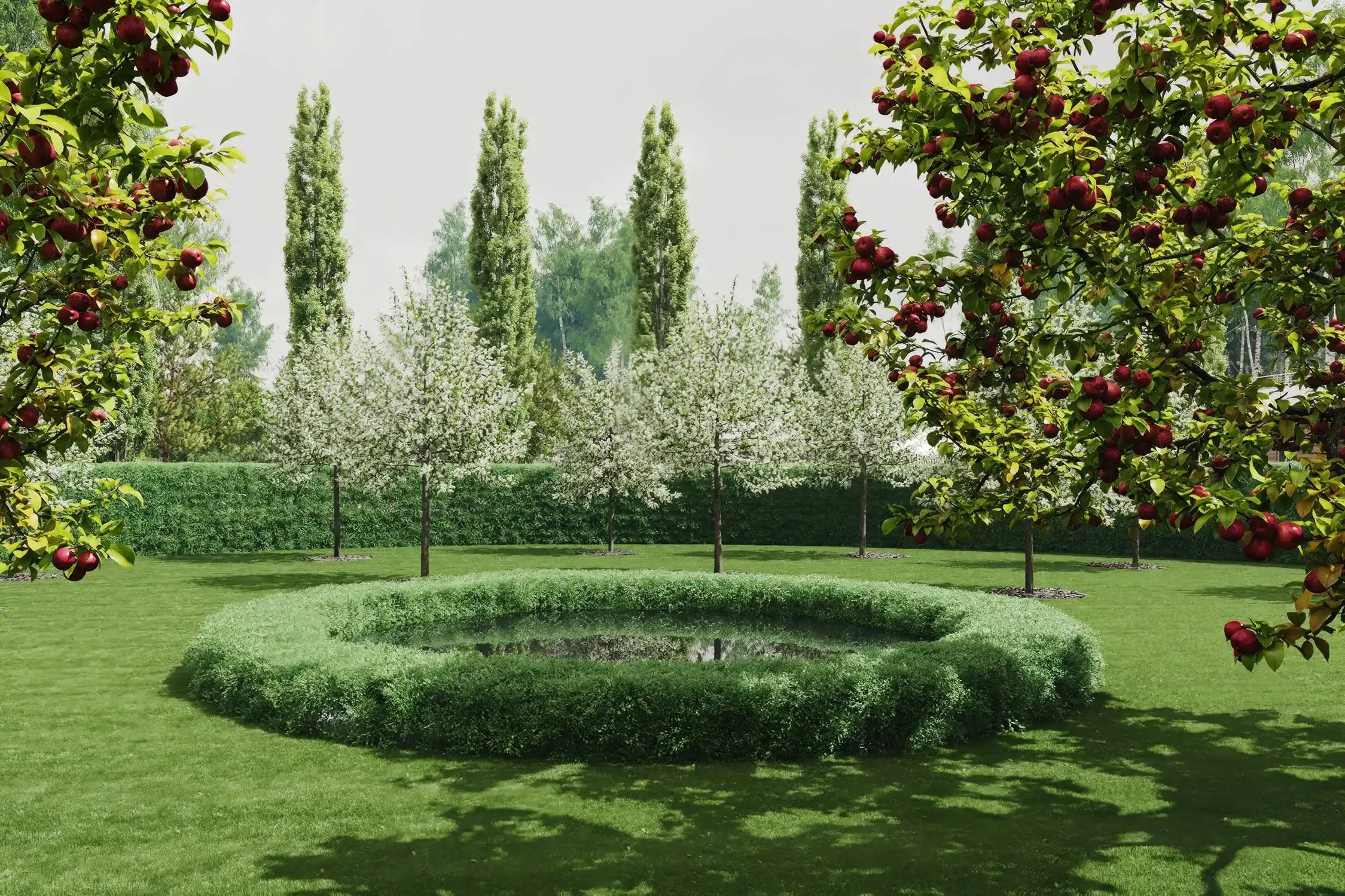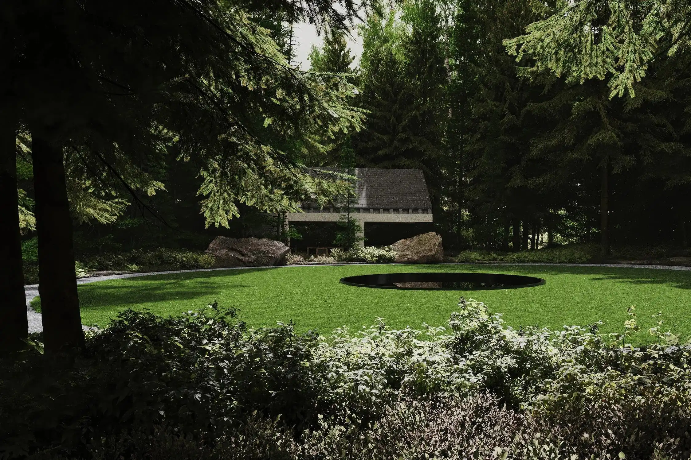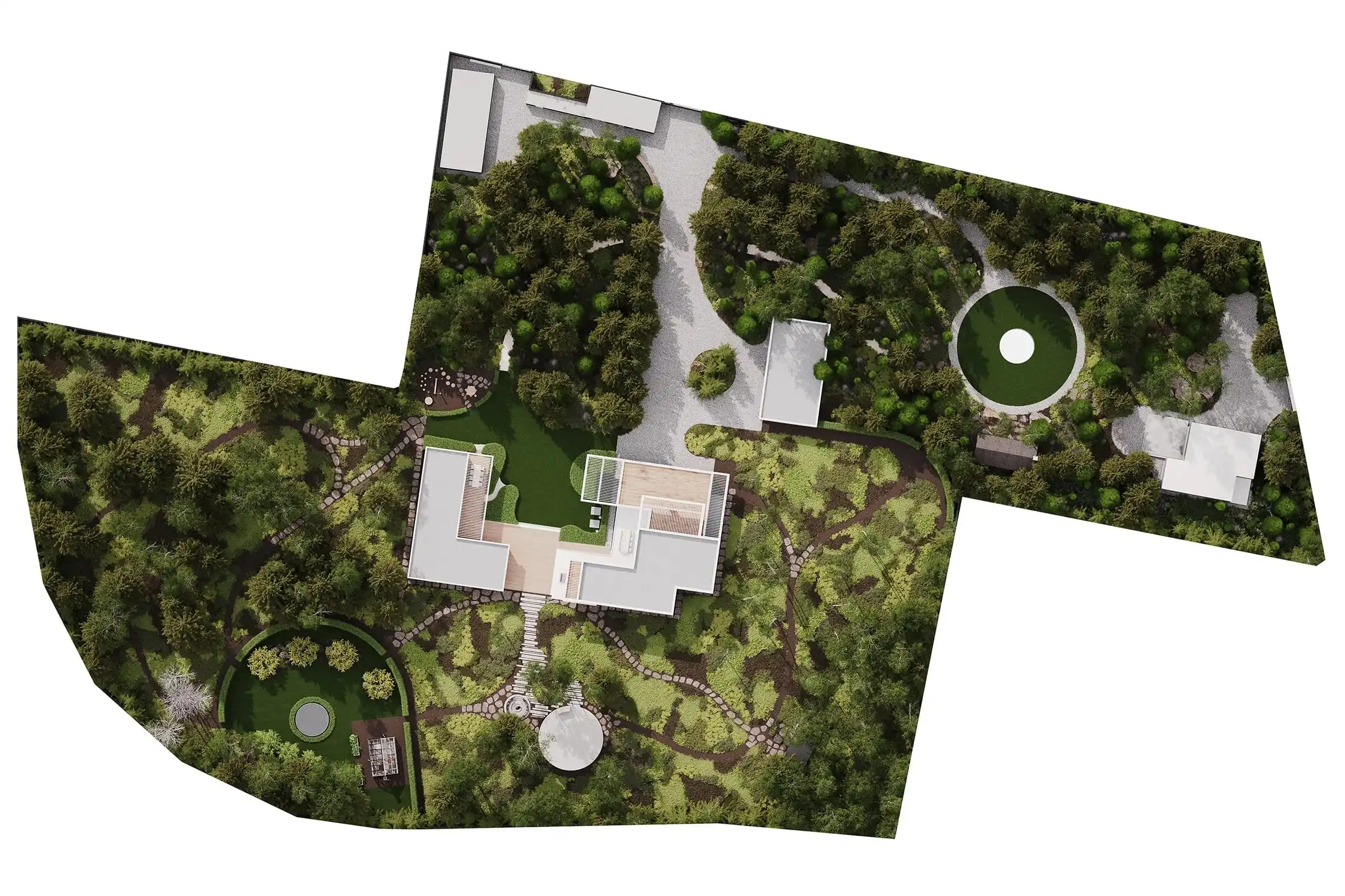 We used circles in almost all elements of the landscaping: the geometry of the fruit garden and its pond, the shape of the hill and lawns in the private areas between the owners' house and the guest house. The soft lines softened the overall brutal character of the architecture.