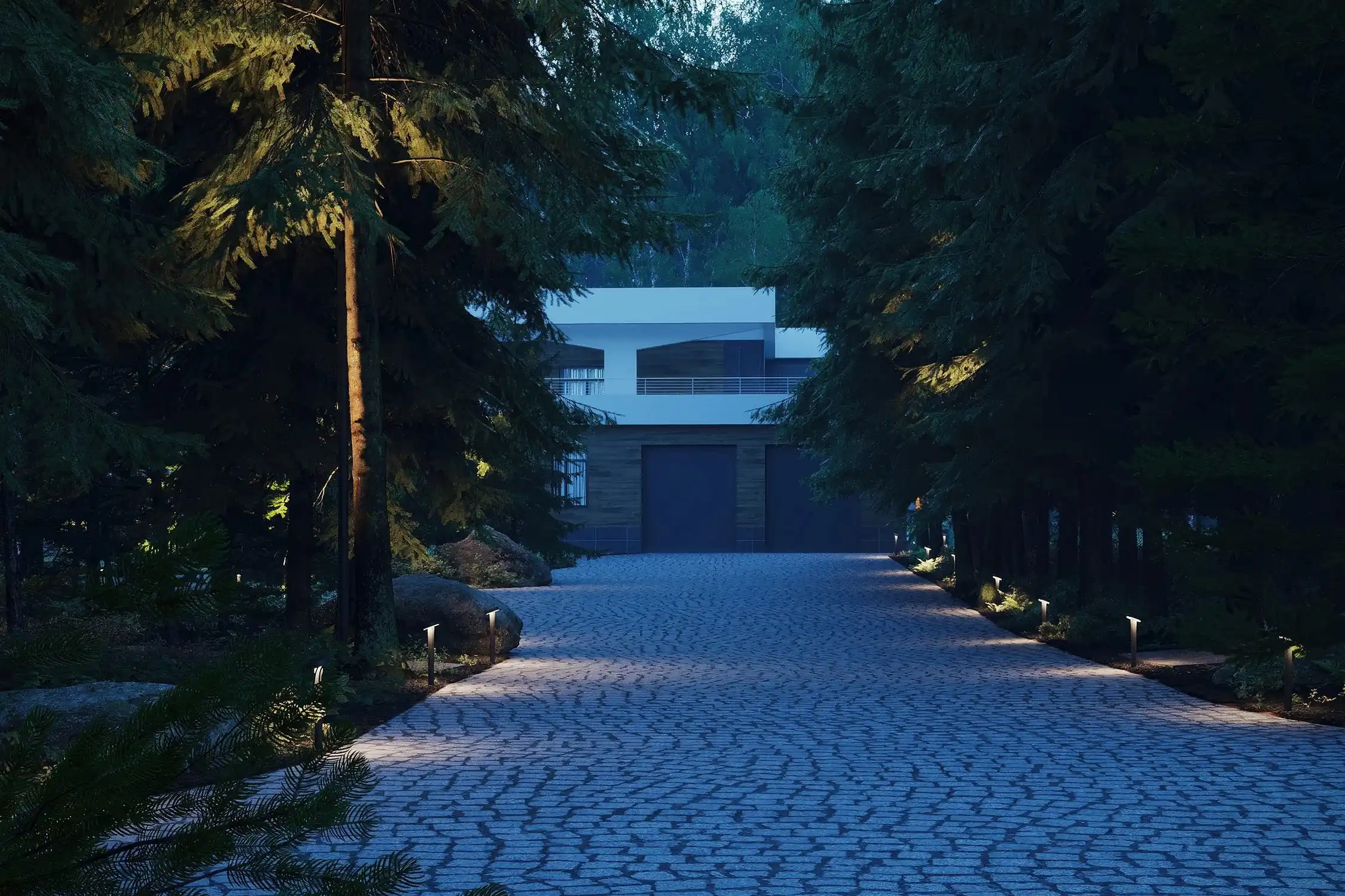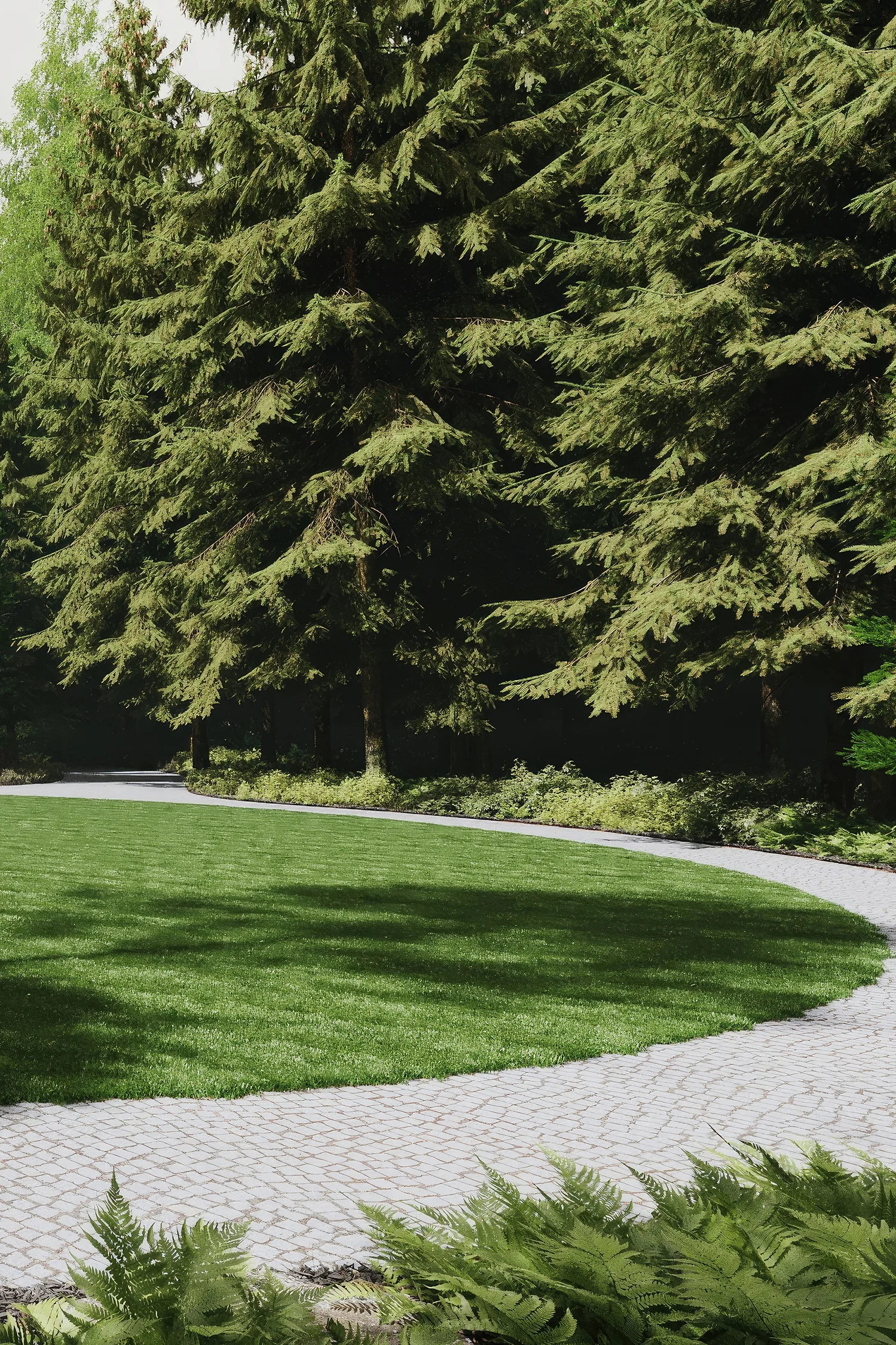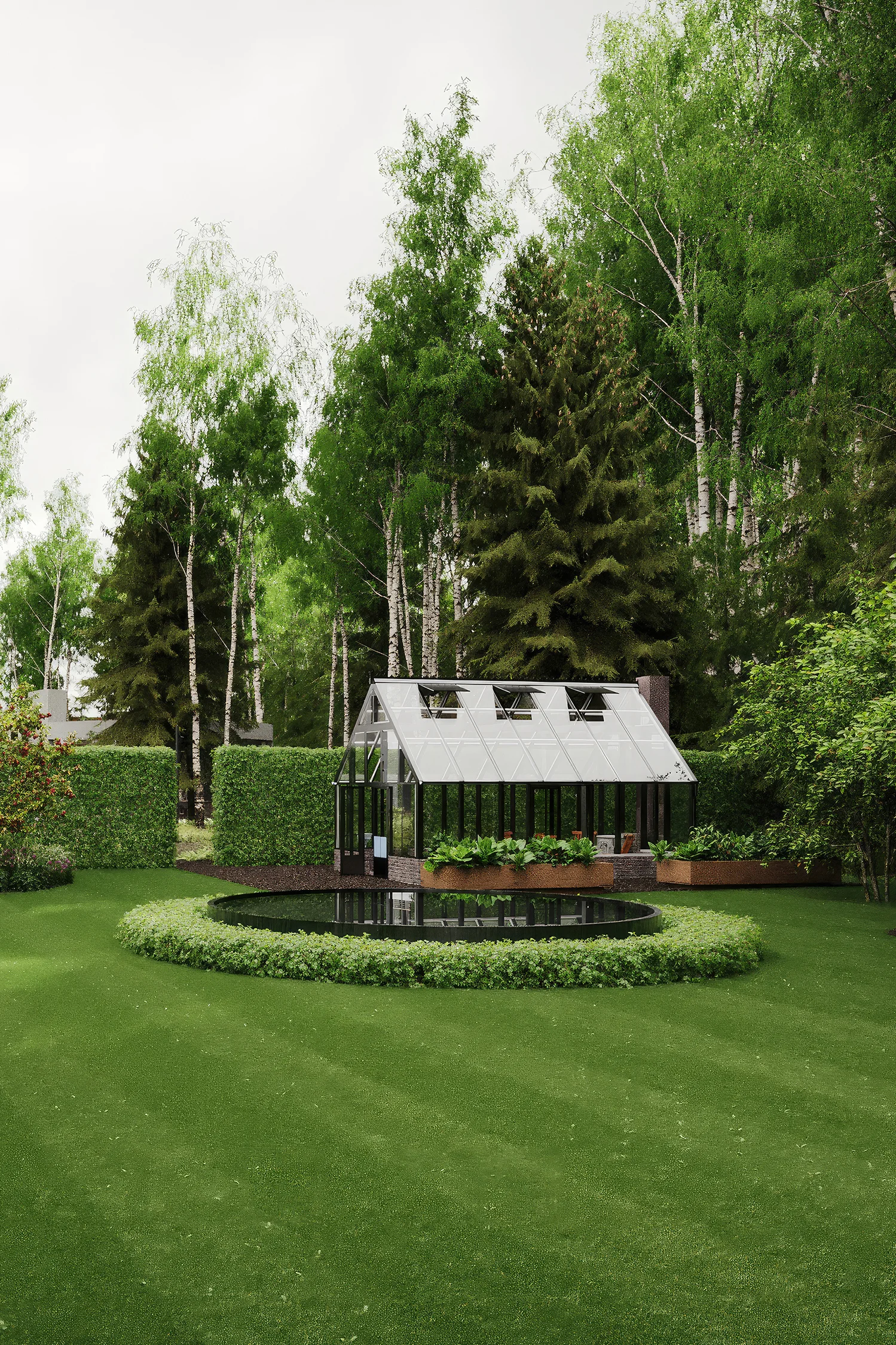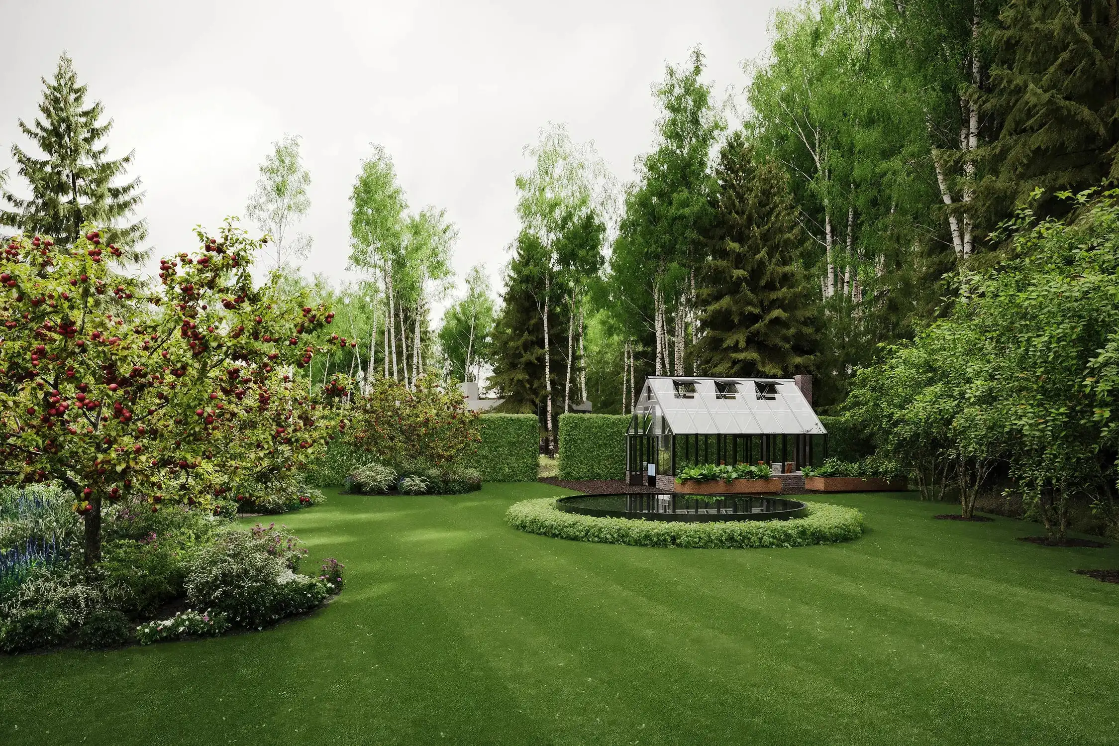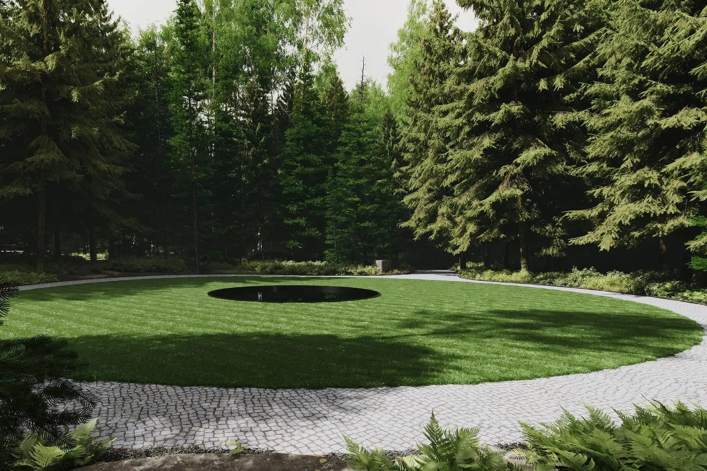 We used circles in almost all elements of the landscaping: the geometry of the fruit garden and its pond, the shape of the hill and lawns in the private areas between the owners' house and the guest house. The soft lines softened the overall brutal character of the architecture.