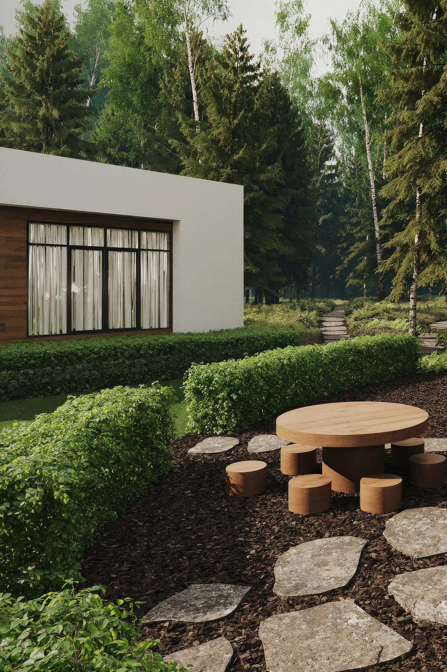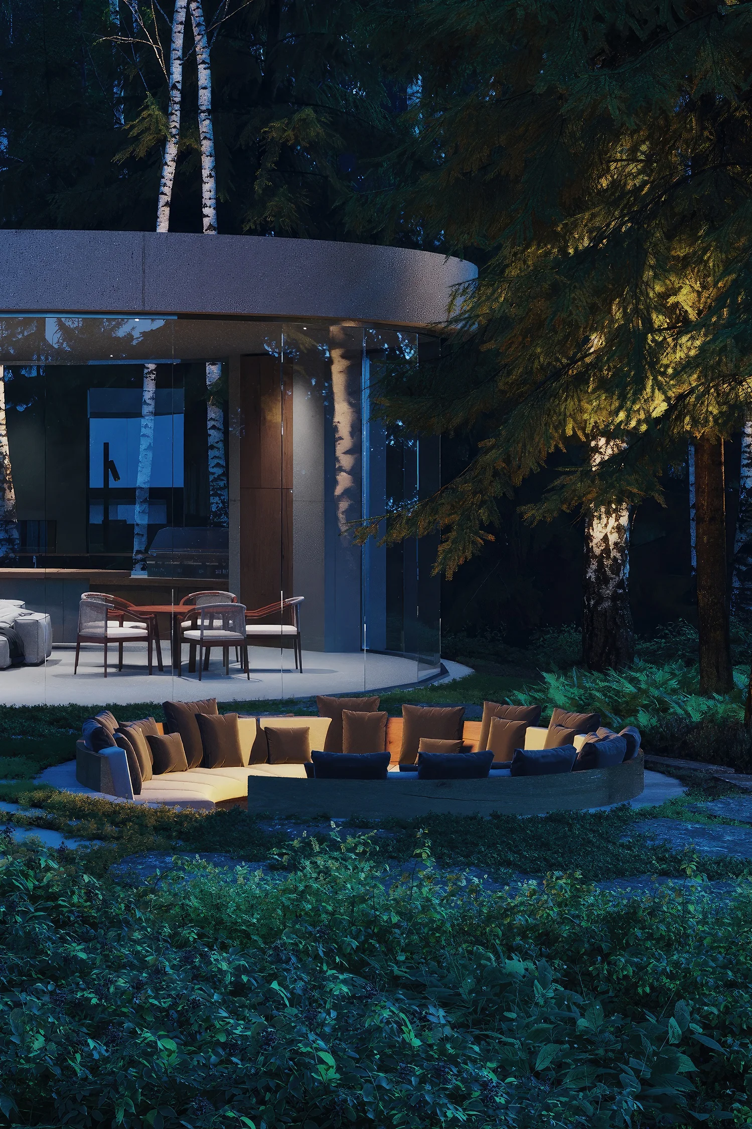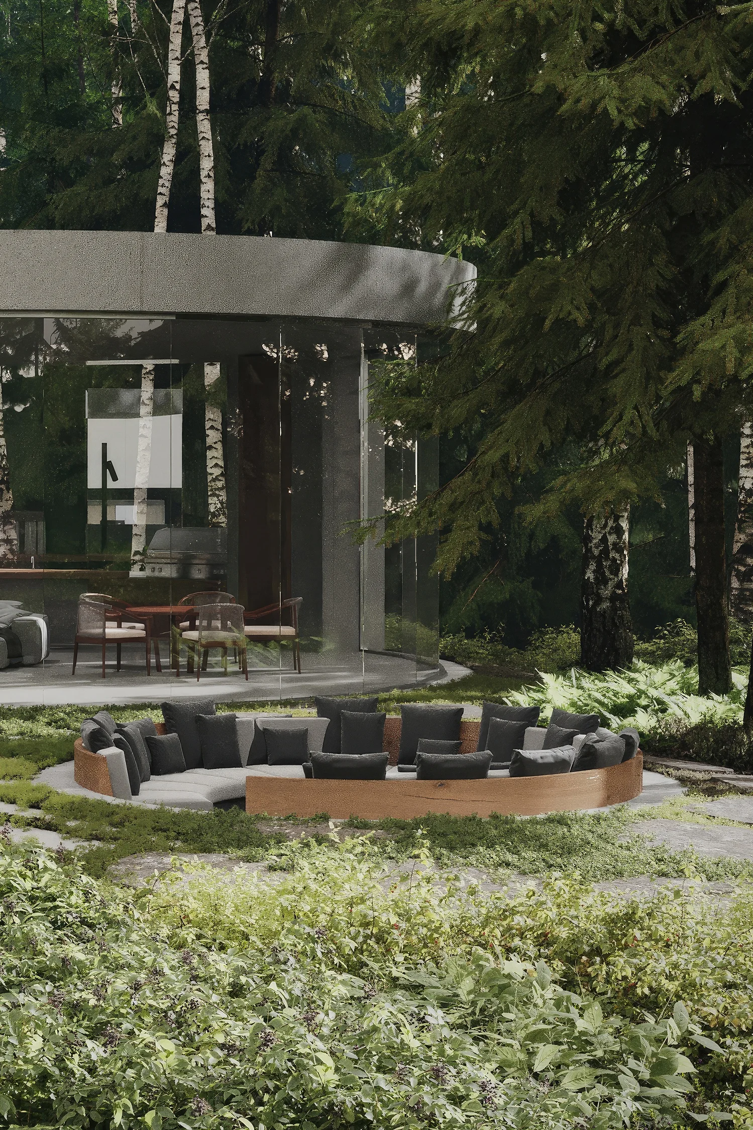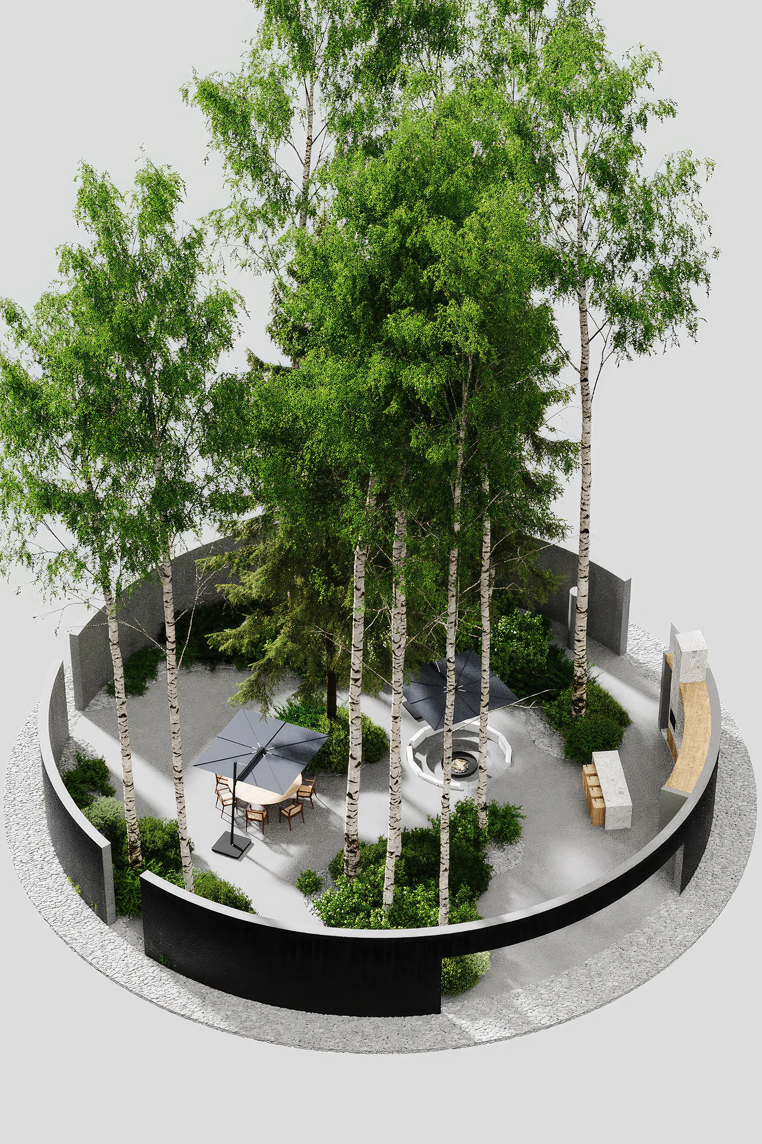 We also enclosed the mini-garden with a summer kitchen in a perfect circle. The result is a kind of refuge that is not visible to garden visitors. Inside, we left tall birch trees and planned three zones: barbecue, fire pit, and dining area.