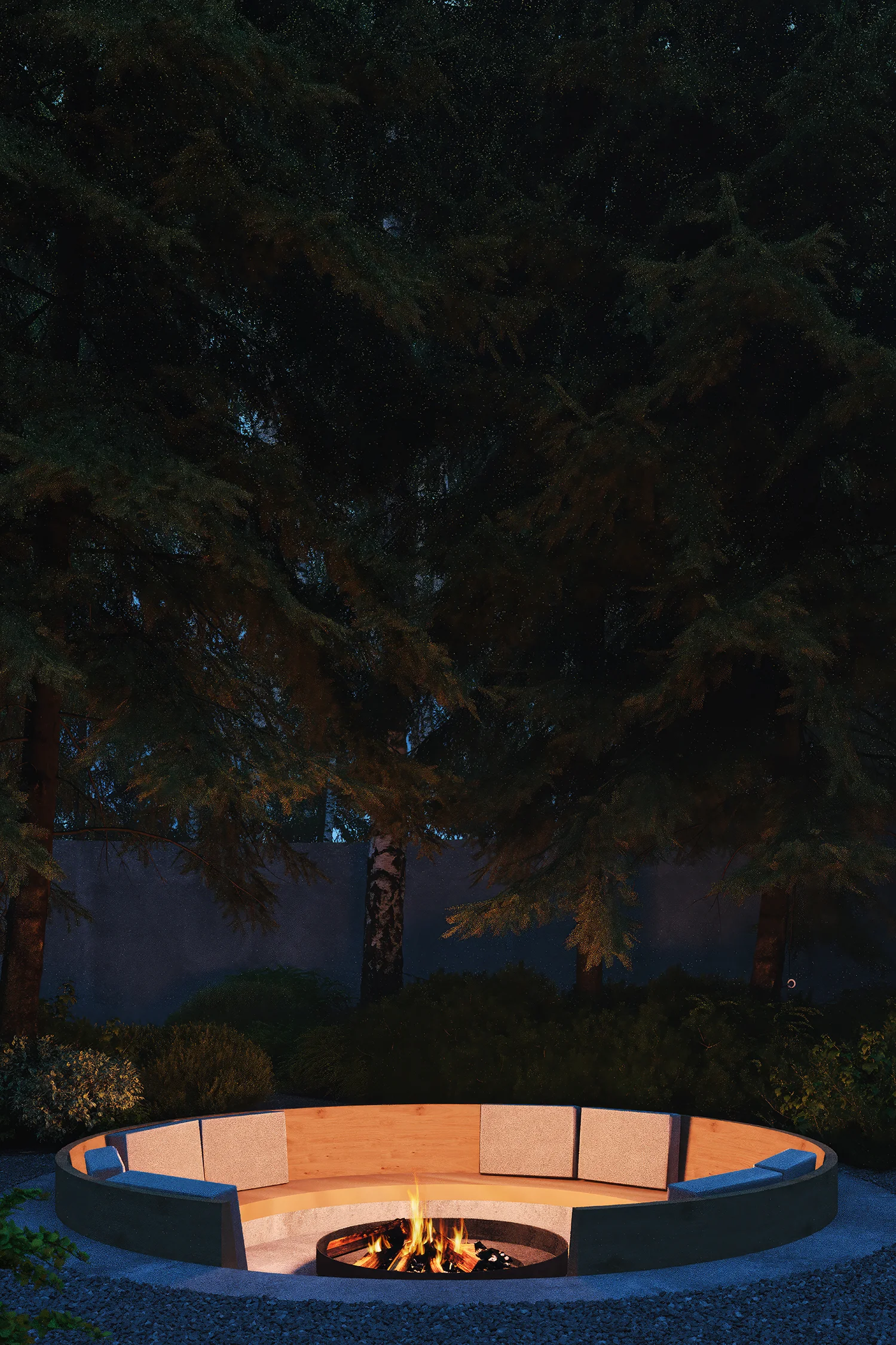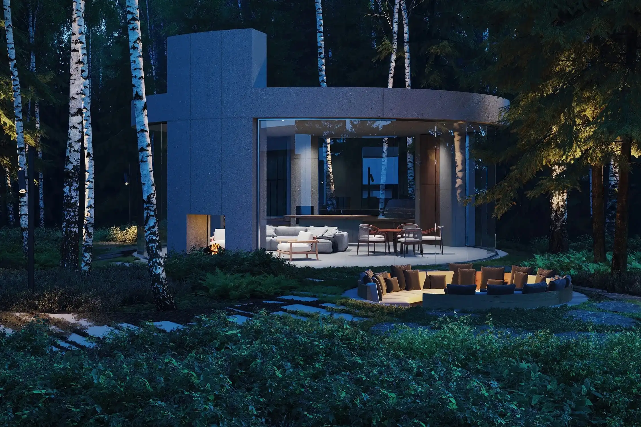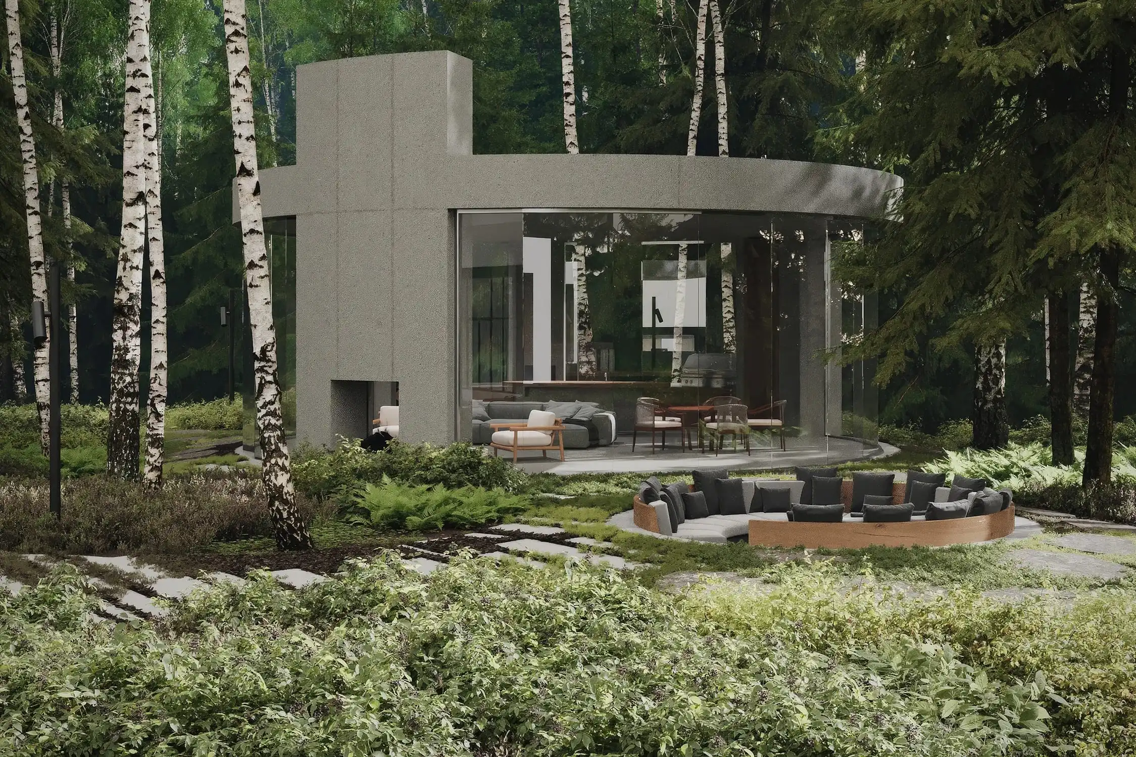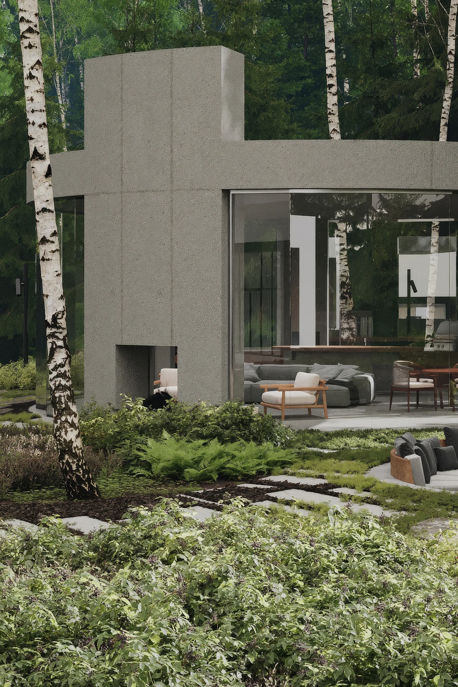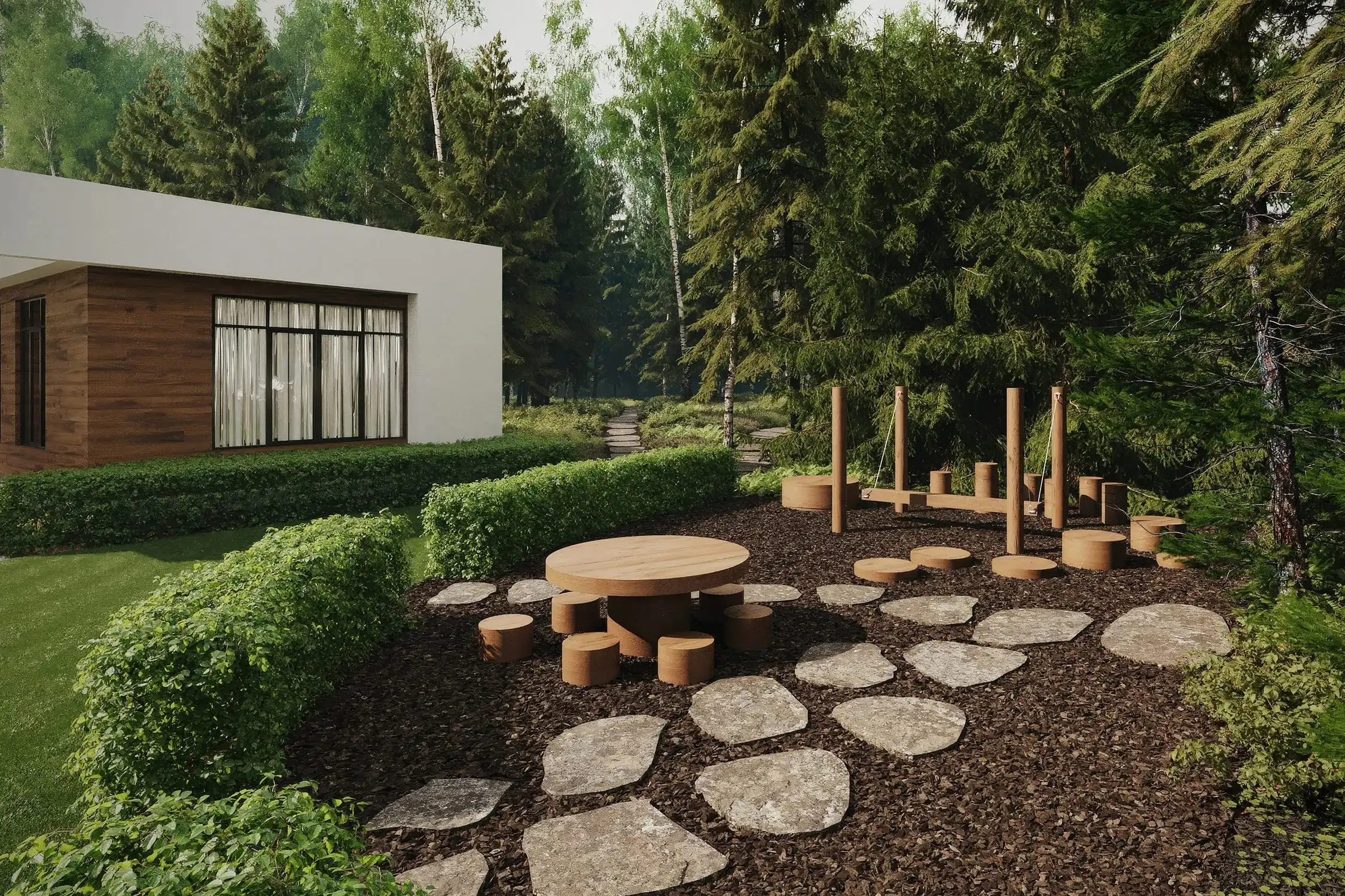 We also enclosed the mini-garden with a summer kitchen in a perfect circle. The result is a kind of refuge that is not visible to garden visitors. Inside, we left tall birch trees and planned three zones: barbecue, fire pit, and dining area.
