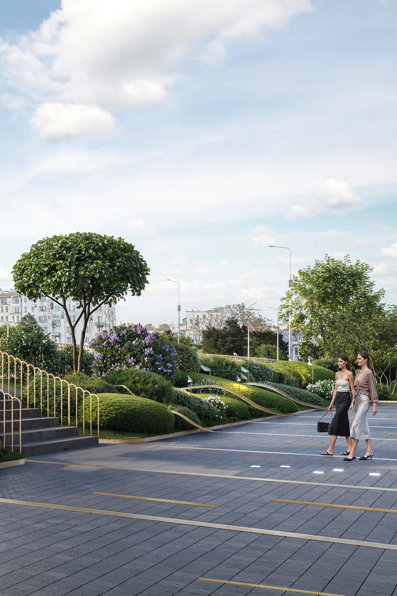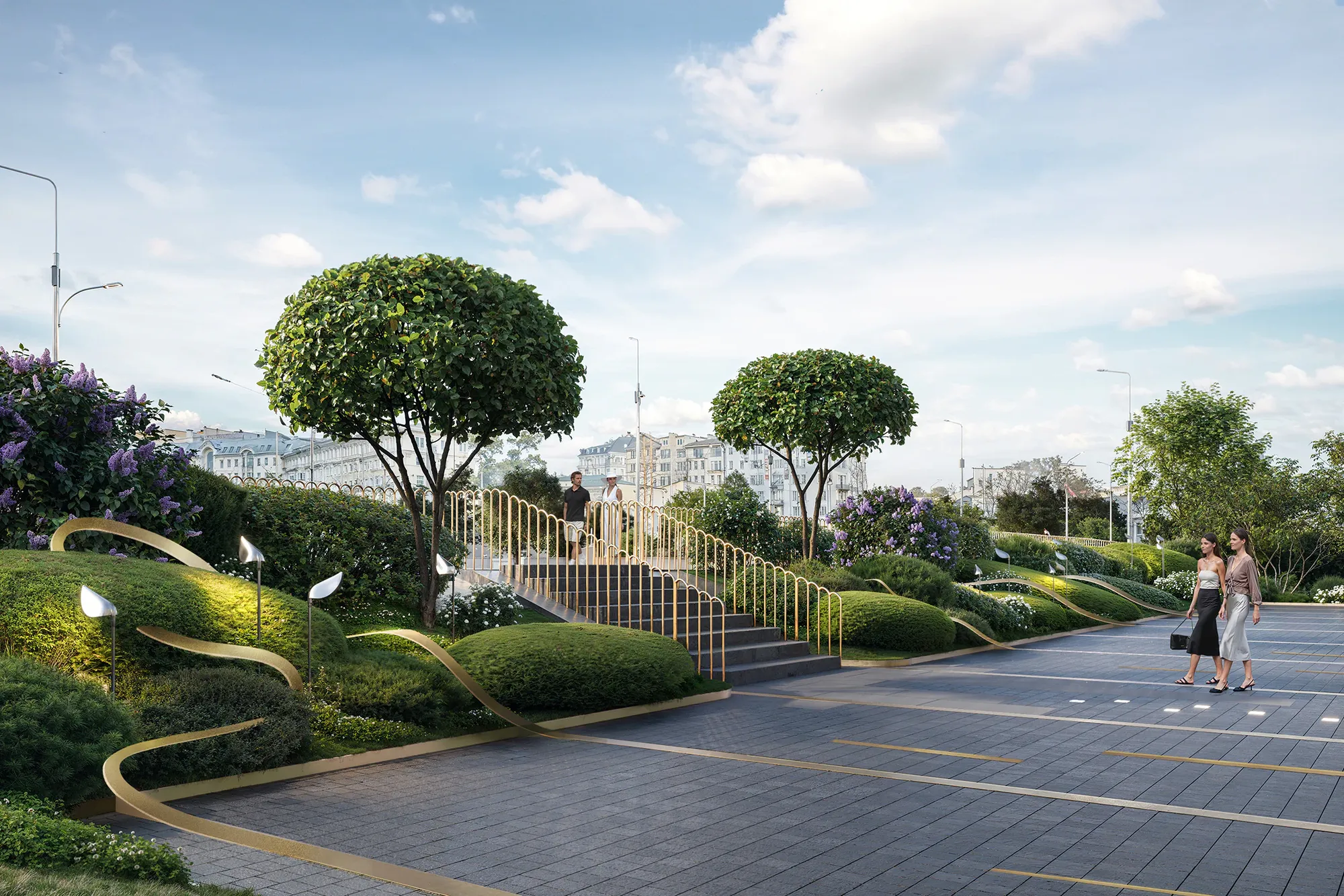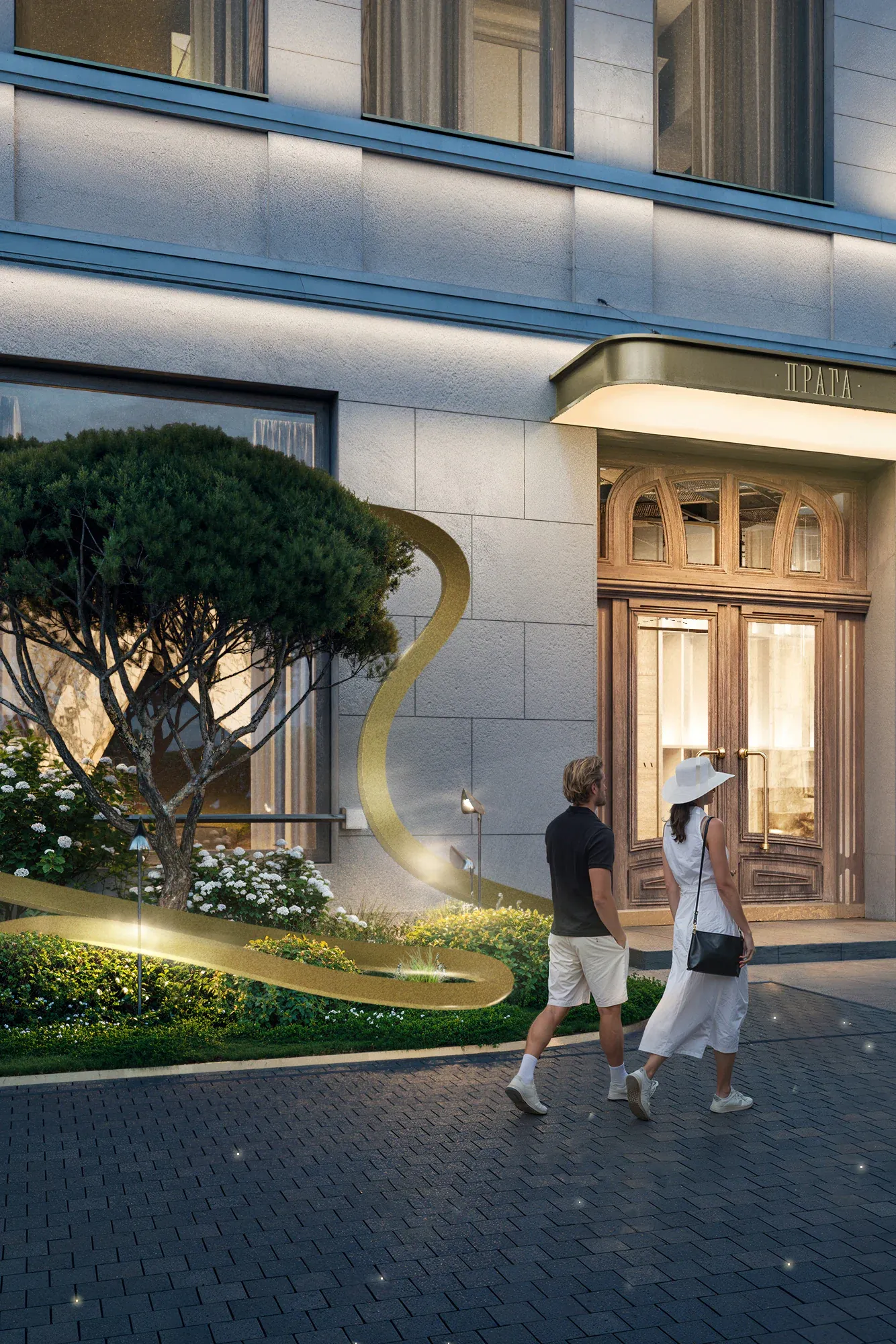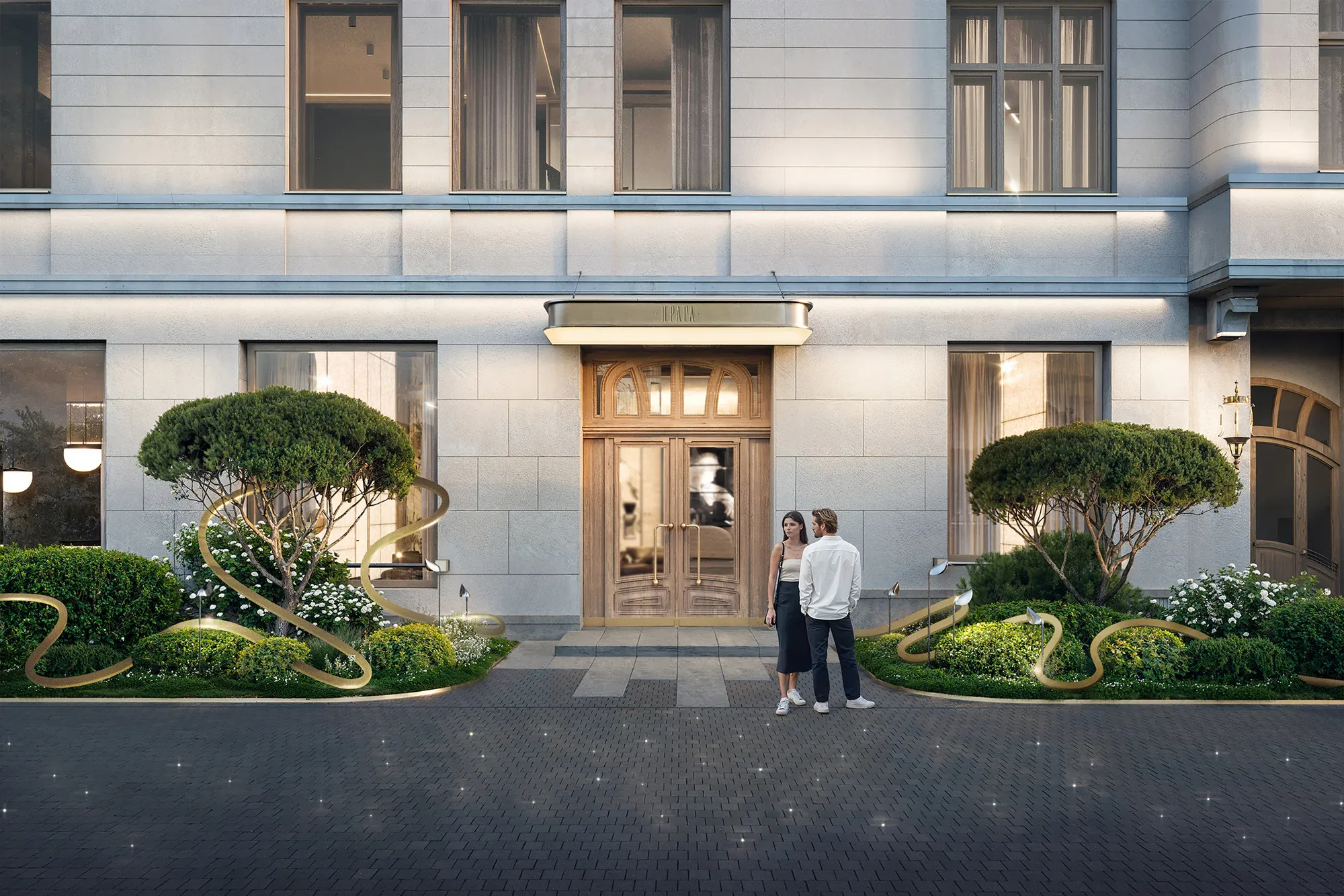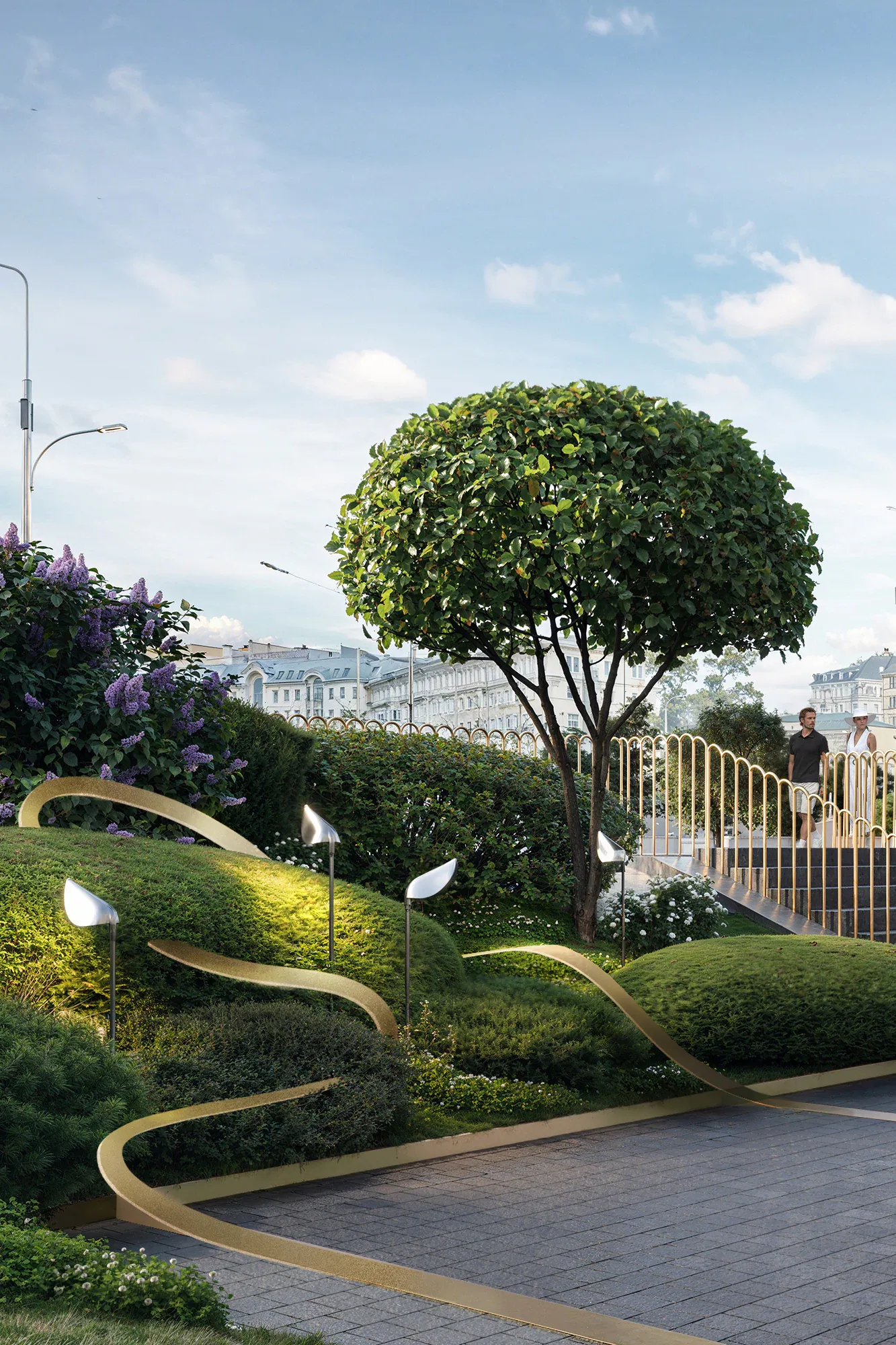 Сад стал результатом глубокого погружения в историю места: мы изучали архитектурное наследие Арбата и реконструкции ХХ века. Именно здесь в 1872 году находился знаменитый трактир «Прага», а в 1978 году одноимённый ресторан, в котором был изобретён культовый торт «Птичье молоко» — первый и единственный запатентованный десерт СССР. Мы также изучали работы главного архитектора Алексея Гинзбурга, который восстанавливал облик ресторана. Это позволило сформировать стилистическую основу благоустройства — бережное обращение с эпохой, выраженное в деталях: кирпичные вставки с годом основания и фамилией архитектора. Такая практика распространена в старых городах Европы. Латунь, заимствованная из интерьеров лобби отеля, стала лейтмотивом сада — она появляется в разметке парковочных зон, светильниках-тюльпанах, деталях малых форм и арт-объектах, вдохновлённых творчеством чешского живописца Альфонса Мухи.