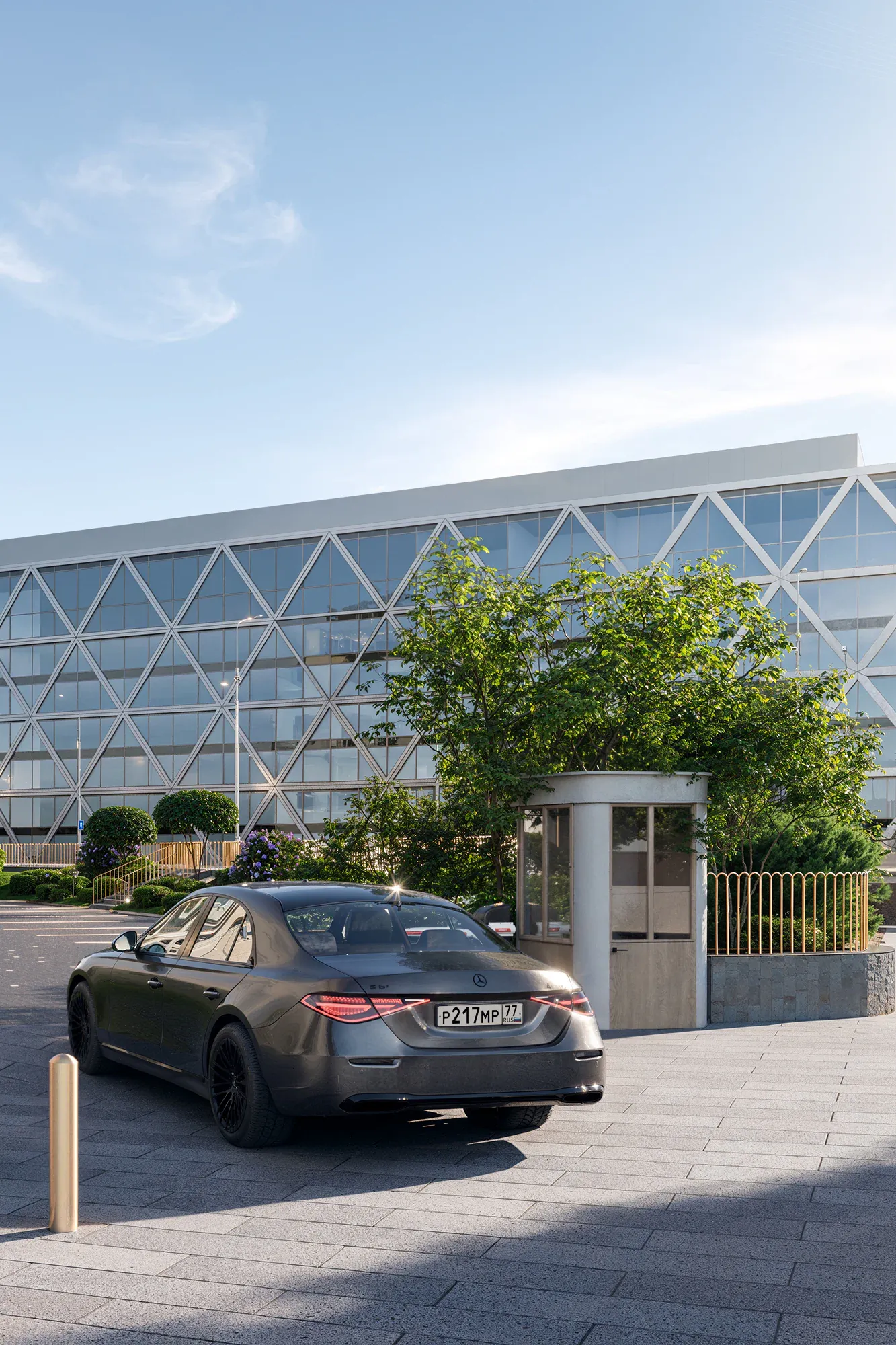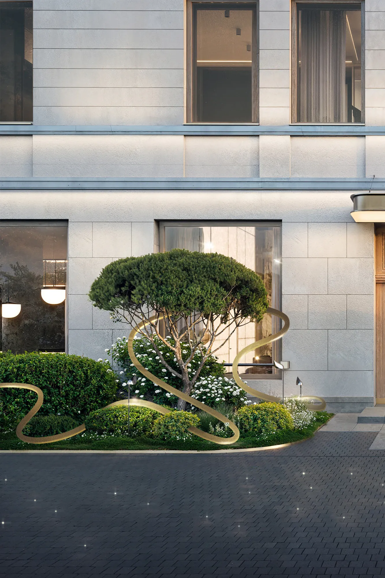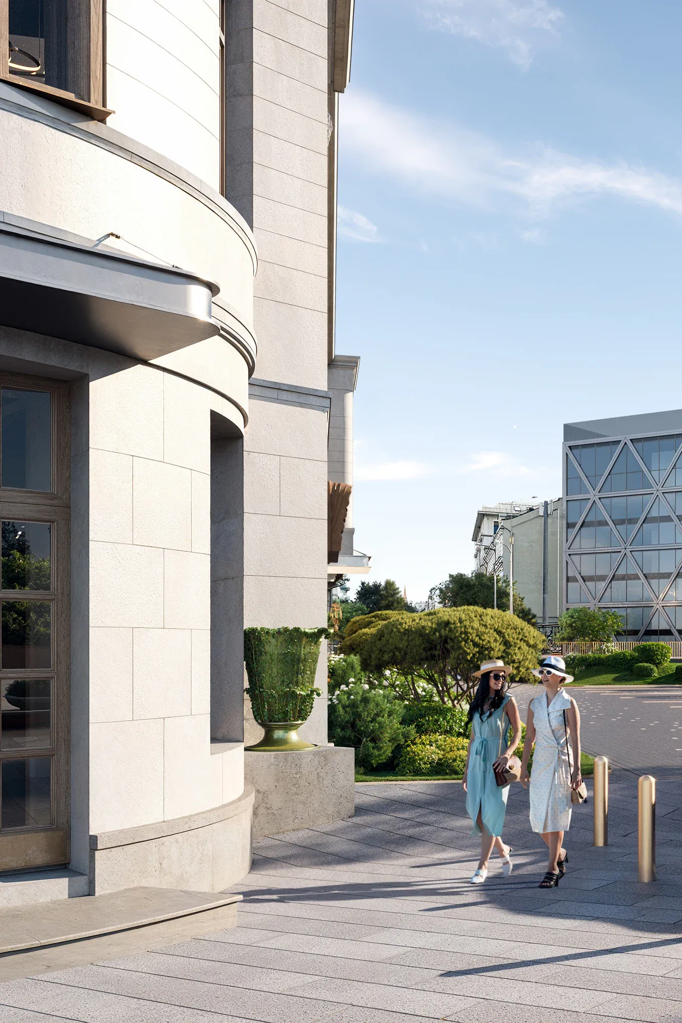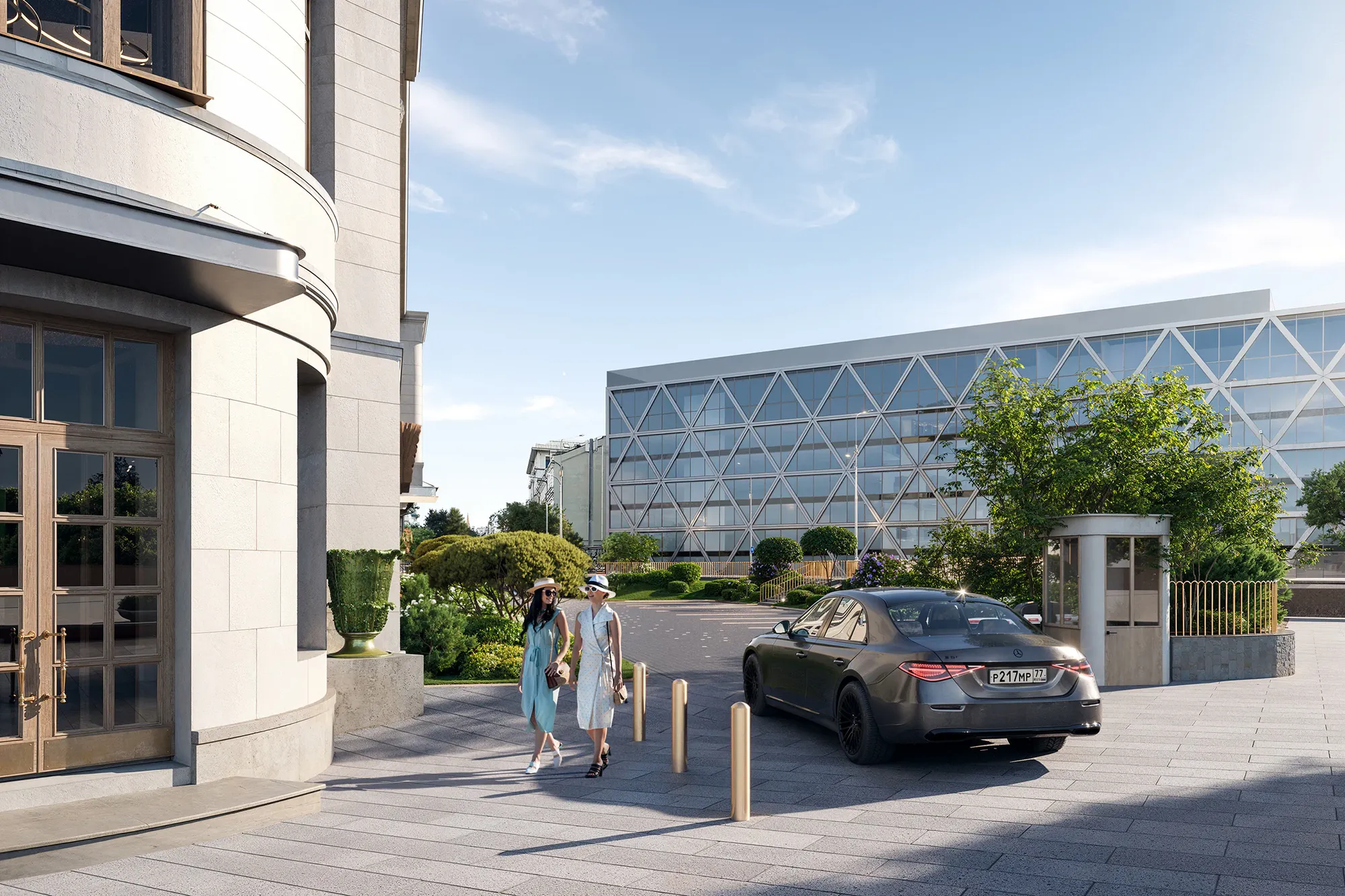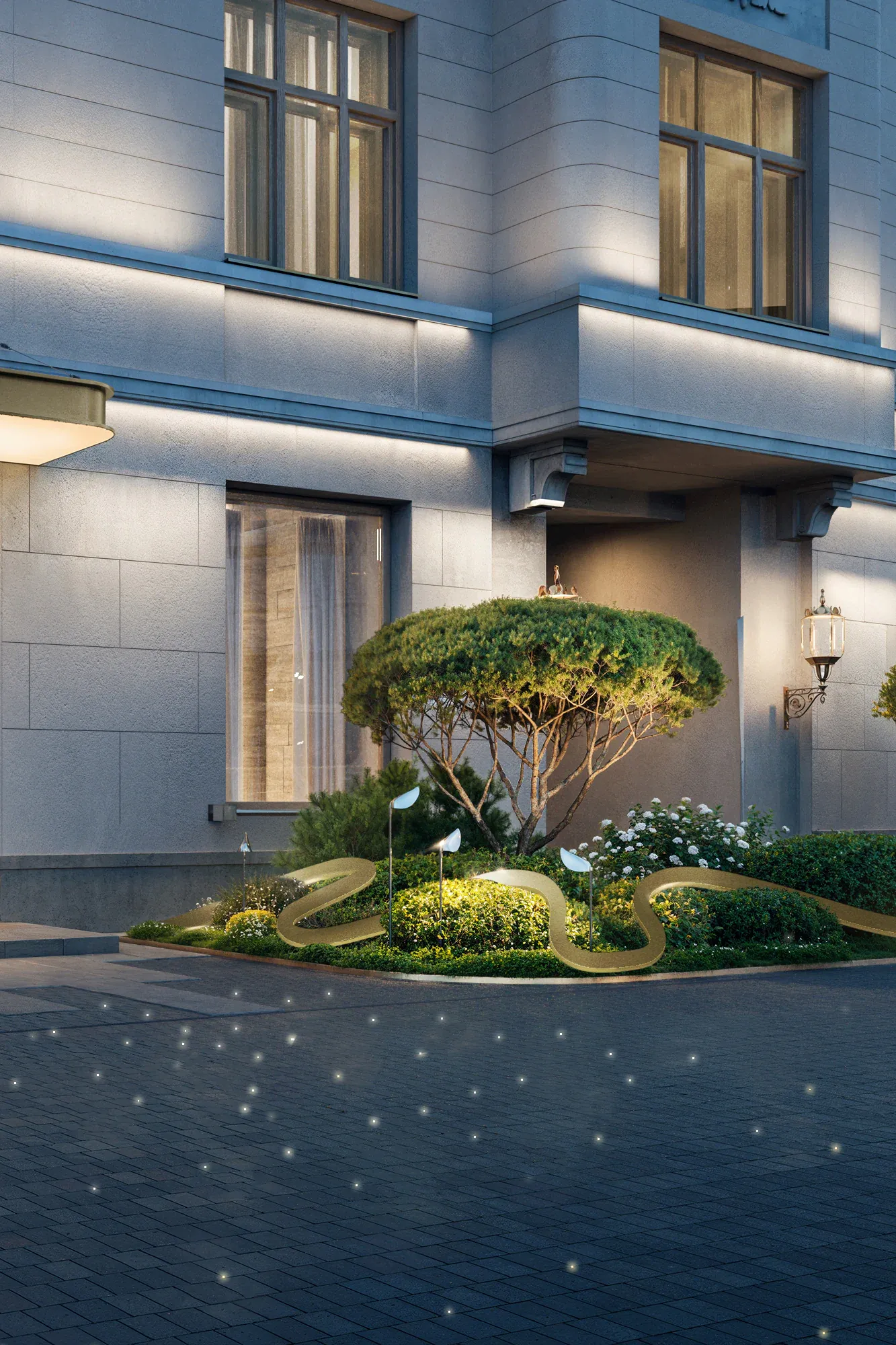 Сад стал результатом глубокого погружения в историю места: мы изучали архитектурное наследие Арбата и реконструкции ХХ века. Именно здесь в 1872 году находился знаменитый трактир «Прага», а в 1978 году одноимённый ресторан, в котором был изобретён культовый торт «Птичье молоко» — первый и единственный запатентованный десерт СССР. Мы также изучали работы главного архитектора Алексея Гинзбурга, который восстанавливал облик ресторана. Это позволило сформировать стилистическую основу благоустройства — бережное обращение с эпохой, выраженное в деталях: кирпичные вставки с годом основания и фамилией архитектора. Такая практика распространена в старых городах Европы. Латунь, заимствованная из интерьеров лобби отеля, стала лейтмотивом сада — она появляется в разметке парковочных зон, светильниках-тюльпанах, деталях малых форм и арт-объектах, вдохновлённых творчеством чешского живописца Альфонса Мухи.