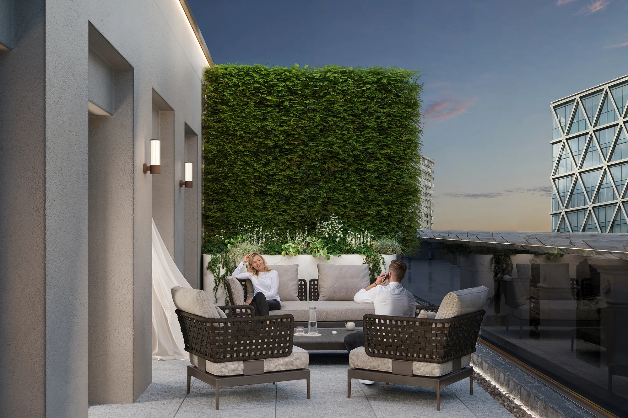 Особое внимание уделено звуку — вдоль террасы расположен водный объект — шумный водопад. Бегущий вдоль территории, он маскирует городской гул. Композиция растений подобрана с учётом затенённости участка — здесь доминируют рябины, боярышники и ирги. Стильные скамьи органично вписаны в подпорные стенки, мощение выполнено из старой брусчатки, а в вечернее время территорию озаряет «звёздное» освещение.