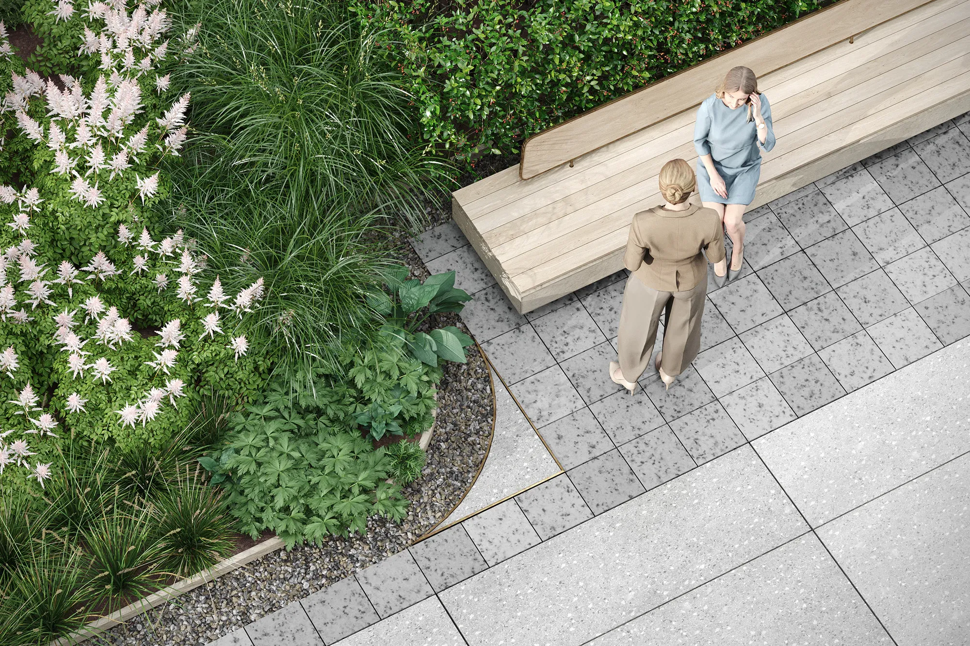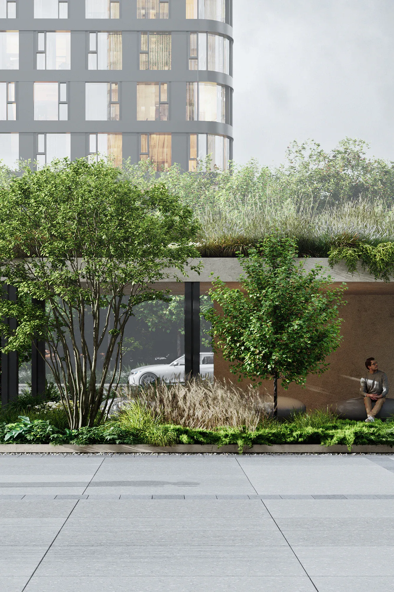 Объём озеленения удалось увеличить с нормативных 10% до 30%. Для этого потребовалась сложная координация со специалистами городских сетей, чтобы освободить улицы от инженерных сетей для деревьев. Большинство из них приподнято и защищено металлическими бортами.