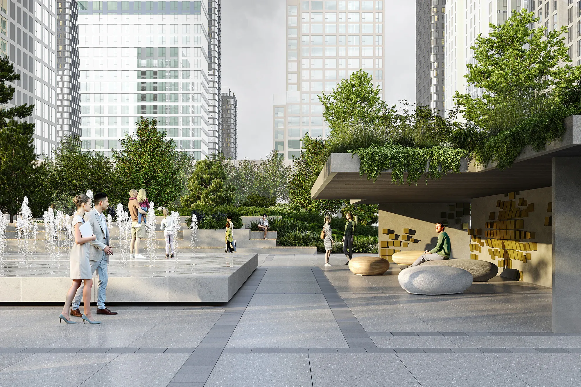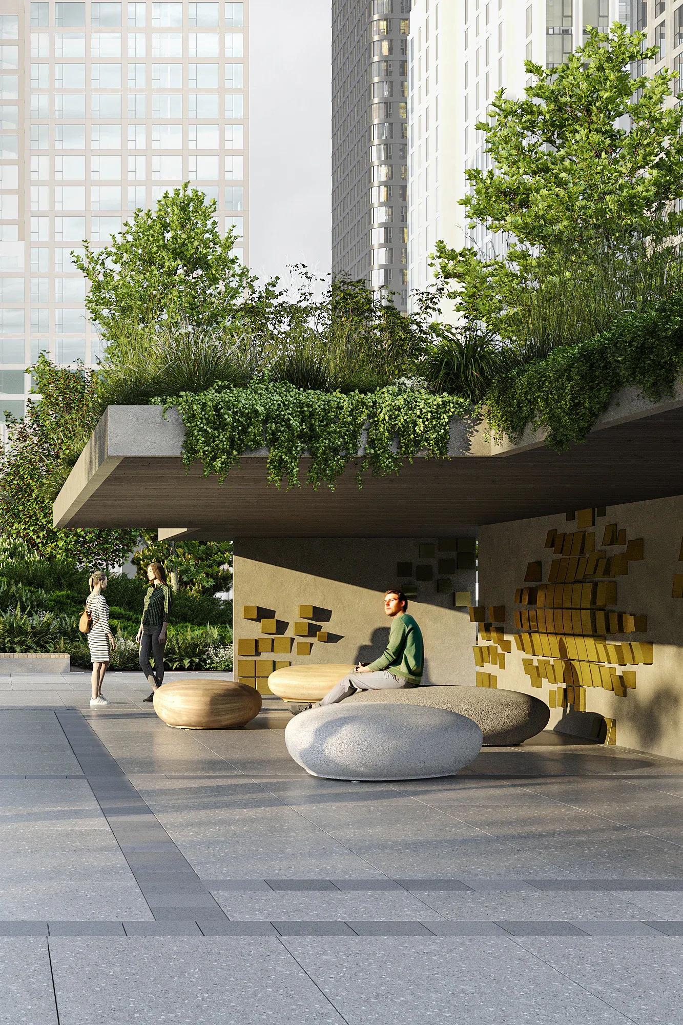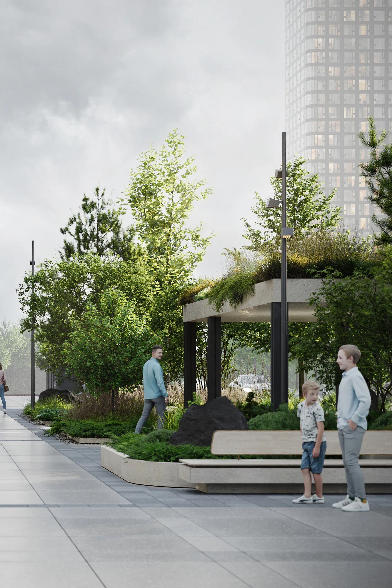 Центральная идея — бесшовное, цельное пространство, где нет резких границ между парком и улицей. На смену привычному асфальту и «холодной» серой городской палитре, пришла тёплая, уютная среда с крупноформатной бежевой плиткой, закруглённые формы, МАФы с вставками латуни и ламинации дерева. Велодорожки, навесы с зелёными крышами, произведения искусства (арт-объекты) и даже музей деревьев — всё подчинено принципам функциональности, логистической связности и авторской стилистике Скандинавских садов® с её геометричностью, чистотой основы и характерностью.