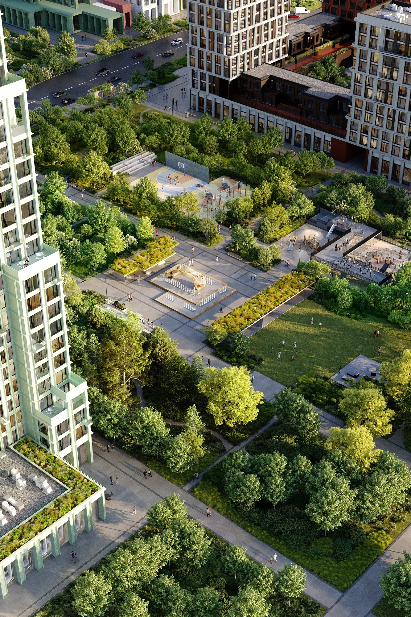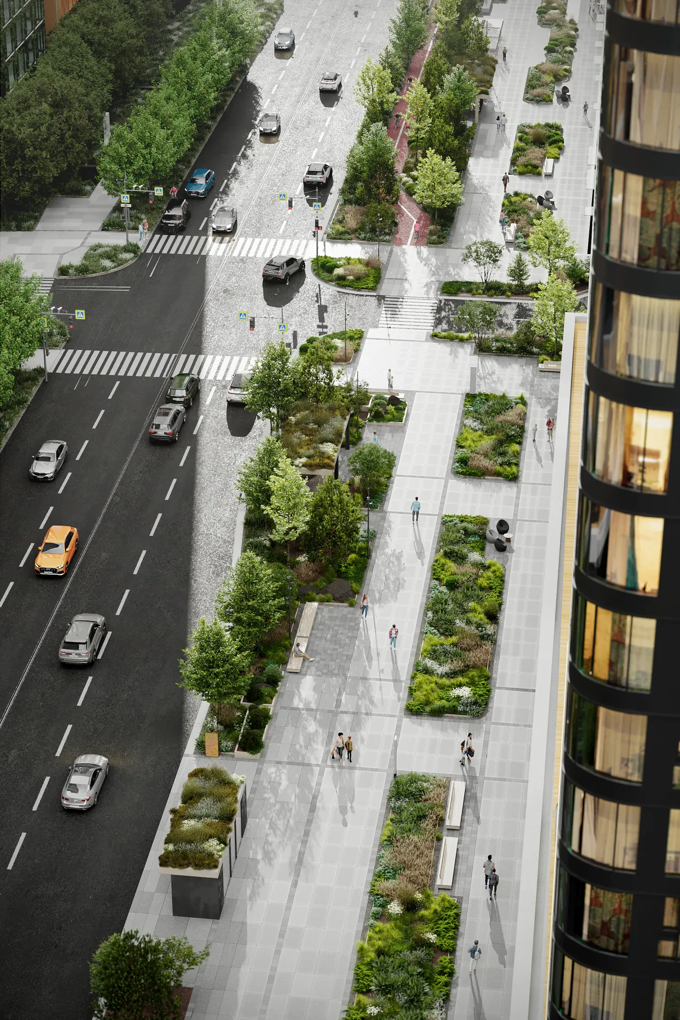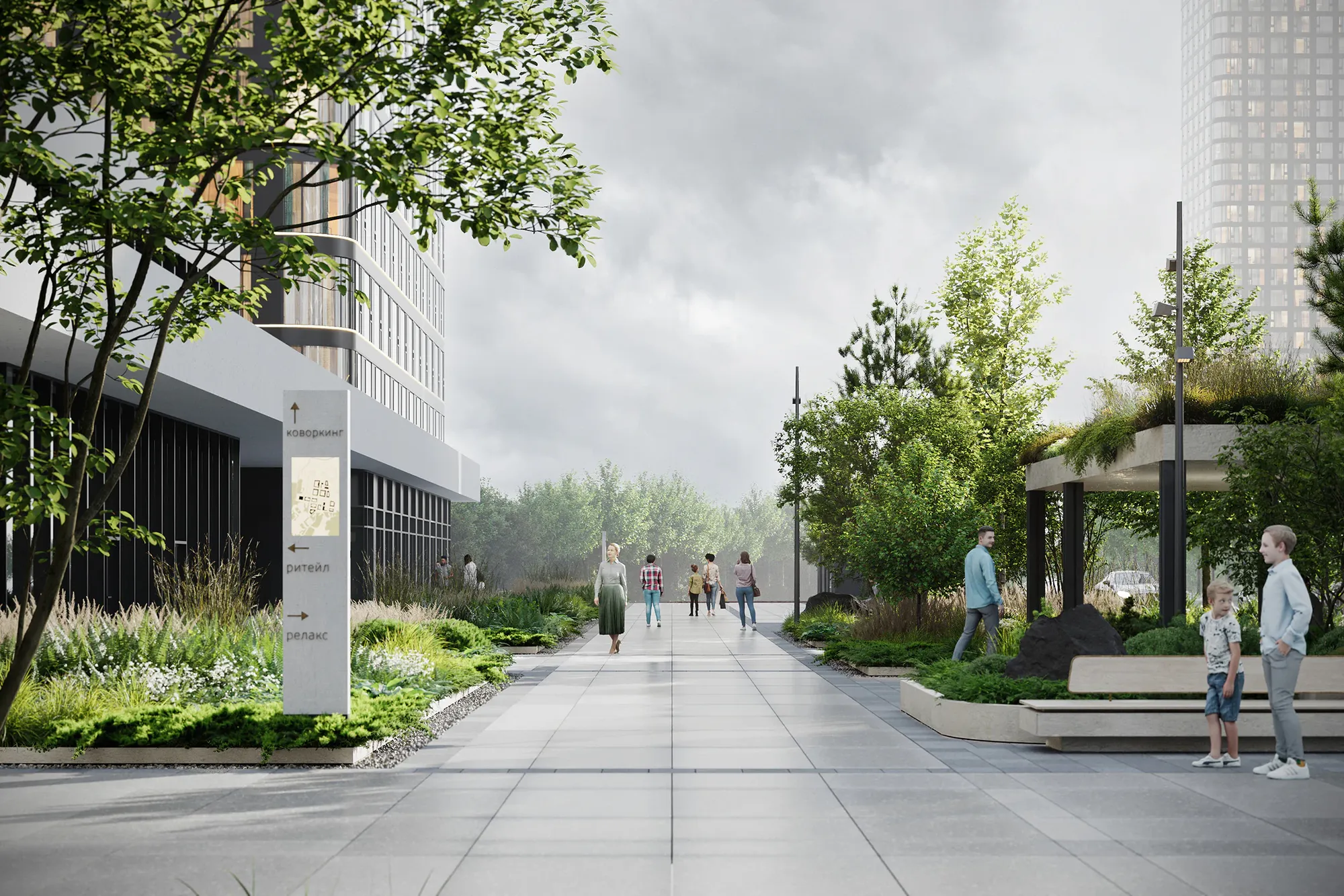 Задача, поставленная мэром Сергеем Собяниным и главным архитектором Москвы Сергеем Кузнецовым, амбициозна: создать пилотный микрорайон с опережающими стандартами благоустройства, который станет прототипом программы «Моя улица 2.0». Главный принцип — «город для жизни», ориентированный не на абстрактного жителя мегаполиса, а на реального человека: пешехода, велосипедиста, пассажира общественного транспорта или гостя, выходящего из метро. Было важно сперва увидеть благоустройство, понять, как будет встроен комфорт горожан в новую среду и только затем приступить к архитектуре зданий района. Именно «с высоты глаз» — а не с высоты птичьего полёта — оценивалось каждое решение в ландшафте.