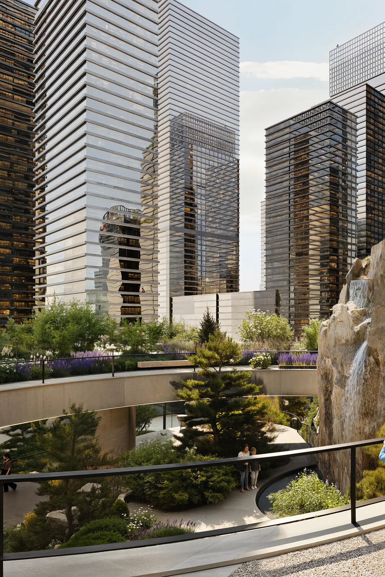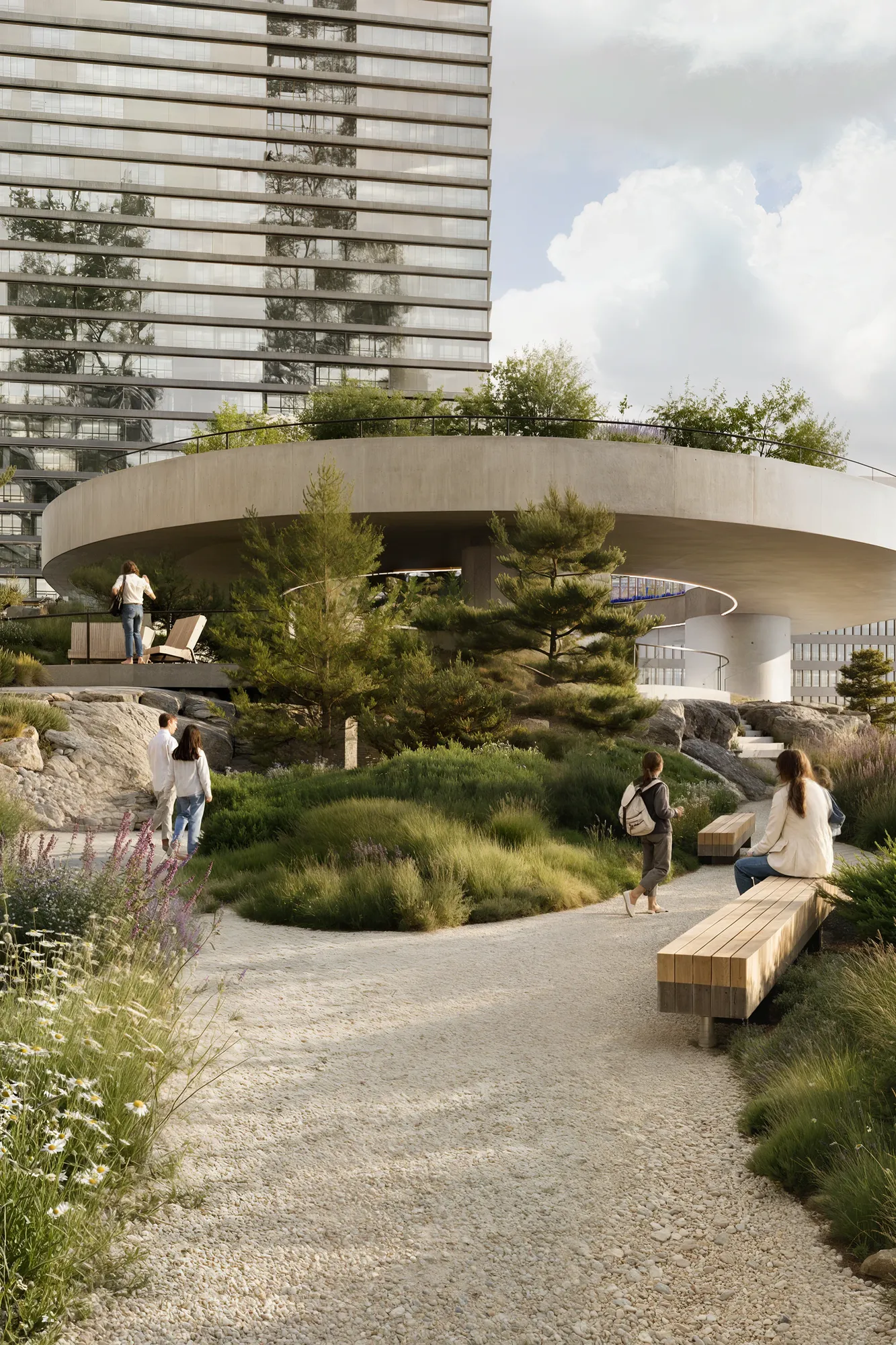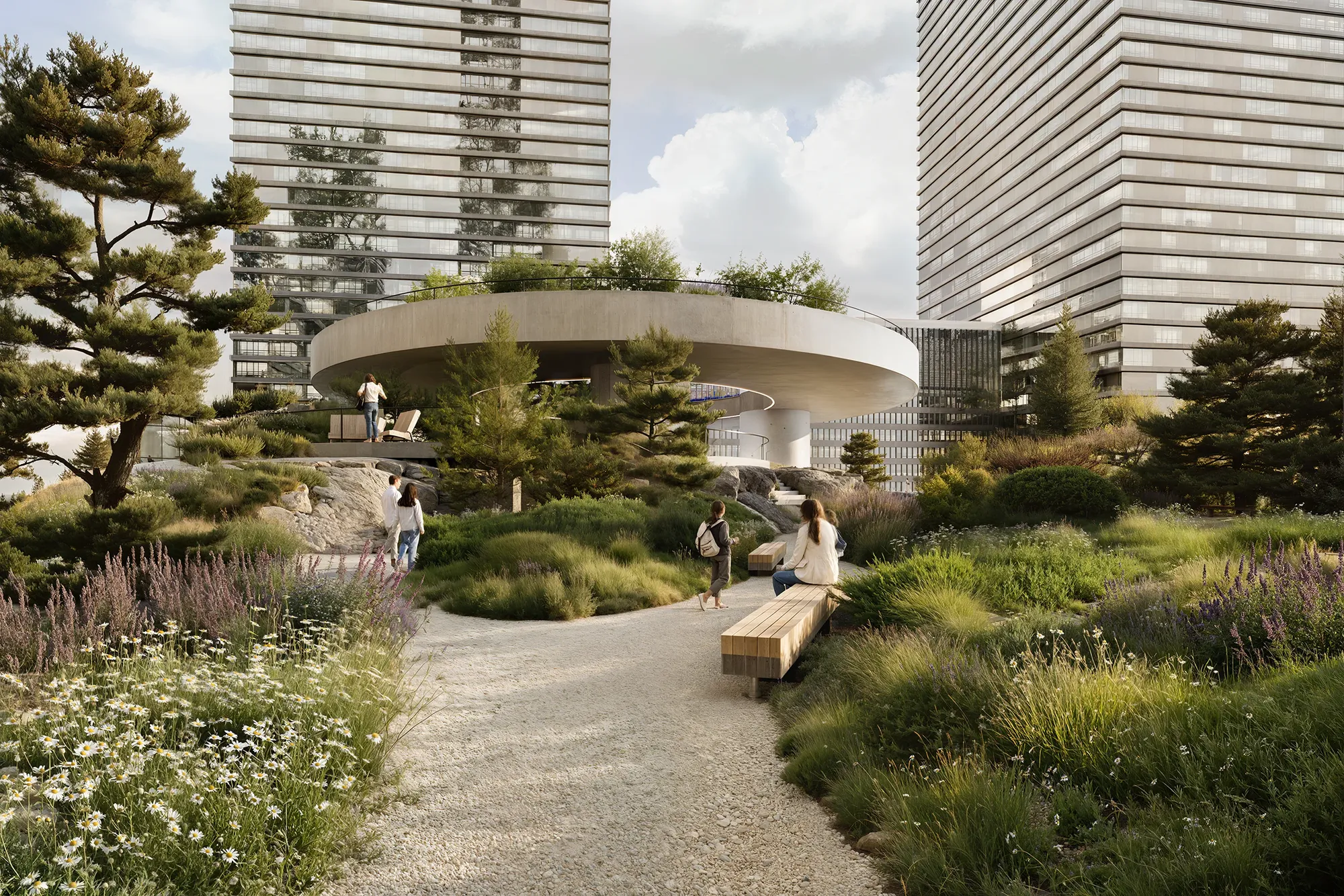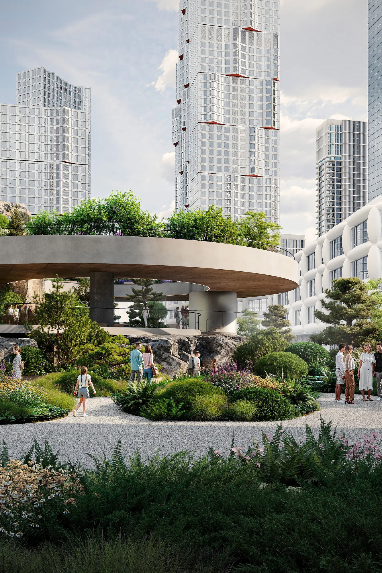 Ландшафт имитирует карельский рельеф. Холмы, скальные композиции и густые насаждения формируют характерность авторского Скандинавского сада®, а также эффективно скрывают шум мегаполиса для жильцов комплекса. Это «островок дикой природы» посреди высотных зданий — место, где можно обрести гармонию.