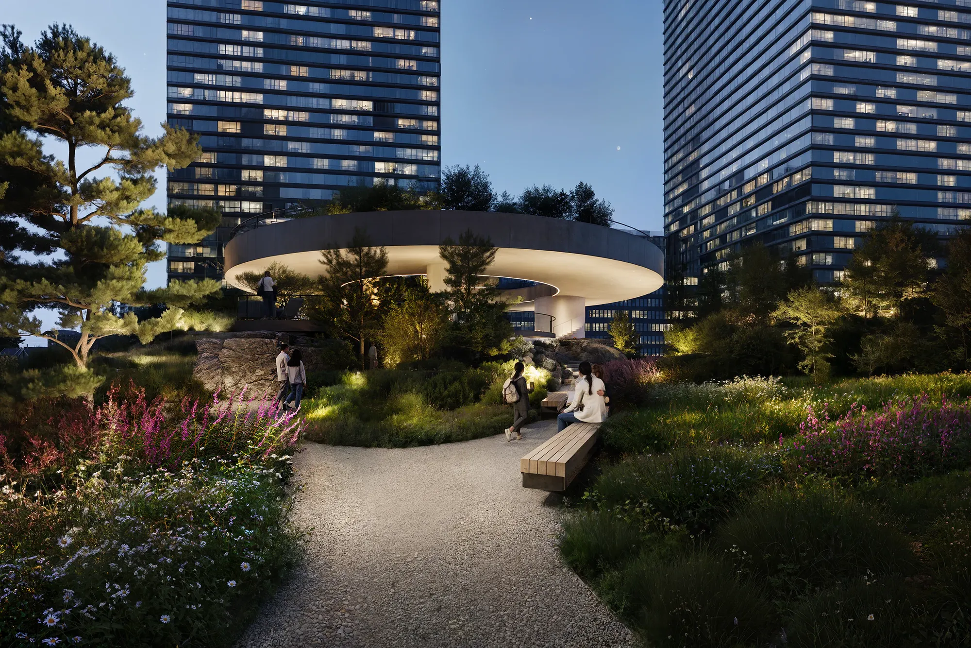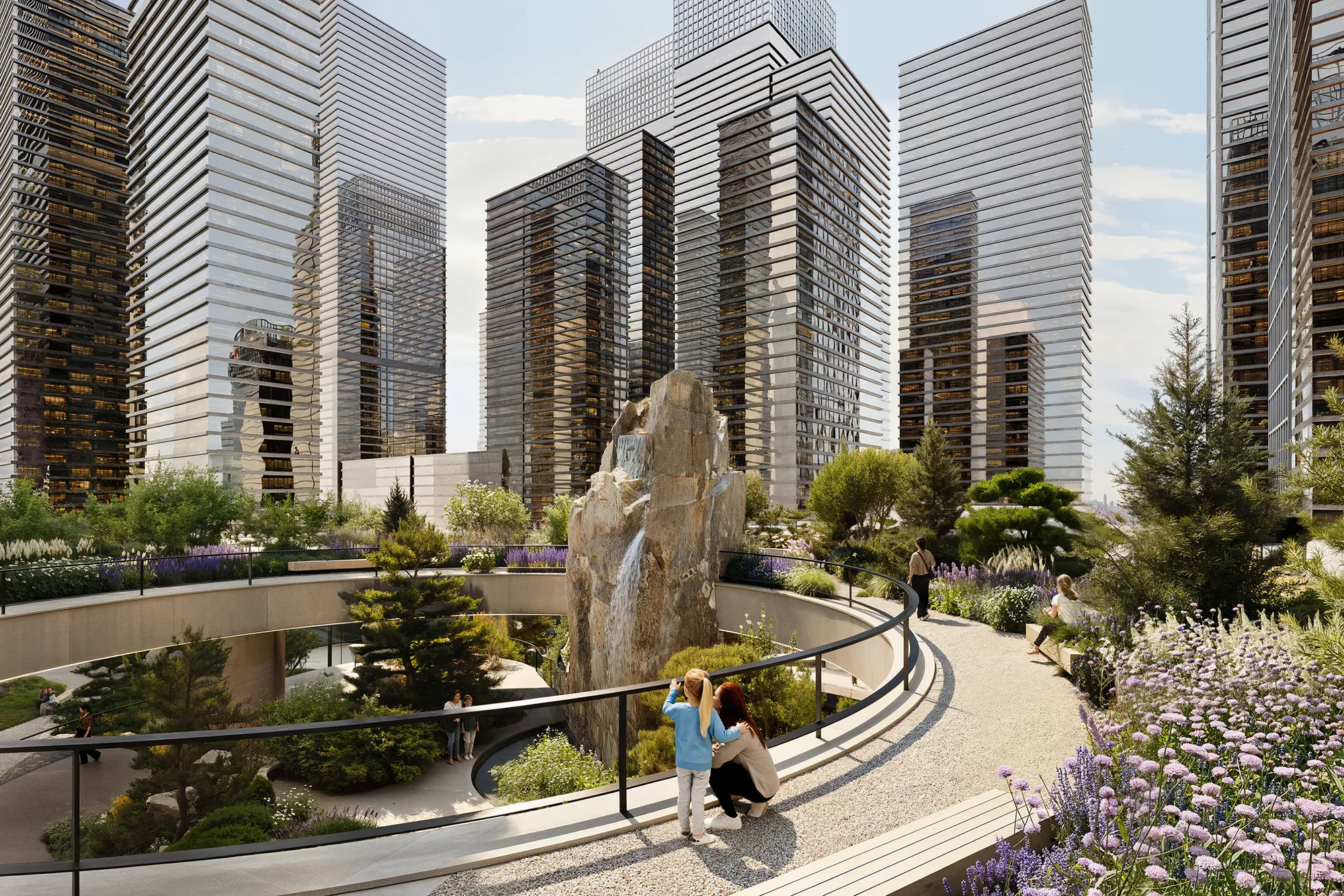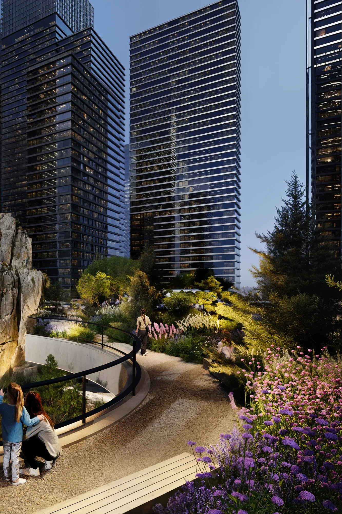 Ландшафт имитирует карельский рельеф. Холмы, скальные композиции и густые насаждения формируют характерность авторского Скандинавского сада®, а также эффективно скрывают шум мегаполиса для жильцов комплекса. Это «островок дикой природы» посреди высотных зданий — место, где можно обрести гармонию.