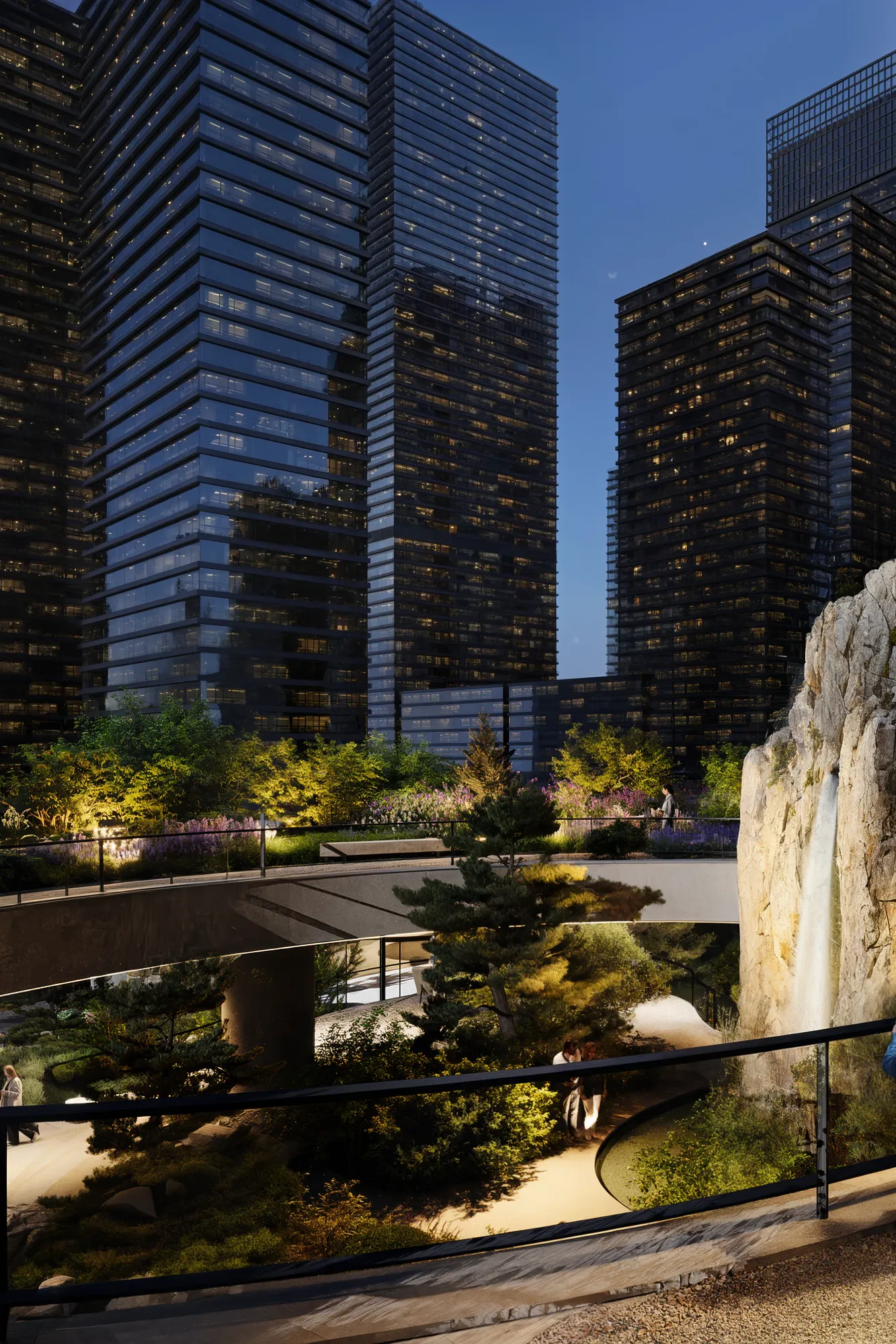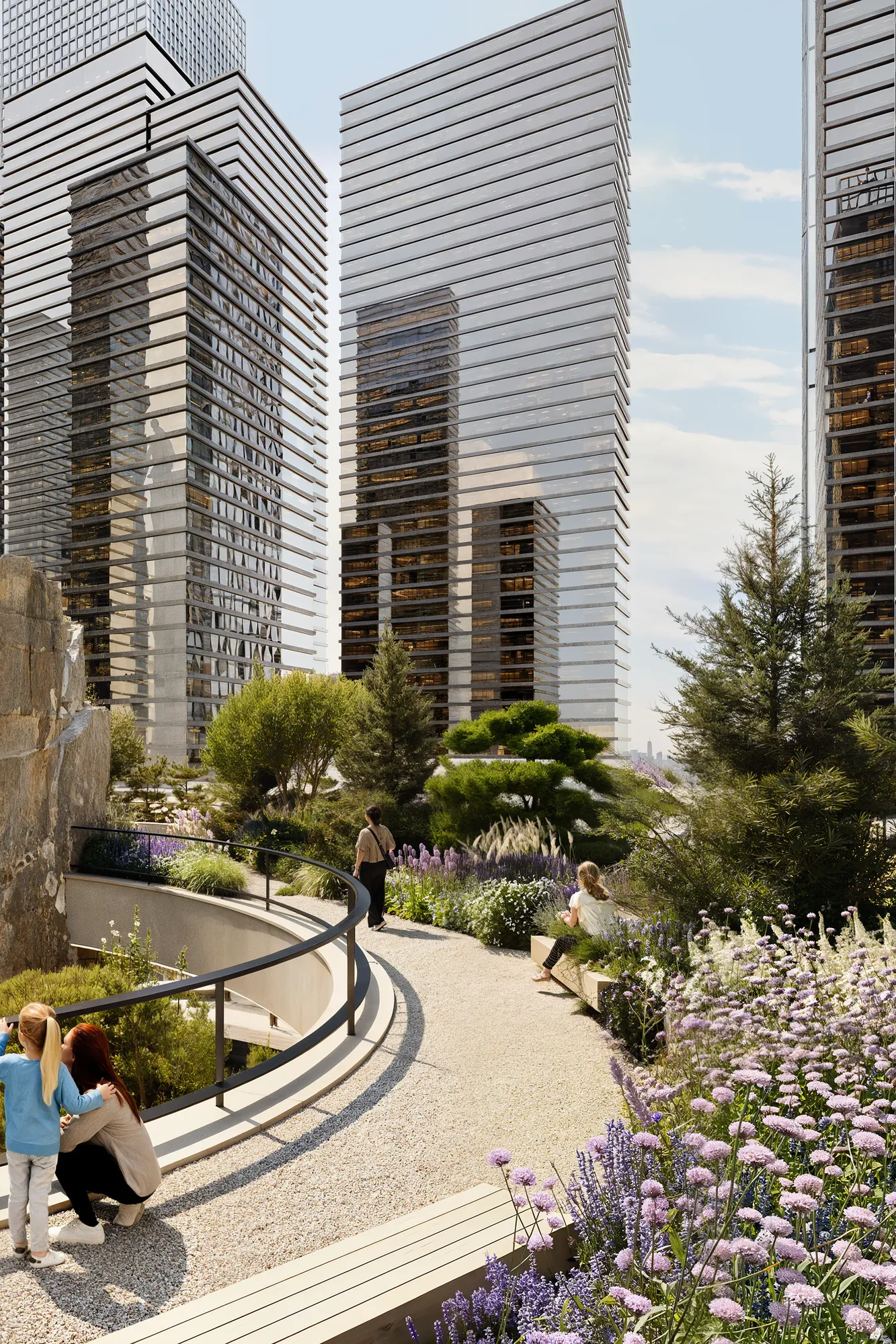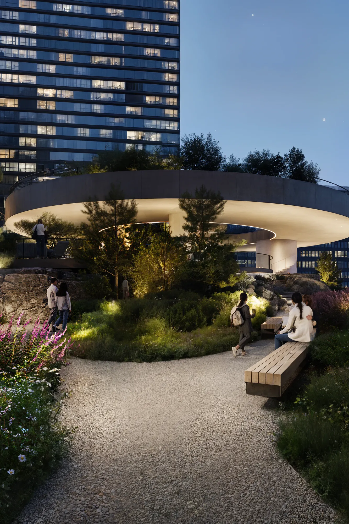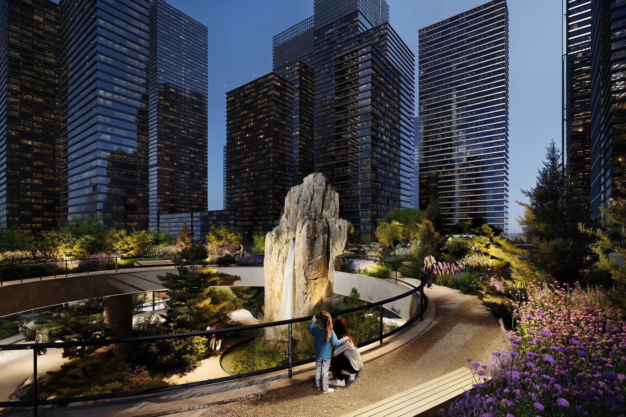 Ландшафт имитирует карельский рельеф. Холмы, скальные композиции и густые насаждения формируют характерность авторского Скандинавского сада®, а также эффективно скрывают шум мегаполиса для жильцов комплекса. Это «островок дикой природы» посреди высотных зданий — место, где можно обрести гармонию.