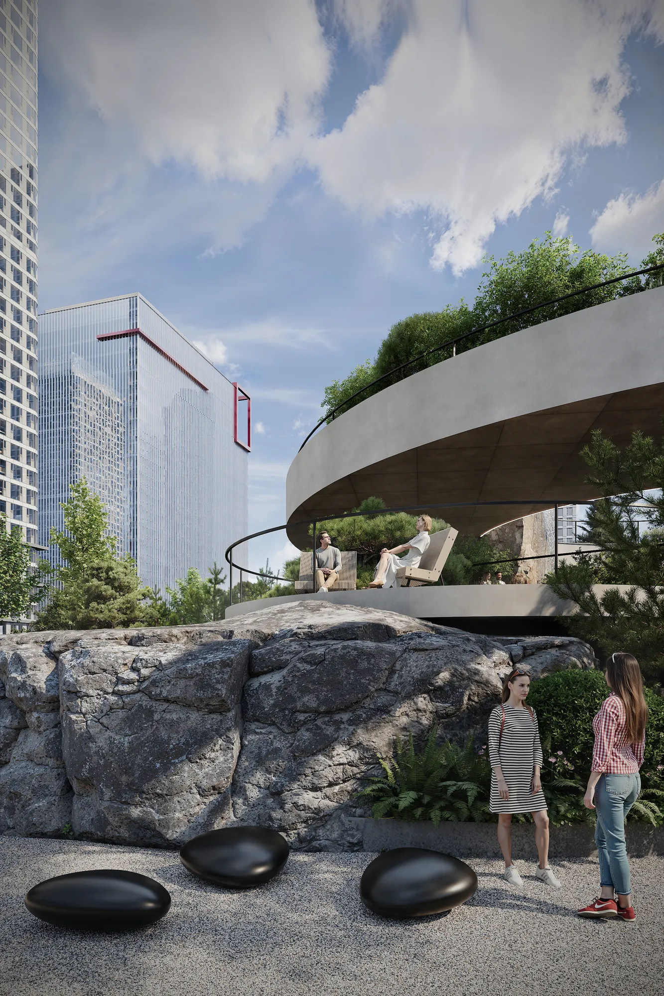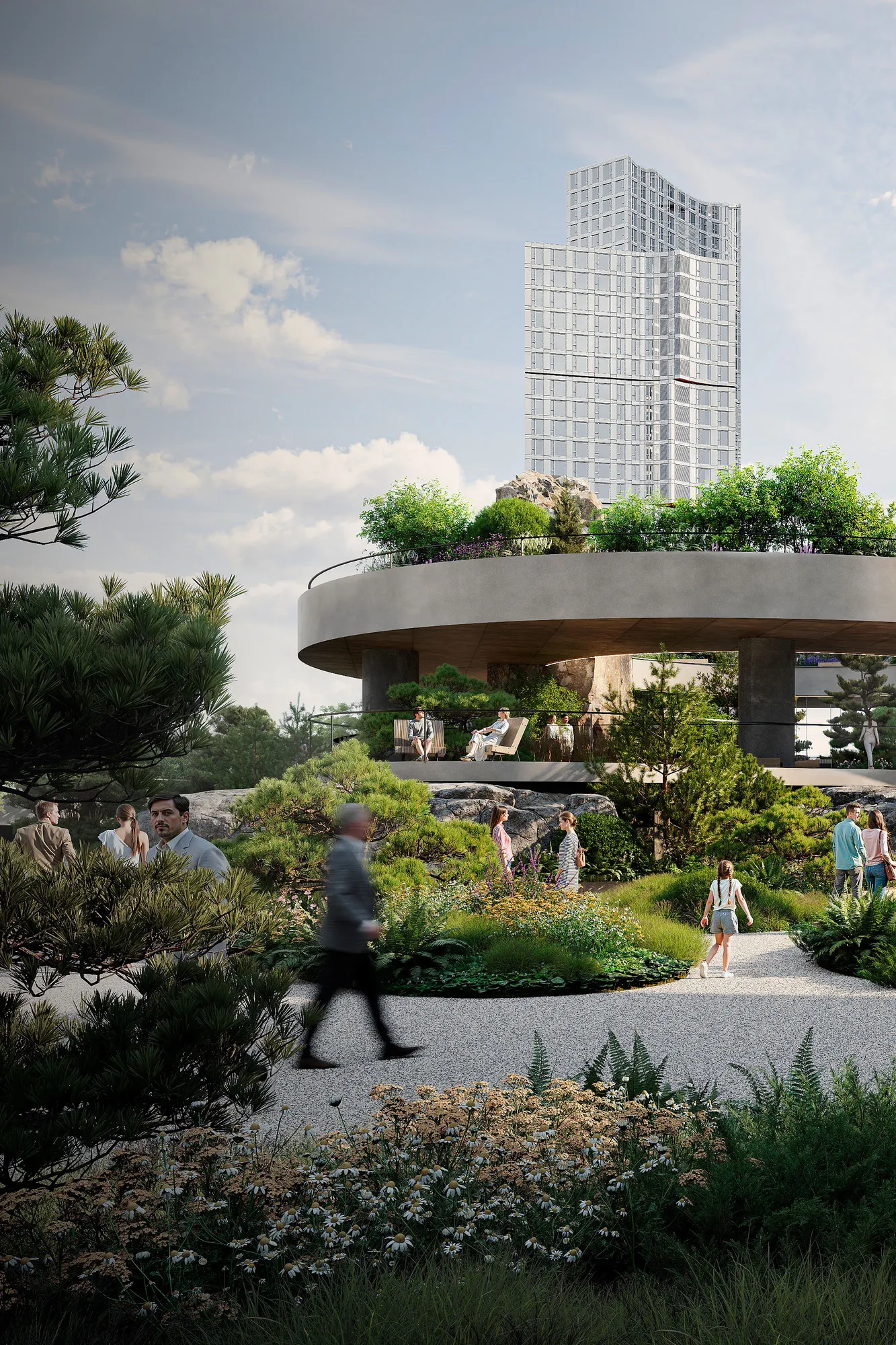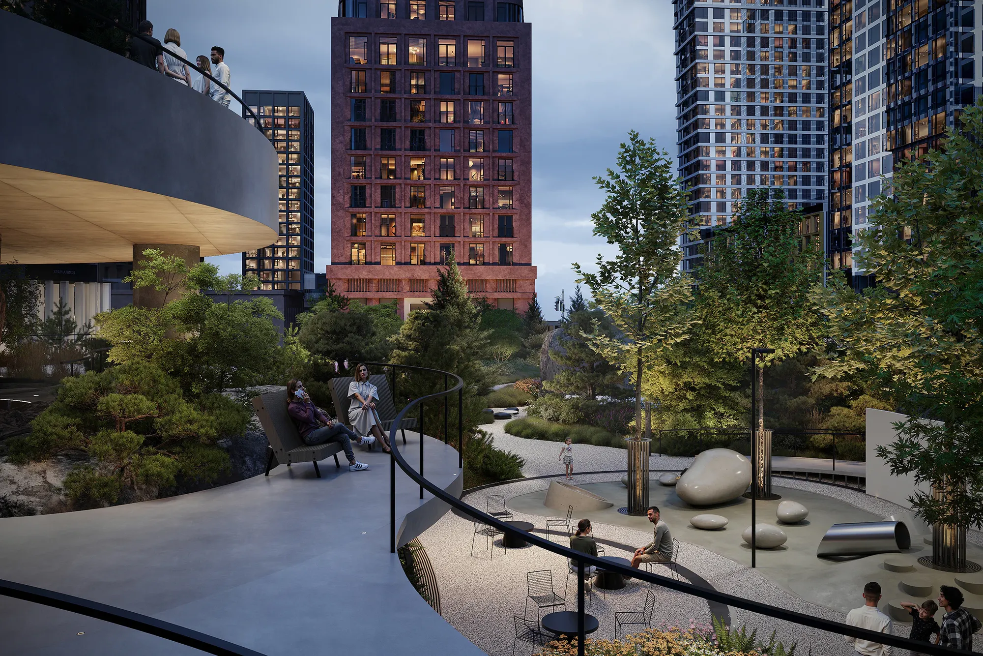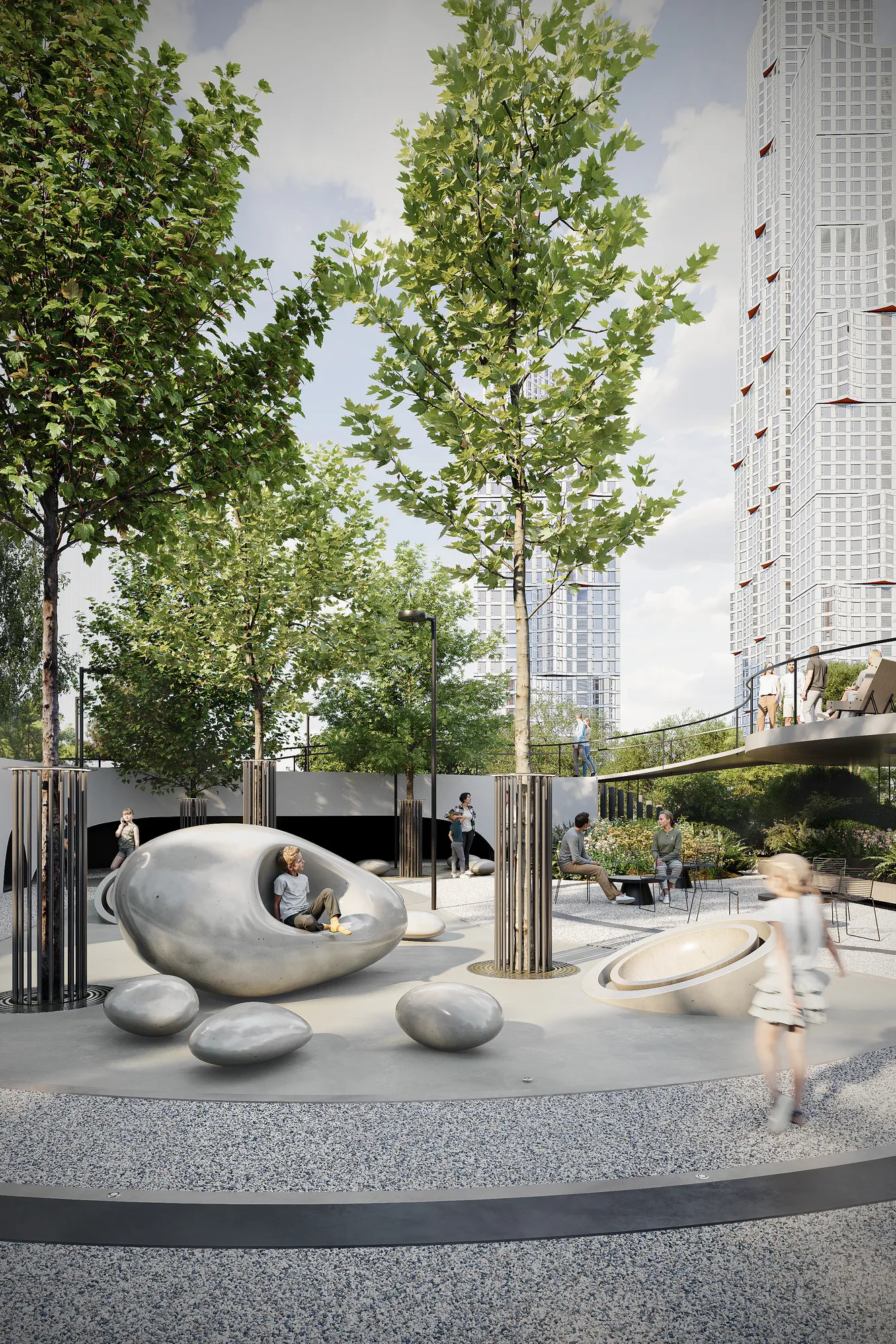 Концепция проекта — «Сад вне времени» — отражает стремление создать среду, которая будет одинаково актуальной и привлекательной сегодня, завтра и через 20–30 лет. Здесь комфортно детям, подросткам, взрослым и пожилым — каждому найдётся место: активные игры или созерцание, общение или уединение. Сад становится точкой притяжения целого района, где естественным образом встречаются его жители, офисные работники с соседствующих бизнес-центров, школьники и гости квартала.