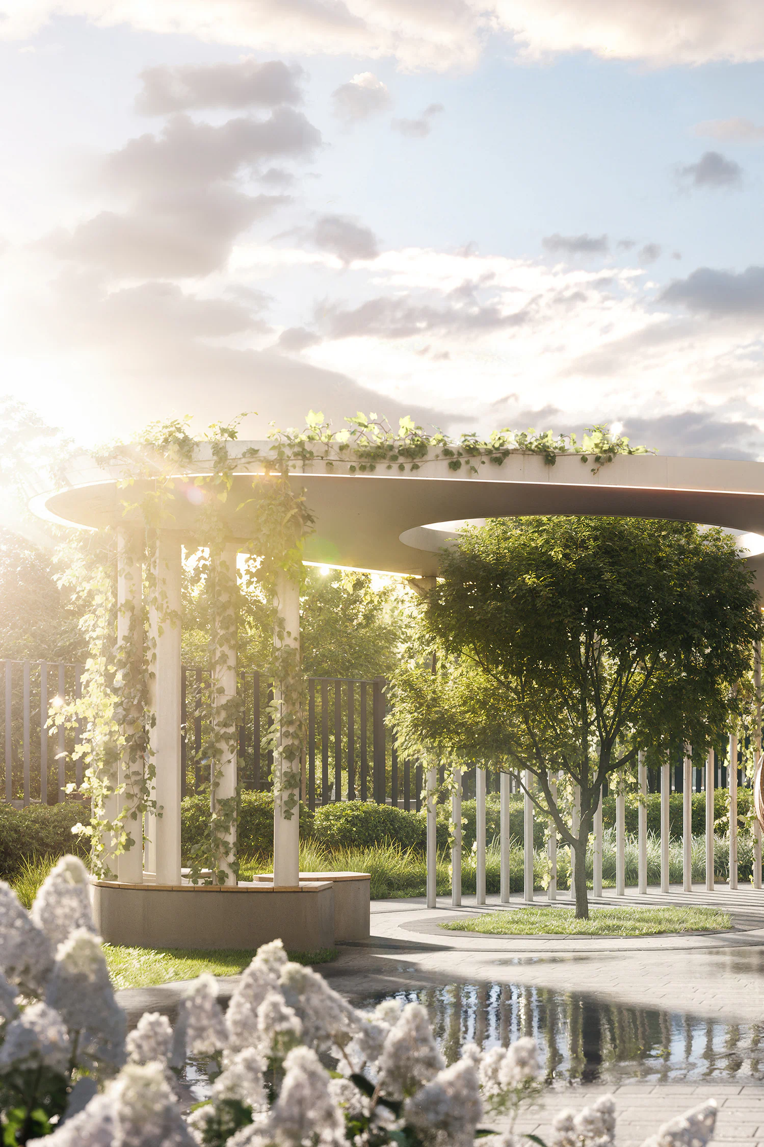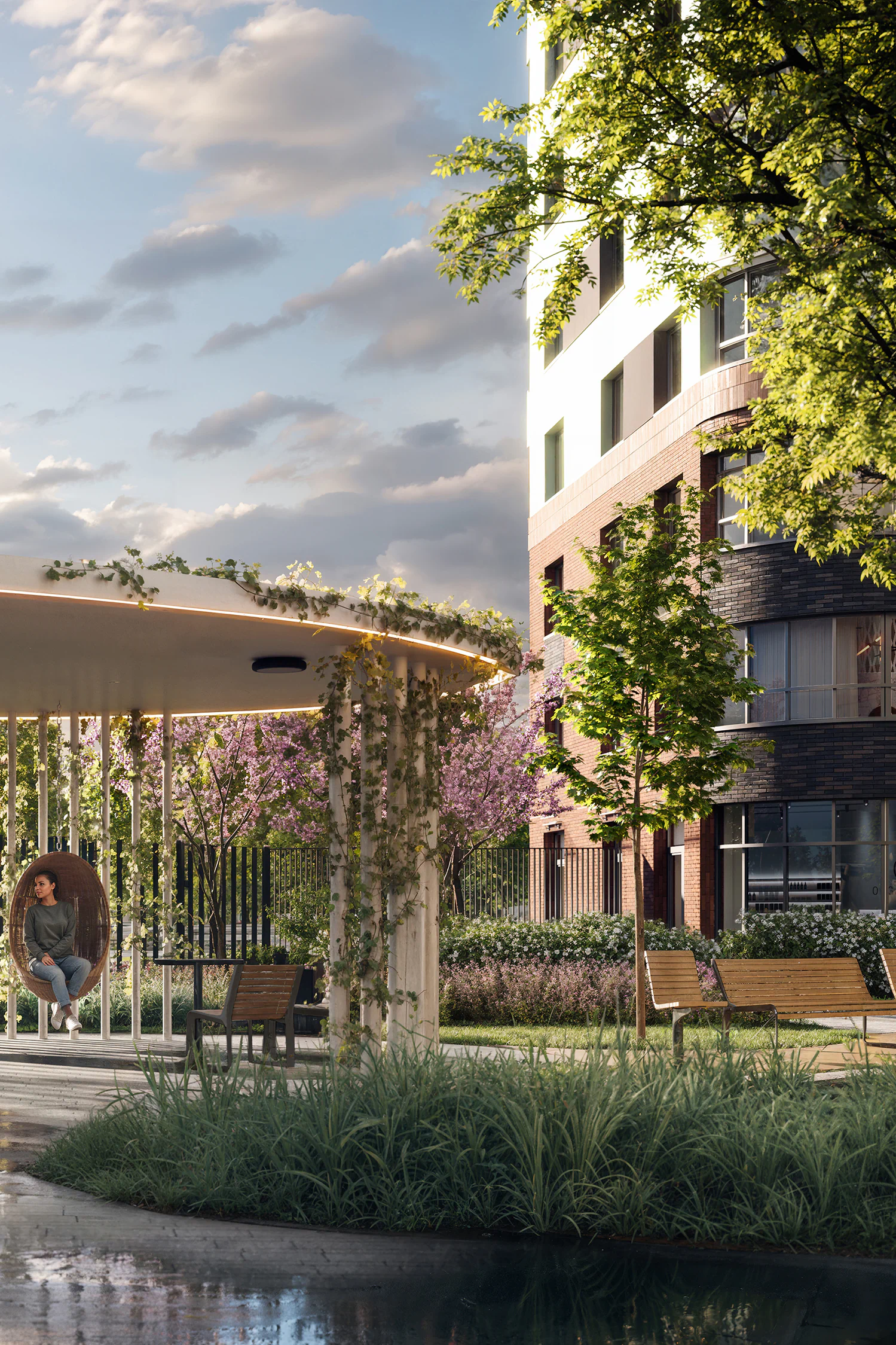 Принцип проницаемости здесь стал ключевым. Мы интегрировали озеленение в архитектурные конструкции на уровне первого и второго этажа. Поставили металлические навесы в форме линий, которые пронизывают широкие кроны хвойных и лиственных деревьев и создают эффект «паутения». Это усиливает ощущение естественного, «дышащего» пространства, дарит чувство безопасности и позволяет человеку не потерять себя рядом со зданиями высокой этажности, а ощутить гармоничное состояние.