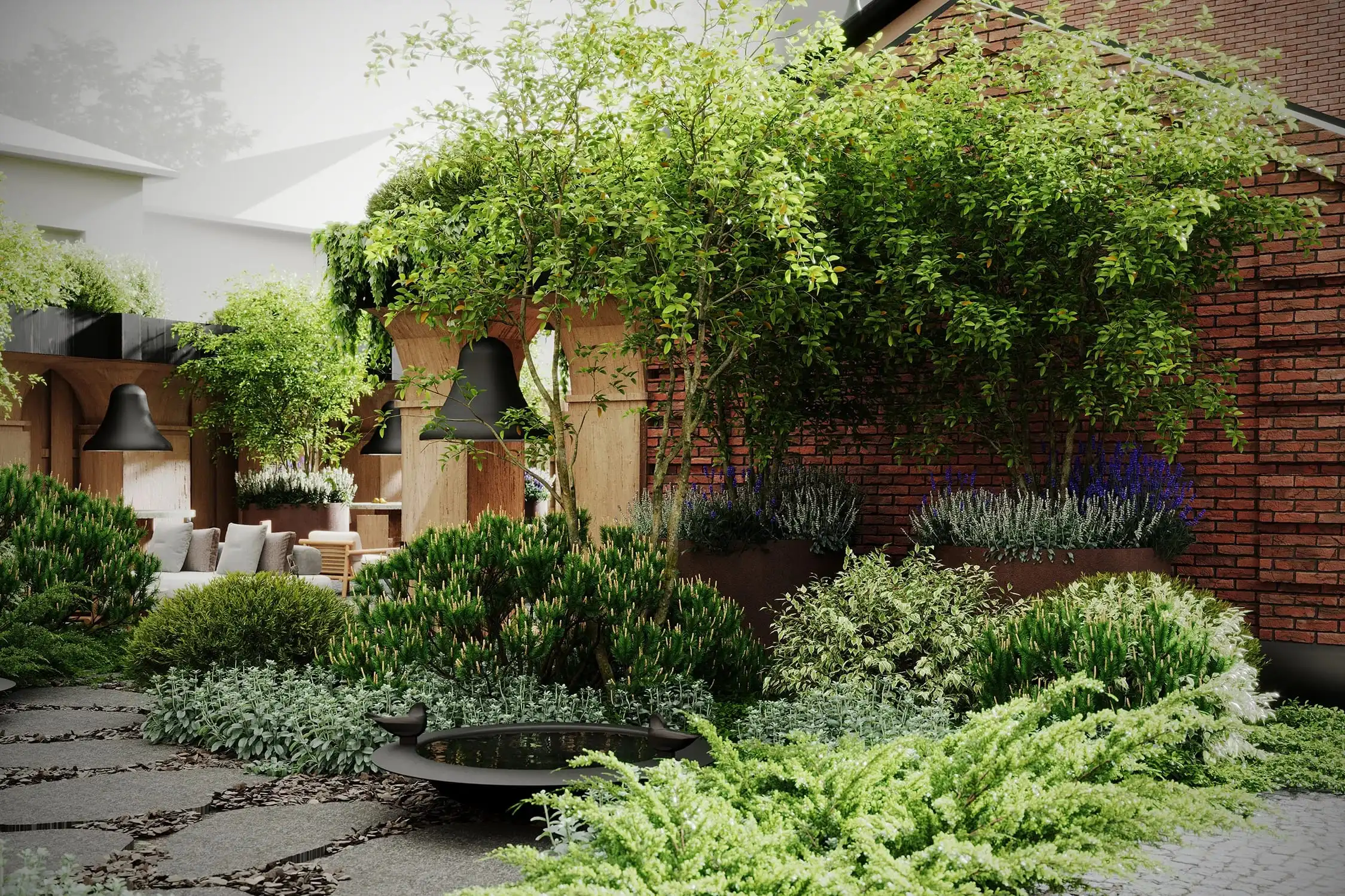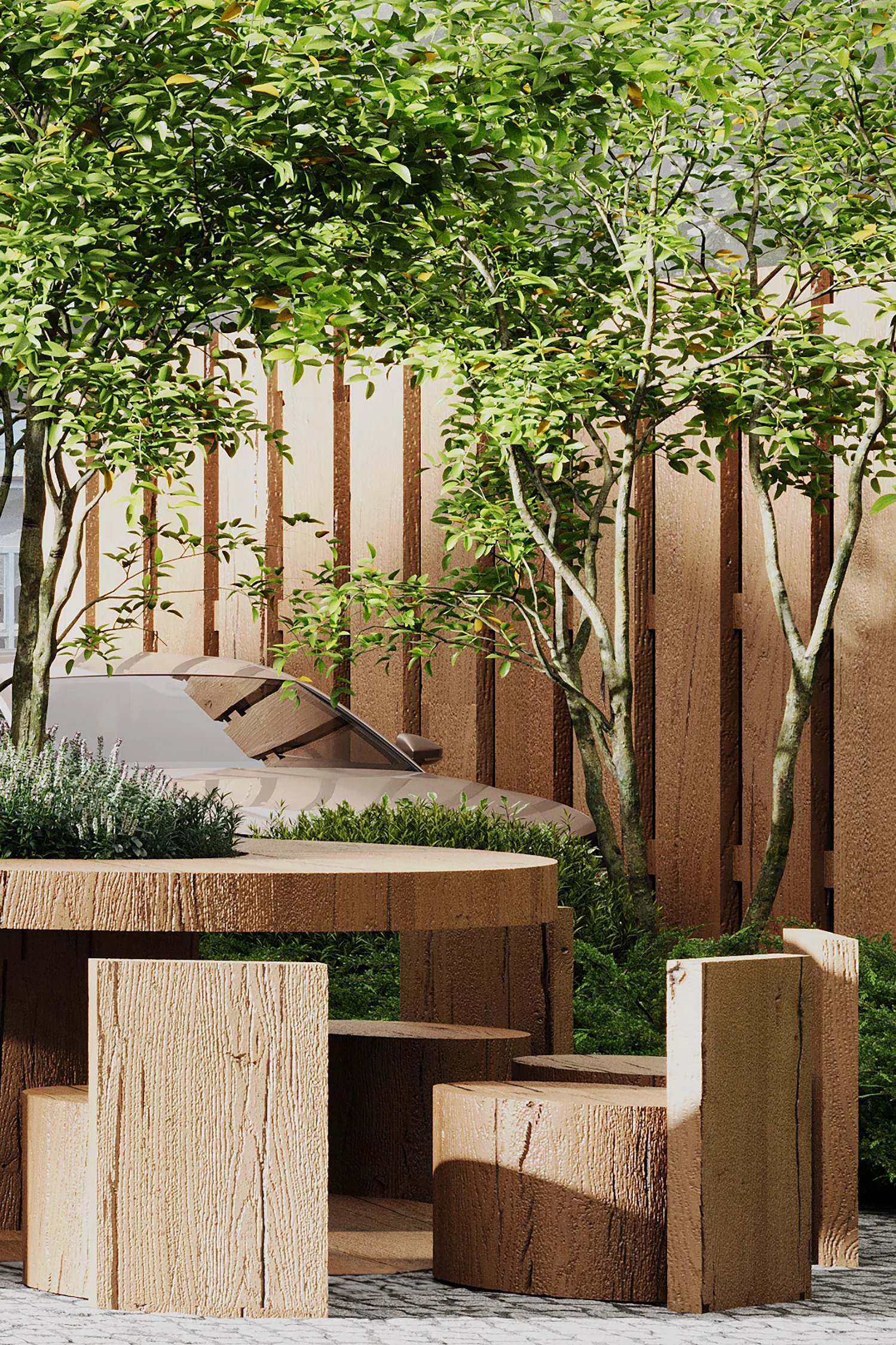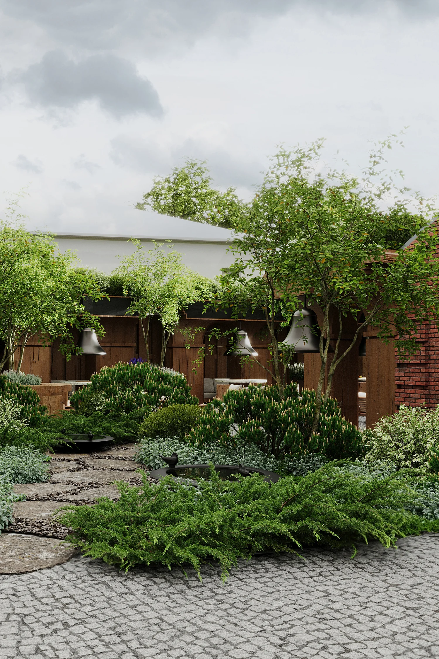 Для церемониального чаепития мы придумали садовую комнату с круглым столом на 6-8 человек, в центре которого будет роскошная липа. Эту зону скроют лесные растения с северным характером. Создать скандинавский ландшафт помогут высокие сосны и другие хвойные, средний ярус можжевельников и папоротников, а также декоративные мягкие мхи.
