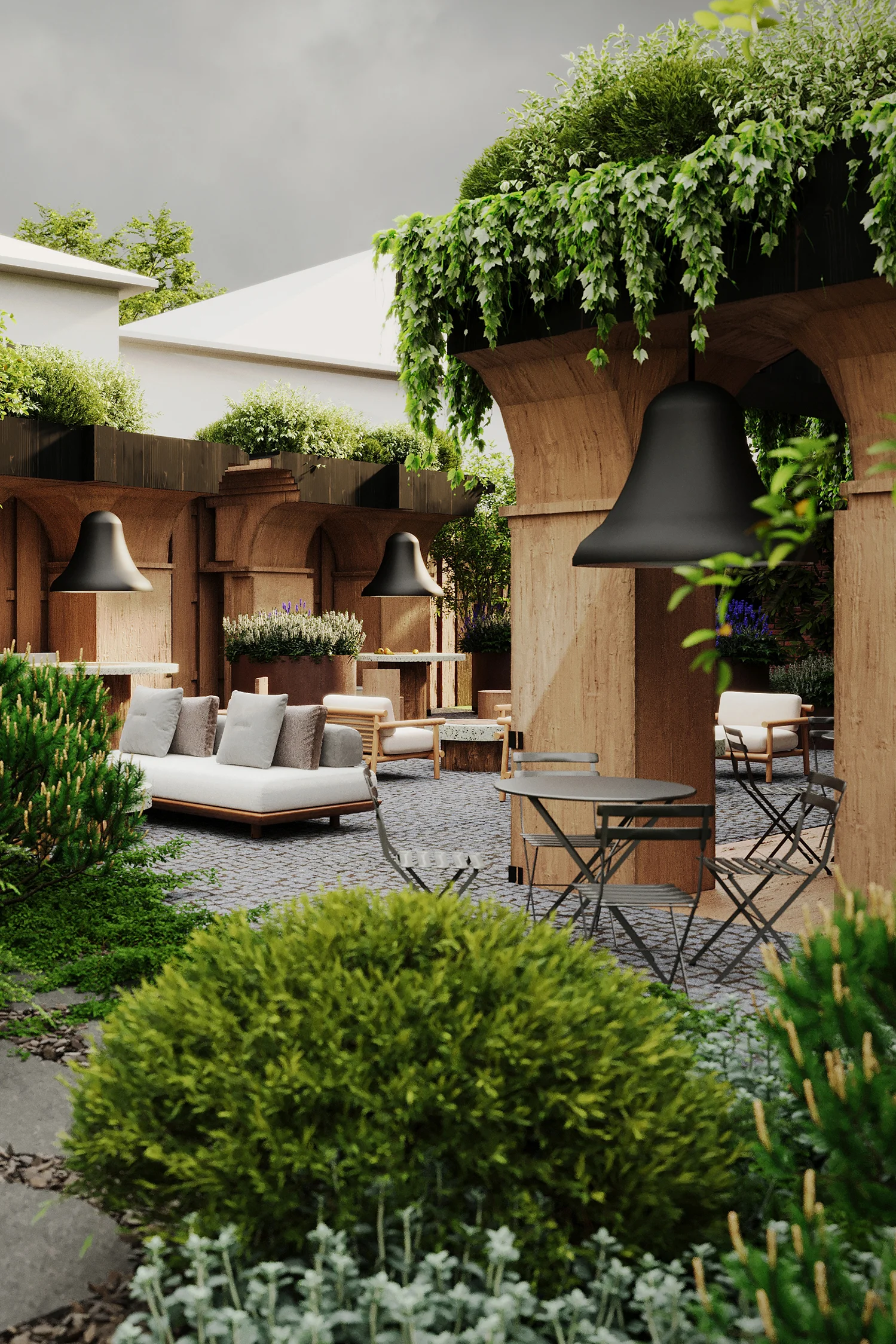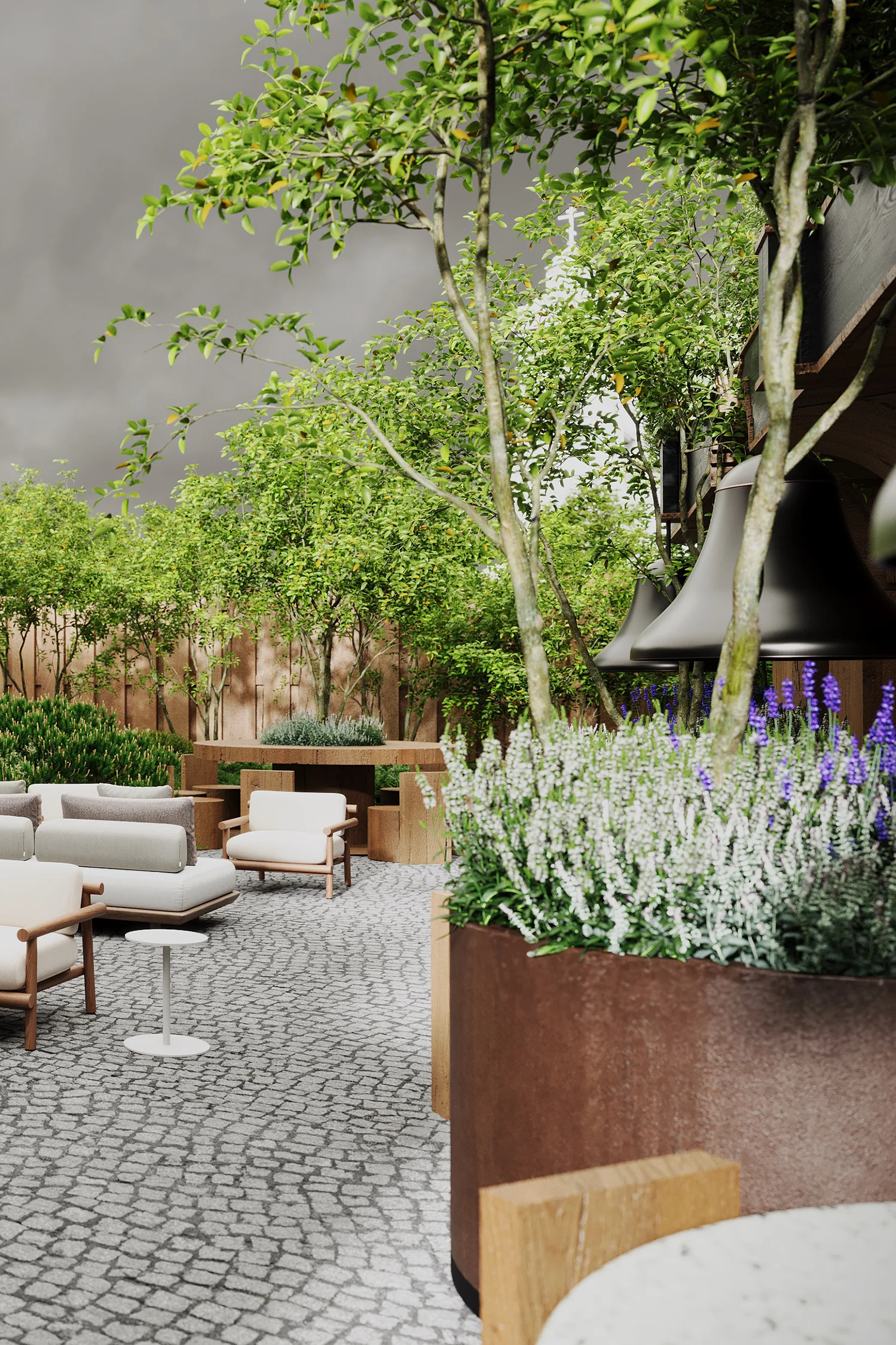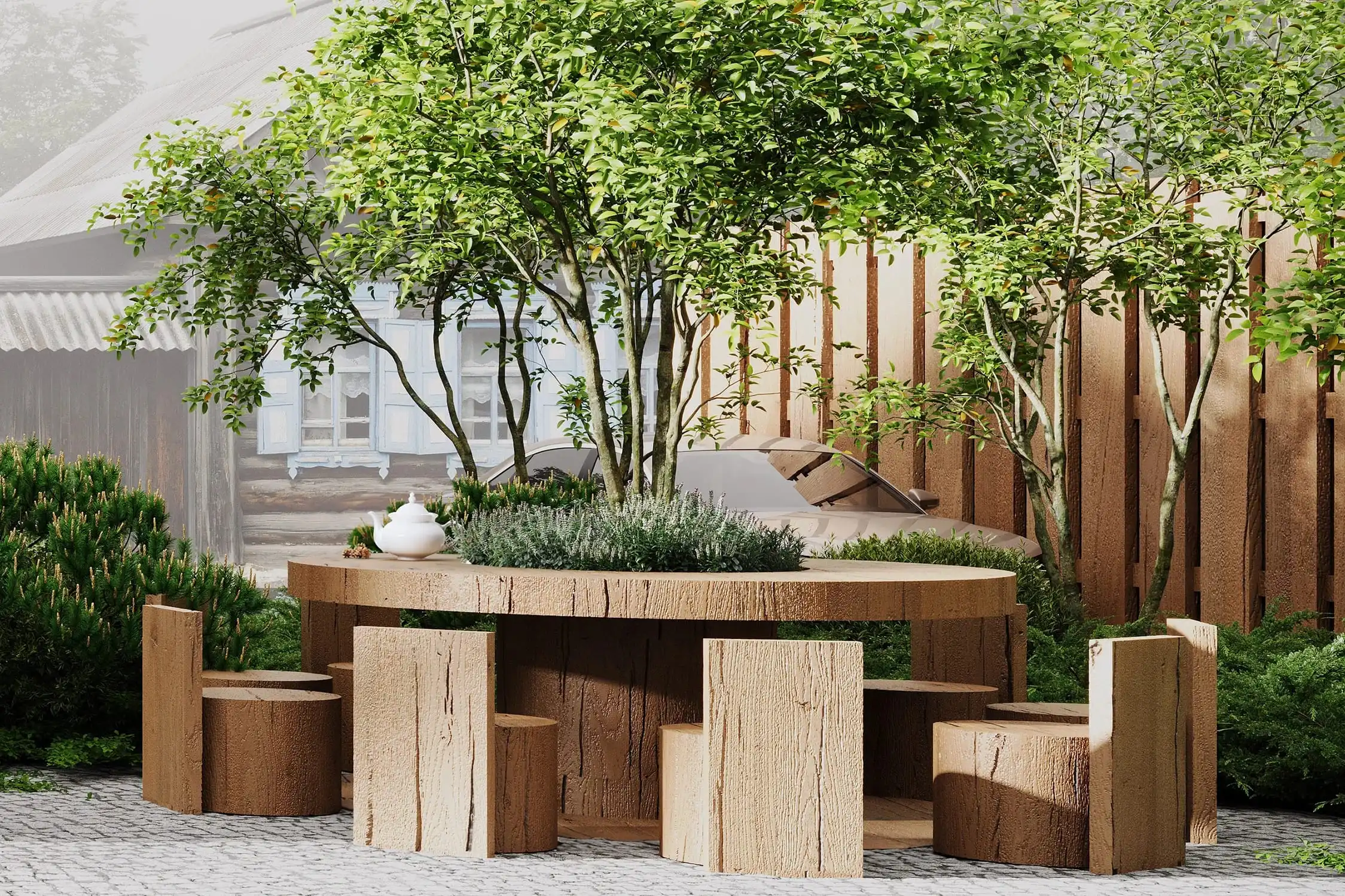 Для церемониального чаепития мы придумали садовую комнату с круглым столом на 6-8 человек, в центре которого будет роскошная липа. Эту зону скроют лесные растения с северным характером. Создать скандинавский ландшафт помогут высокие сосны и другие хвойные, средний ярус можжевельников и папоротников, а также декоративные мягкие мхи.
