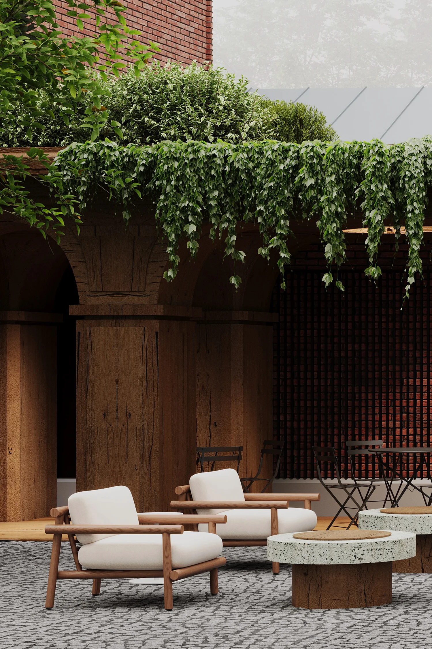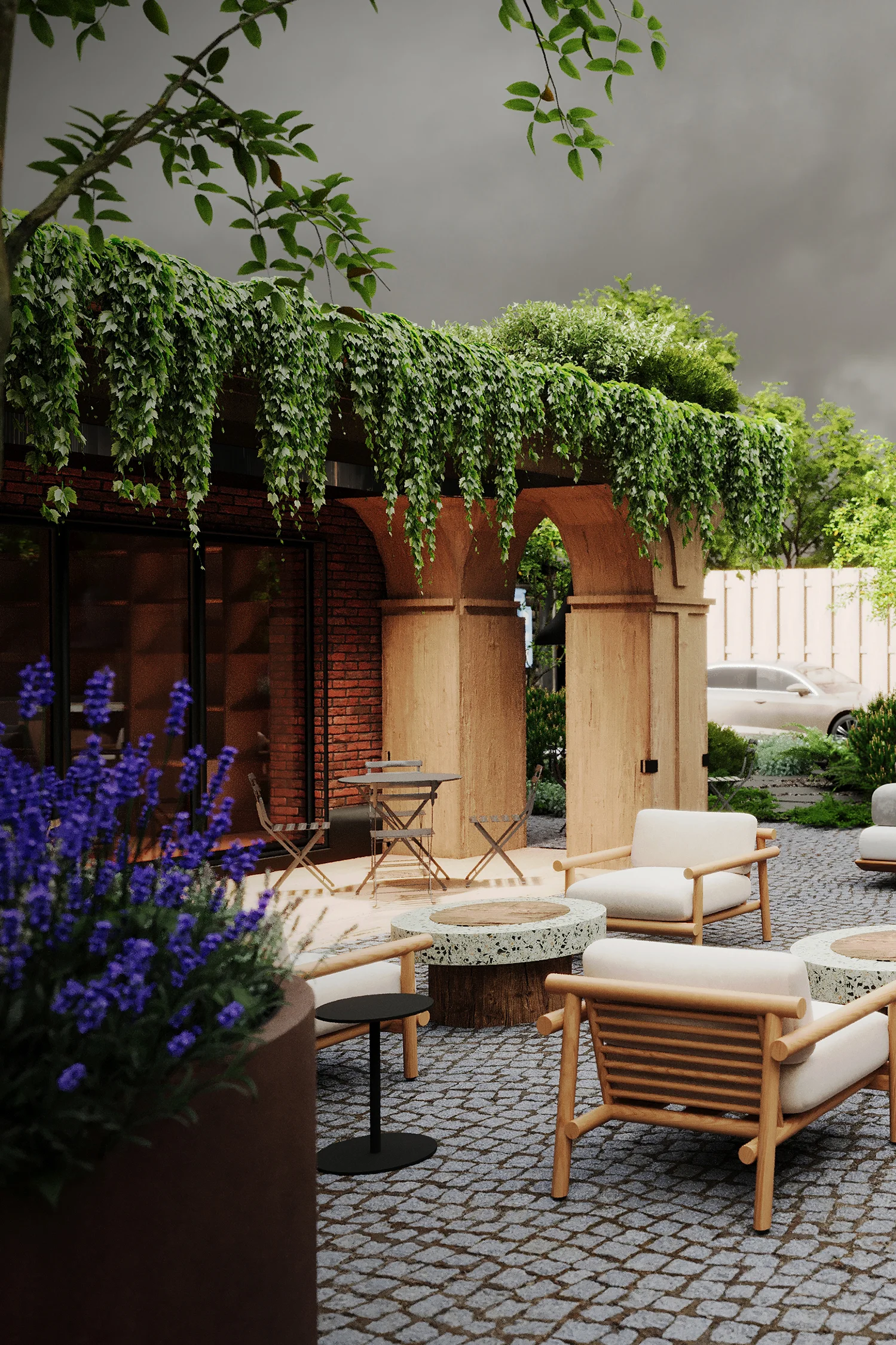Двор продуман для разных компаний. Тем, кто заглянул ненадолго, будет уютно в альковах. К долгим чаепитиям, чтению и беседам располагают низкие кресла под небом. За большим столом удобно устроиться вокруг самовара.