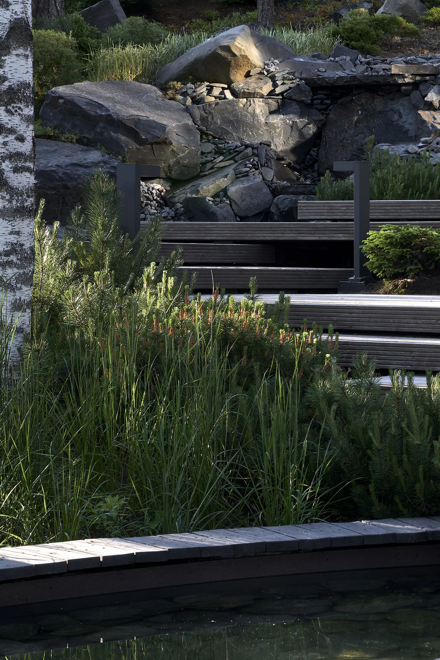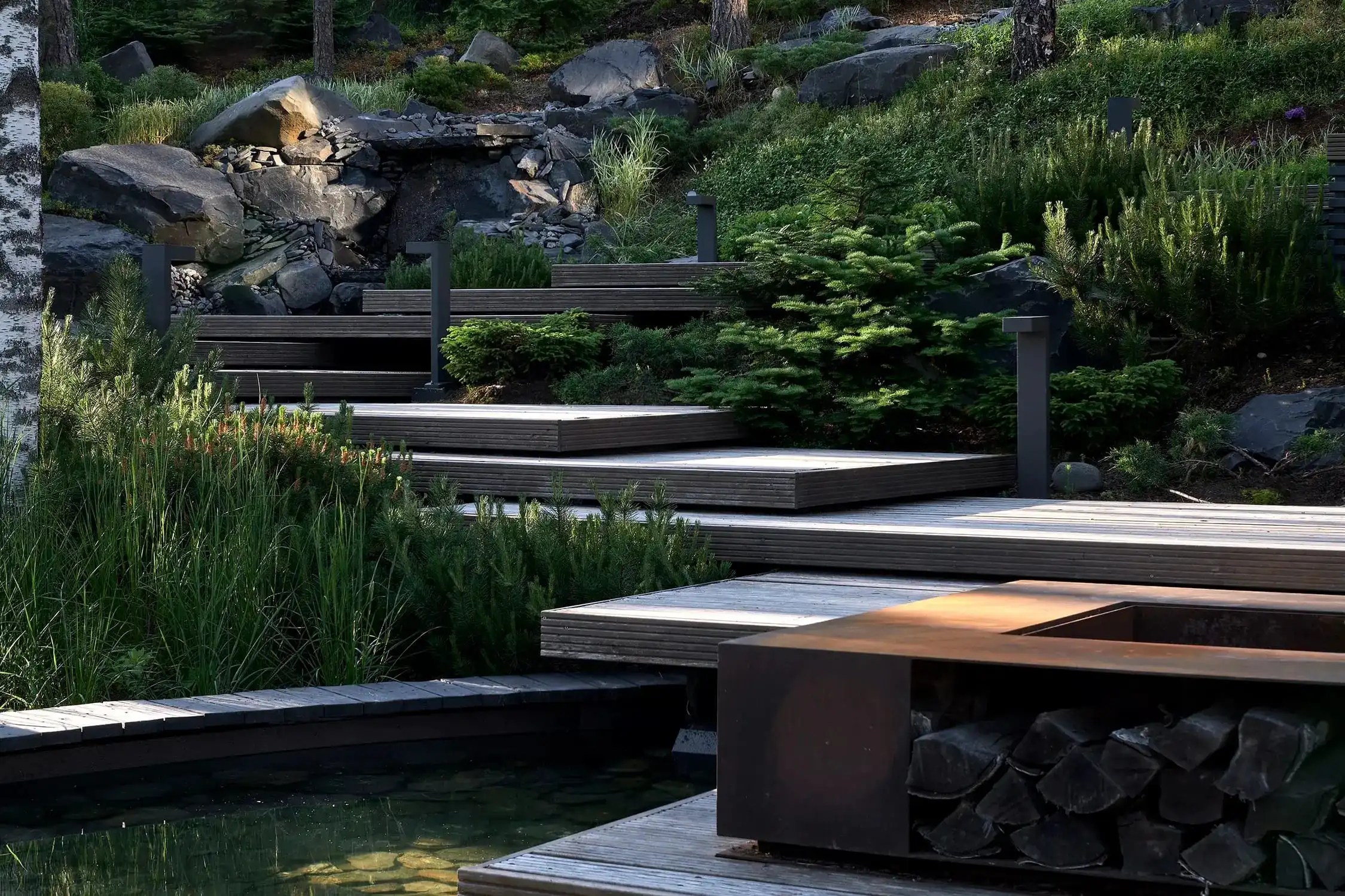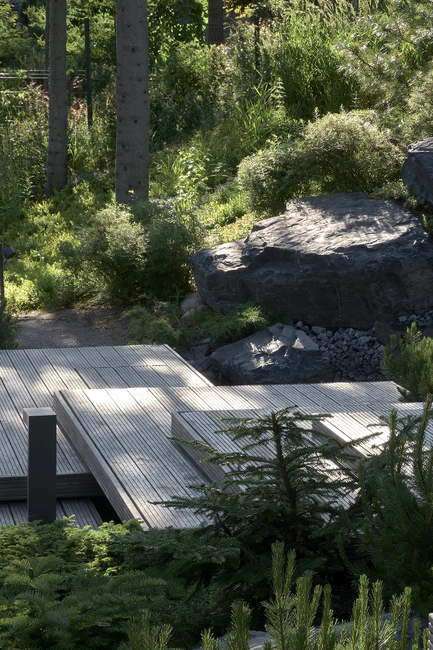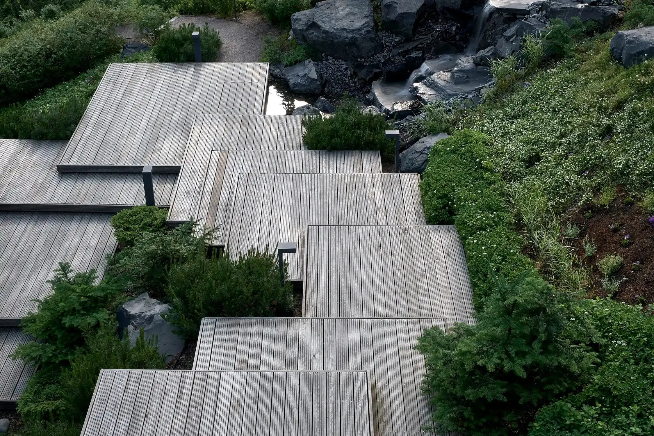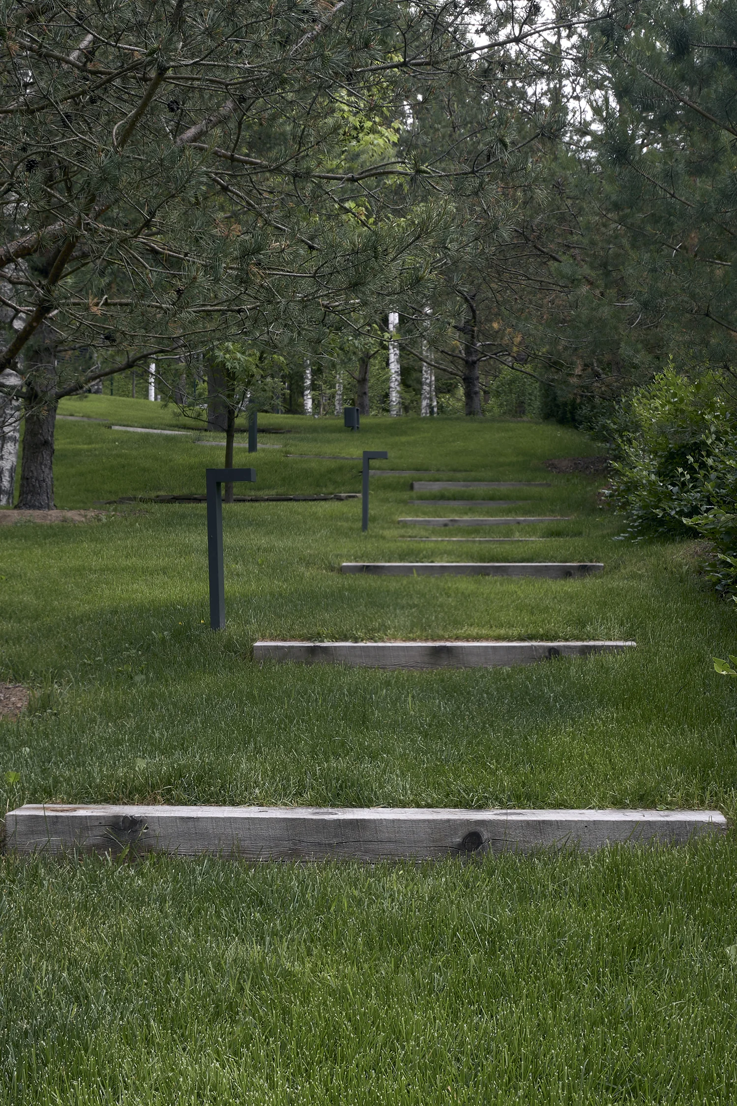 По склону с небольшим уклоном направление подчёркивают ступени-брусья, едва проглядывающие из травы — эта пошаговая тропа более декоративна. Наименее нагруженный переход от бани с купелью к очагу, окружённому прудом, составлен из деревянных платформ. Для круглогодичного удобства часть переходов сделали с подогревом.