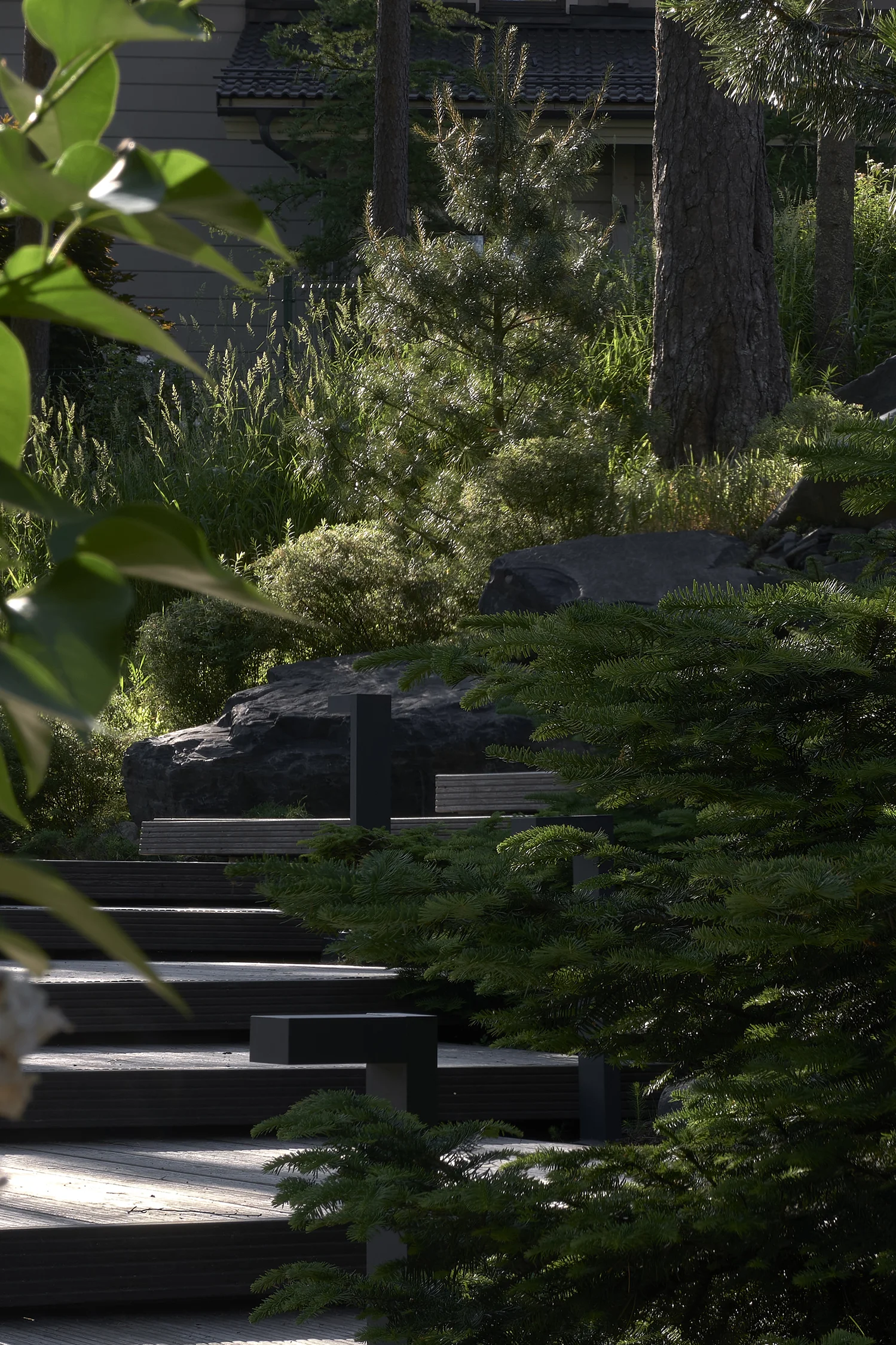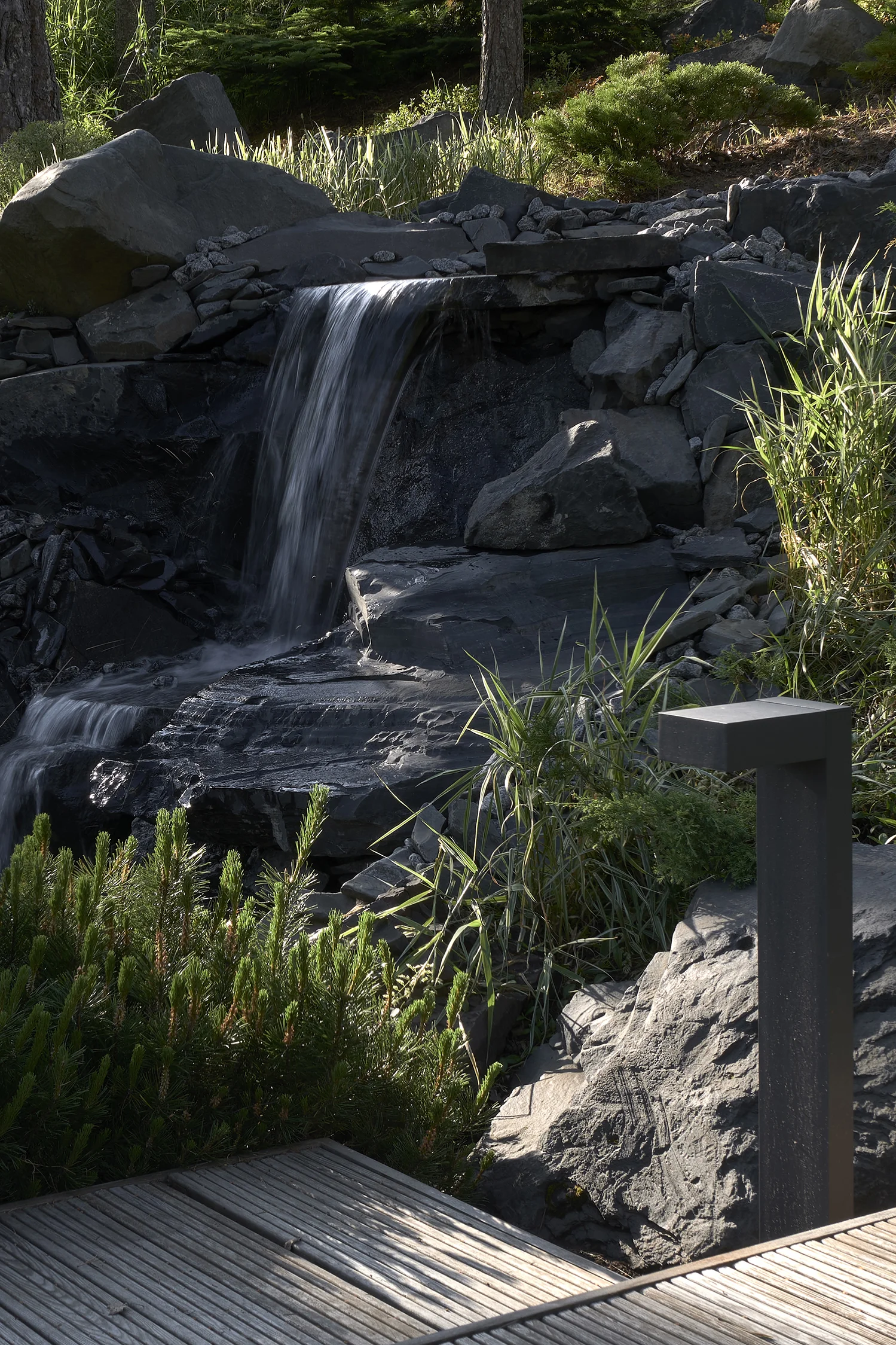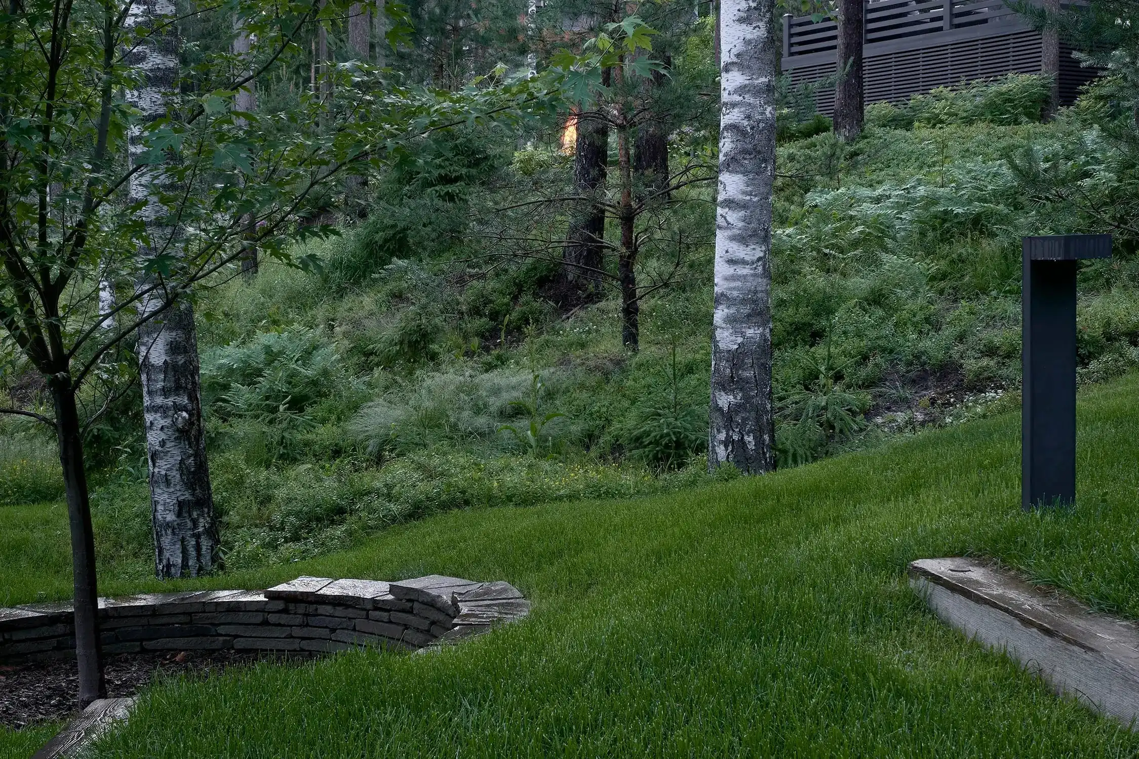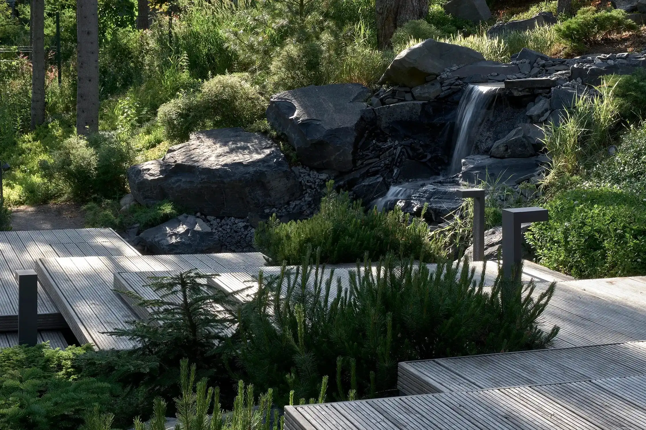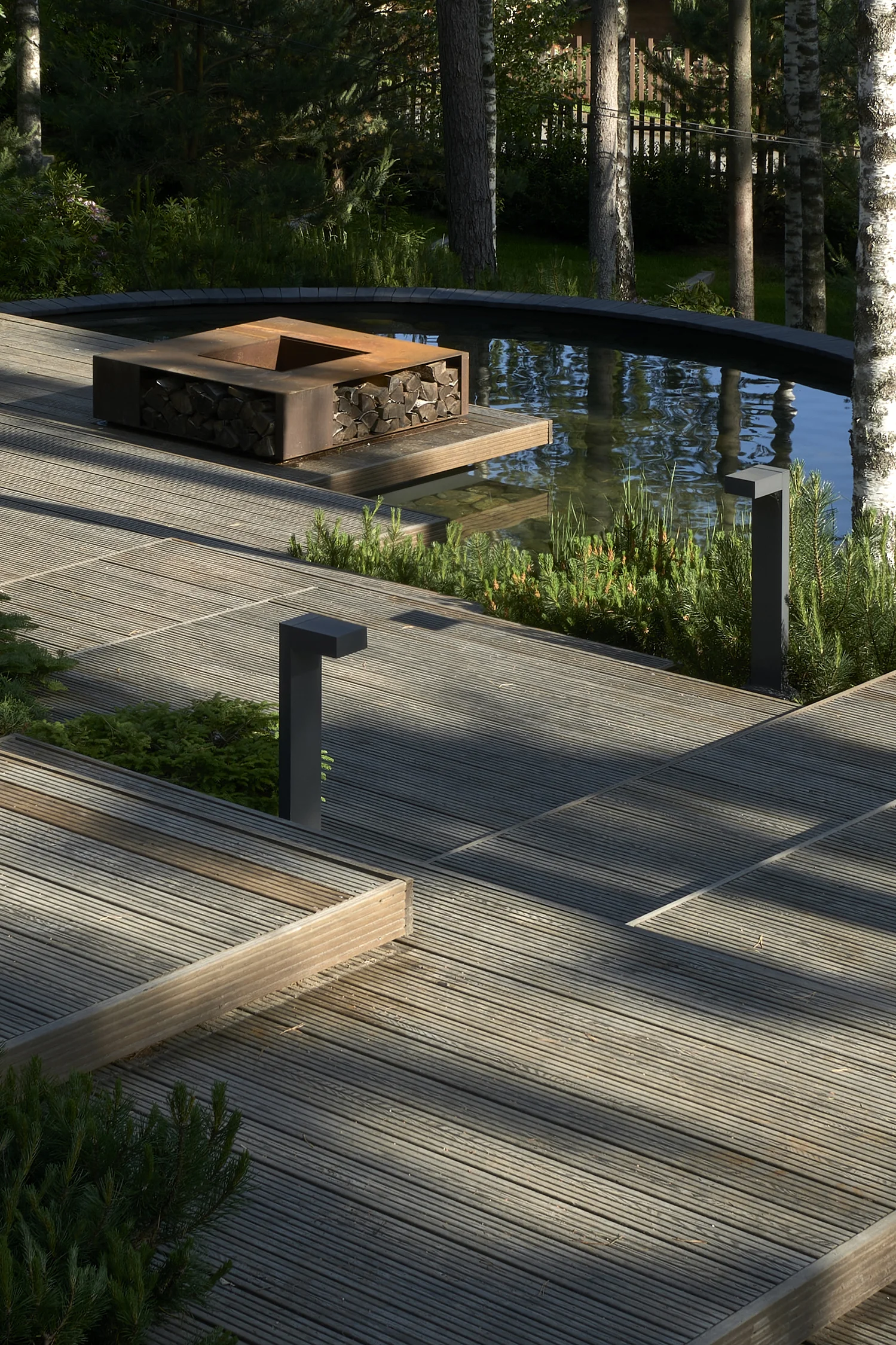 По склону с небольшим уклоном направление подчёркивают ступени-брусья, едва проглядывающие из травы — эта пошаговая тропа более декоративна. Наименее нагруженный переход от бани с купелью к очагу, окружённому прудом, составлен из деревянных платформ. Для круглогодичного удобства часть переходов сделали с подогревом.
