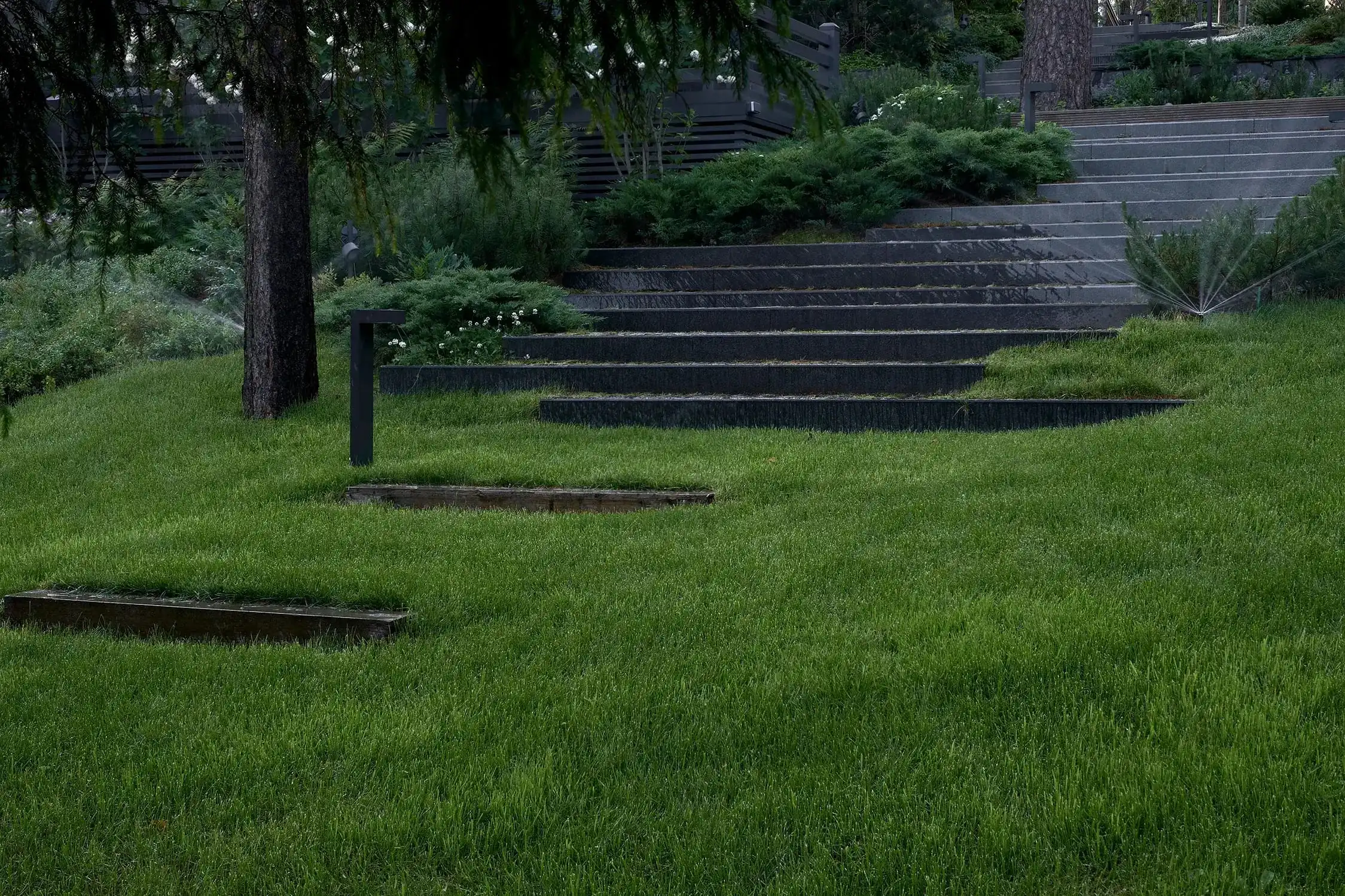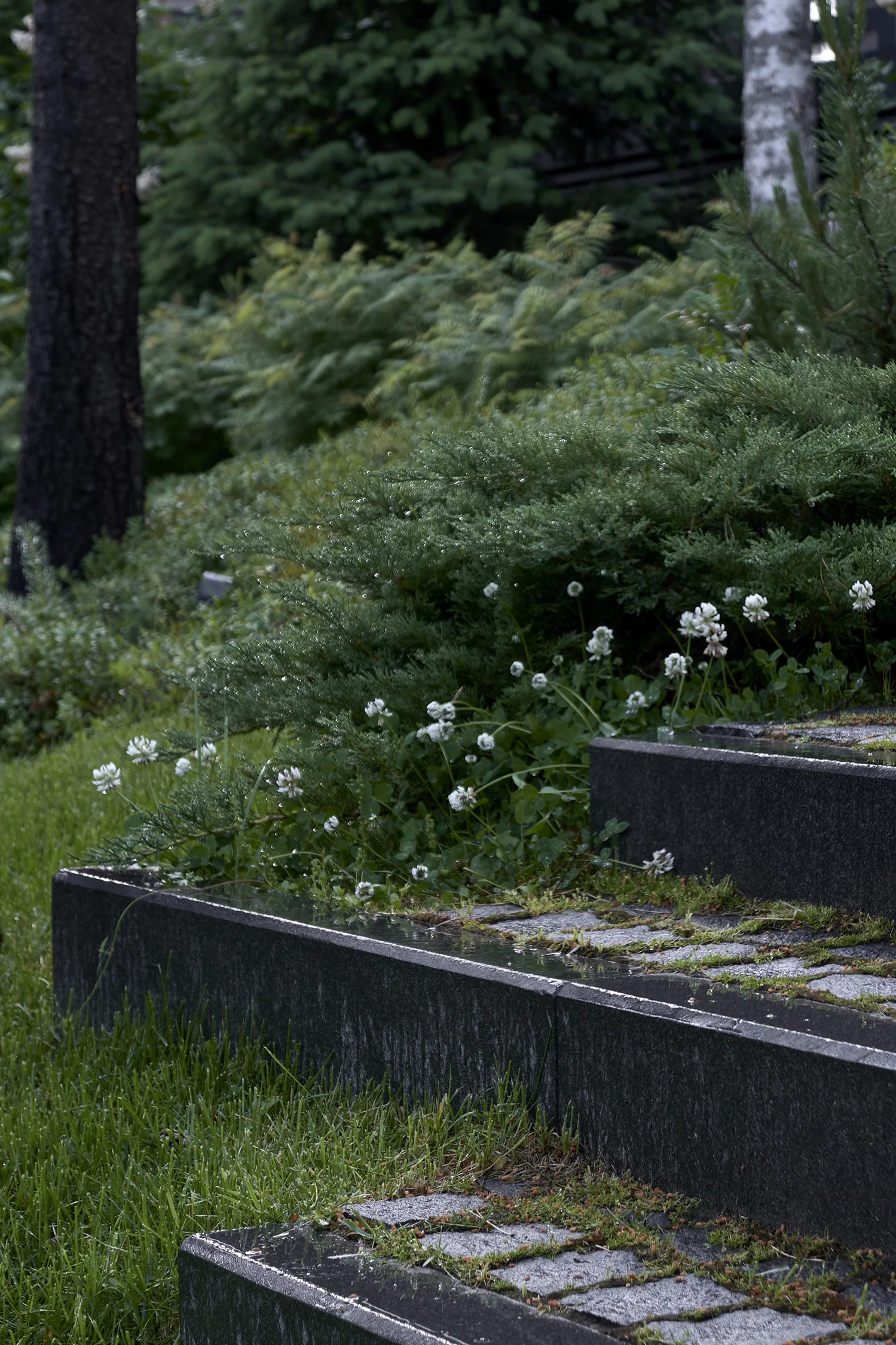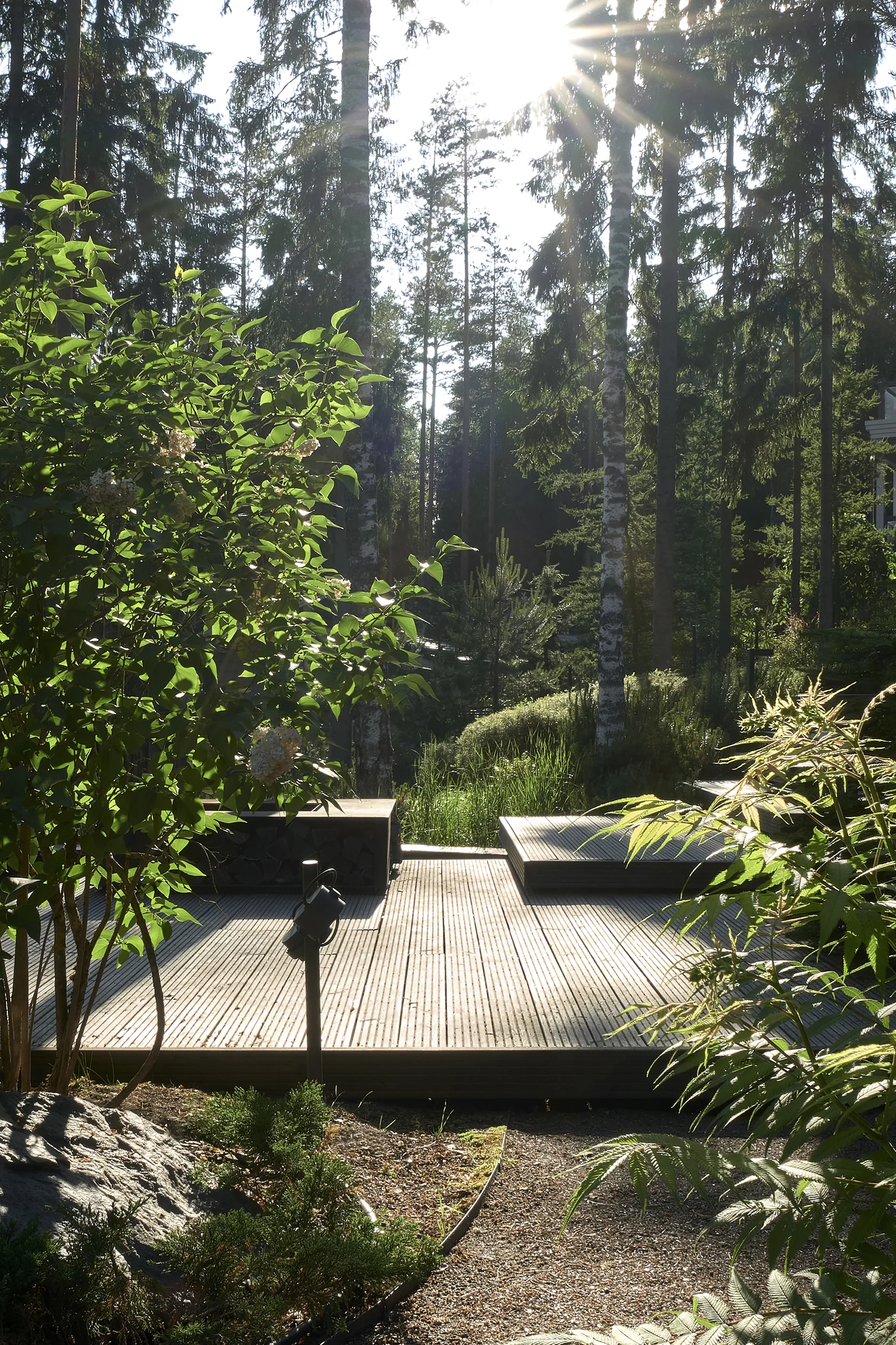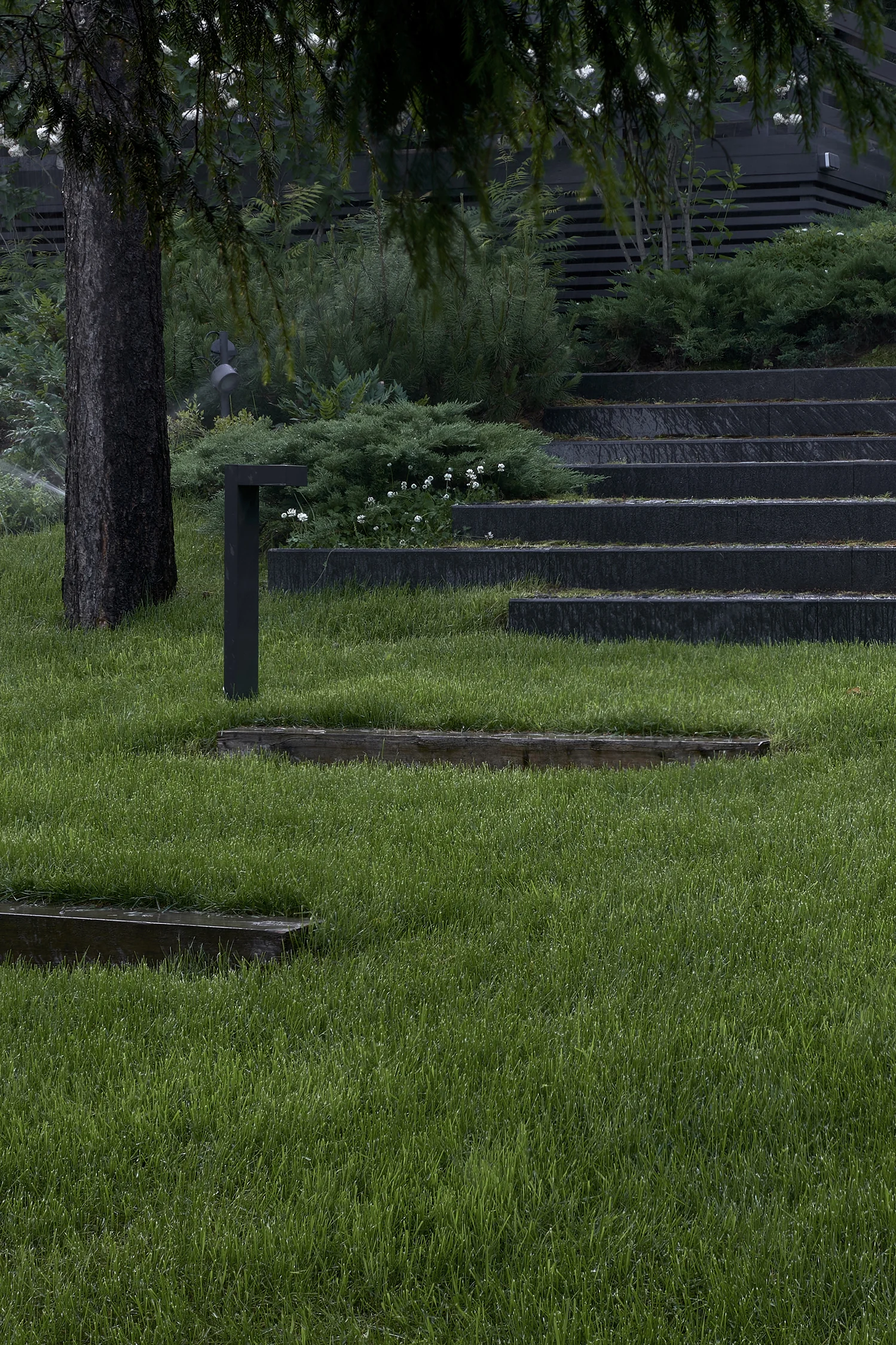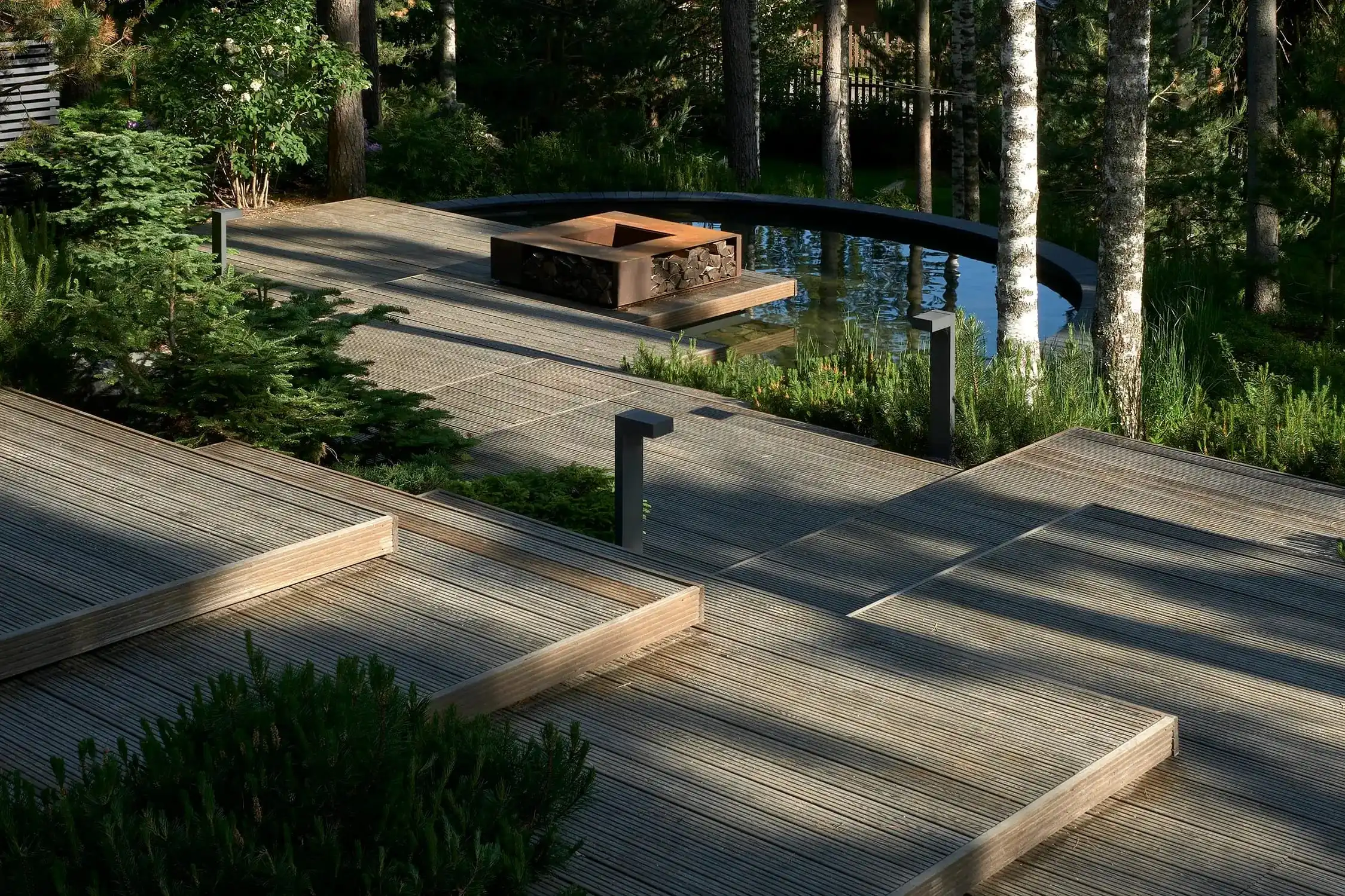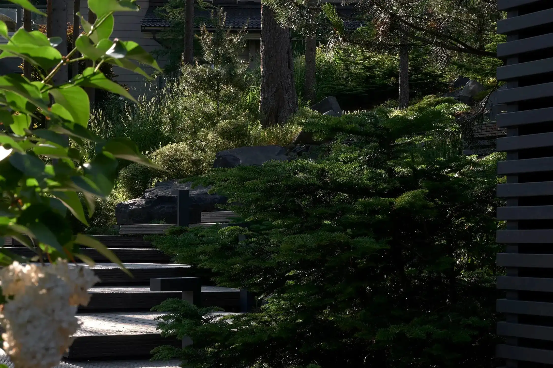 По склону с небольшим уклоном направление подчёркивают ступени-брусья, едва проглядывающие из травы — эта пошаговая тропа более декоративна. Наименее нагруженный переход от бани с купелью к очагу, окружённому прудом, составлен из деревянных платформ. Для круглогодичного удобства часть переходов сделали с подогревом.