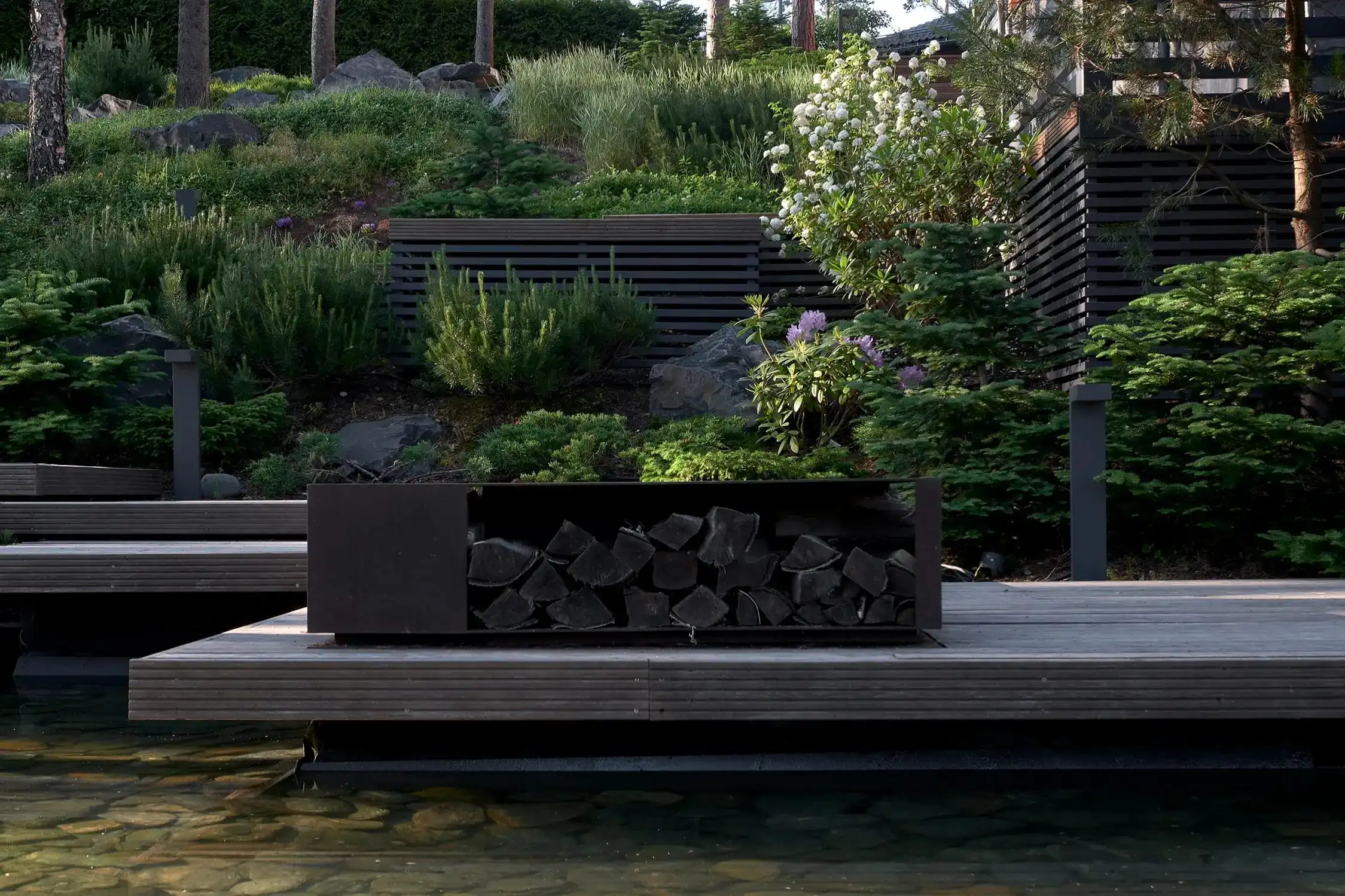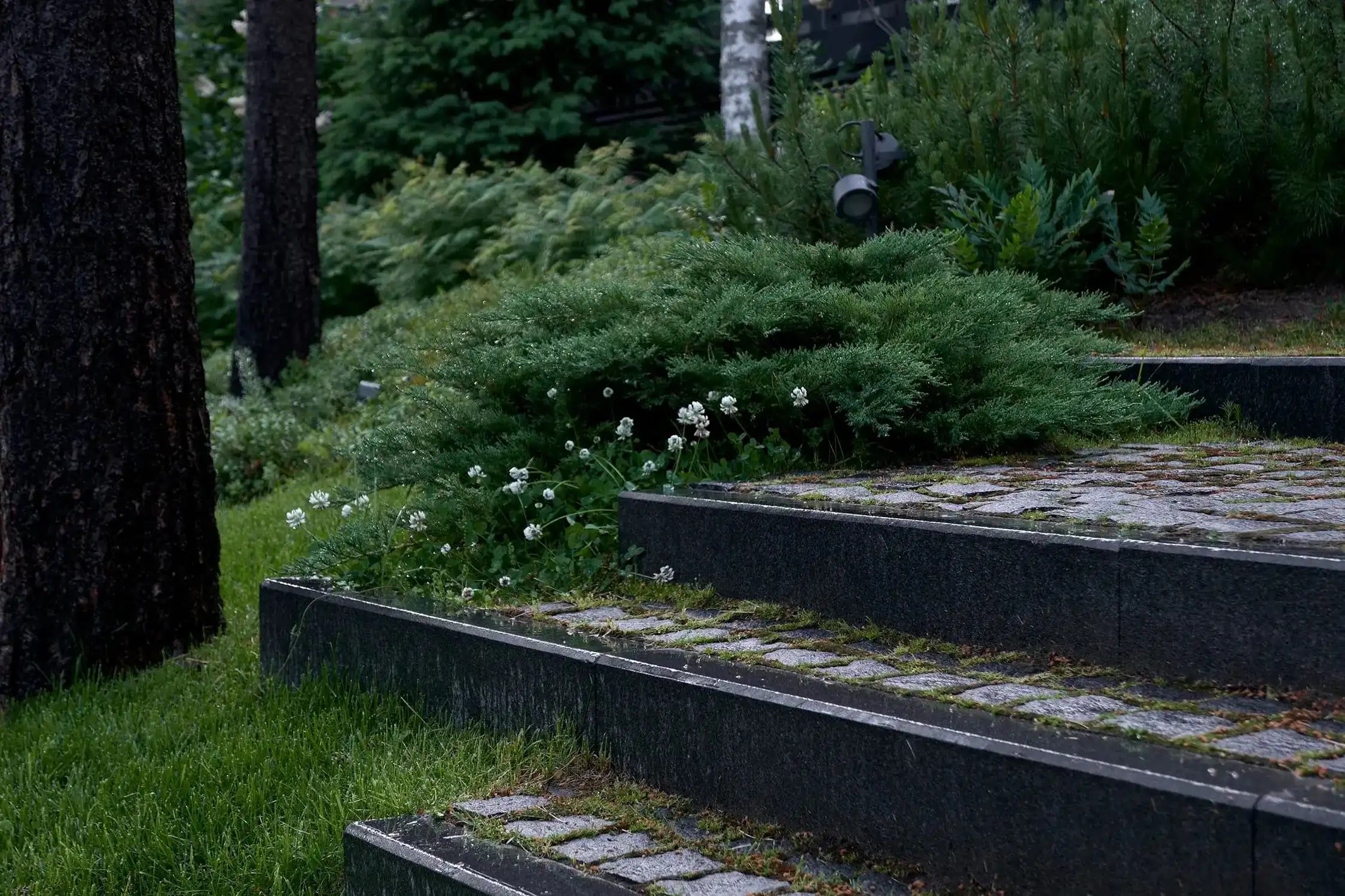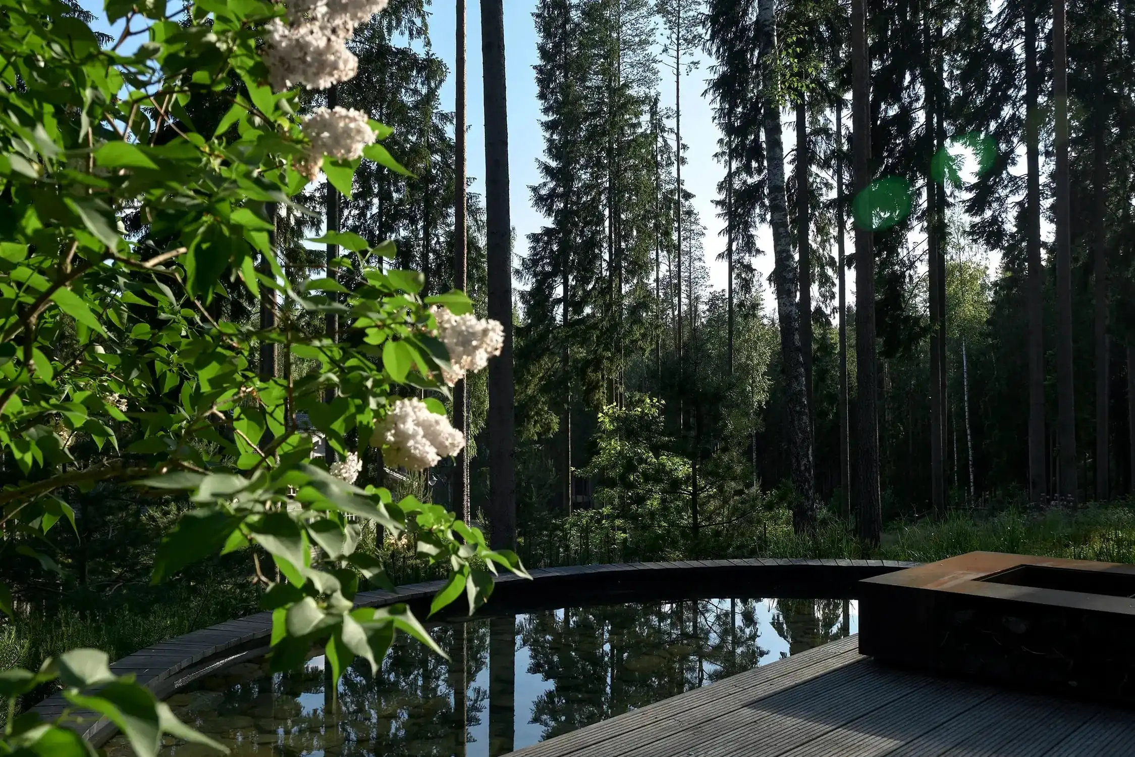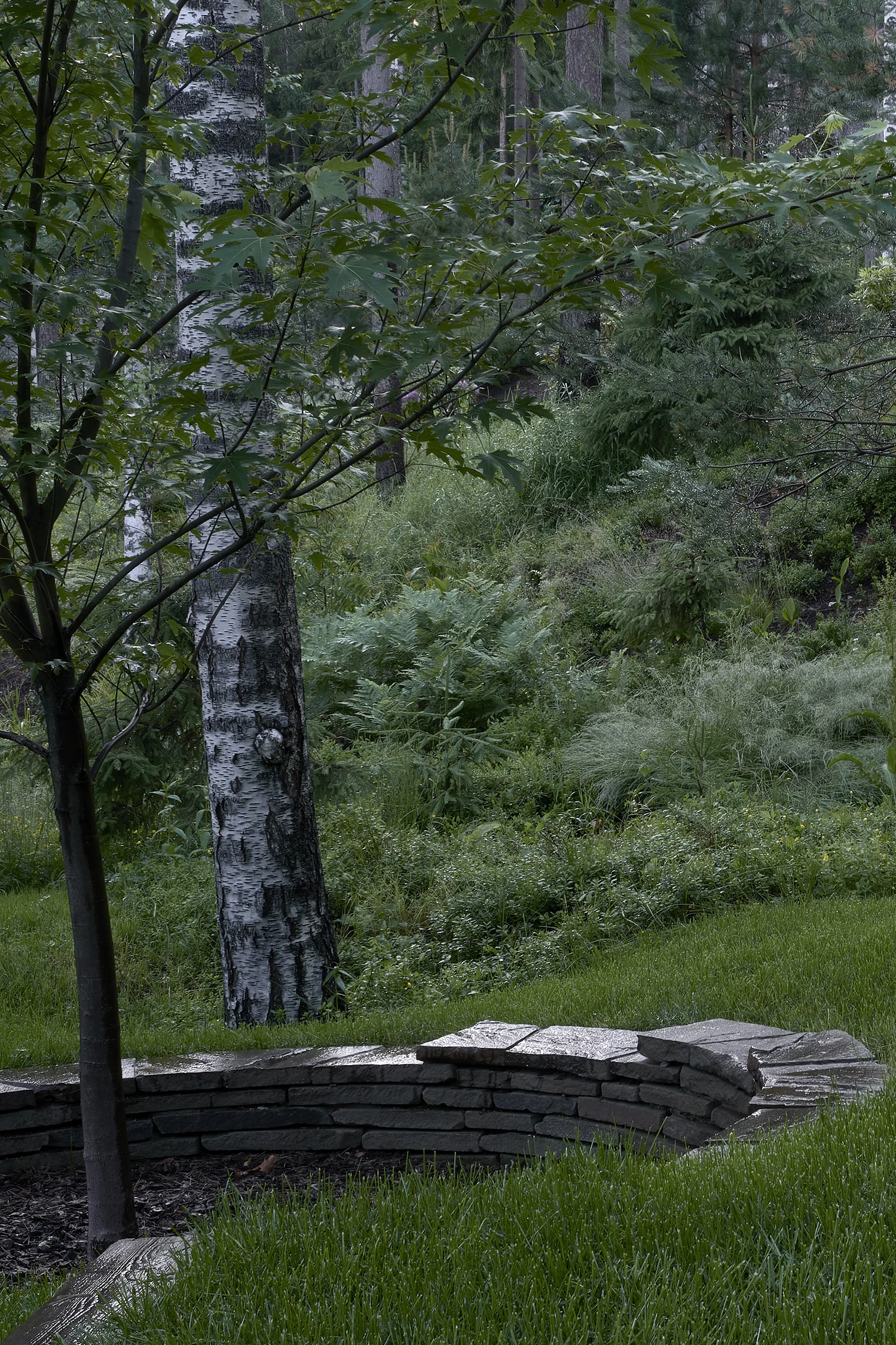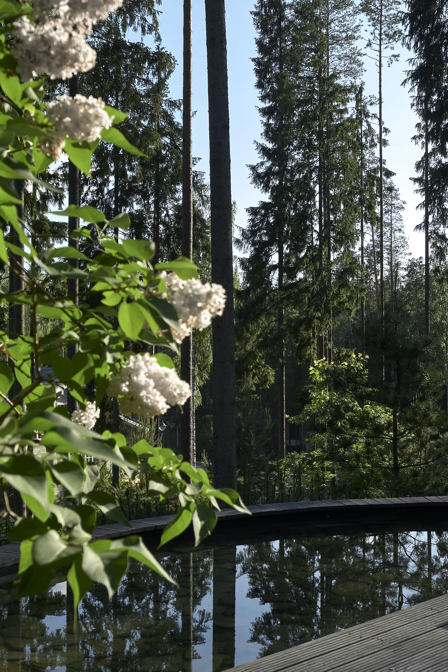 По склону с небольшим уклоном направление подчёркивают ступени-брусья, едва проглядывающие из травы — эта пошаговая тропа более декоративна. Наименее нагруженный переход от бани с купелью к очагу, окружённому прудом, составлен из деревянных платформ. Для круглогодичного удобства часть переходов сделали с подогревом.