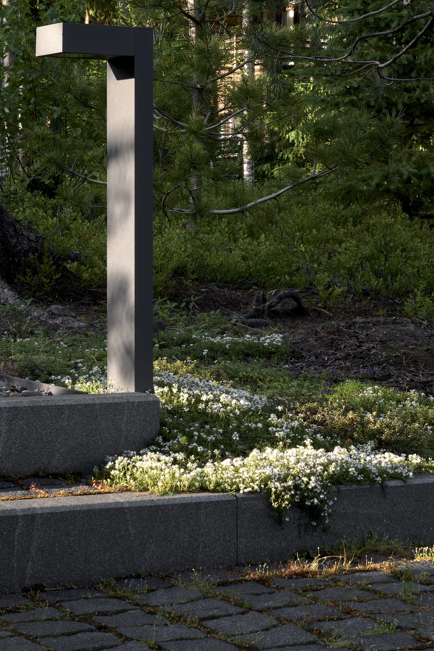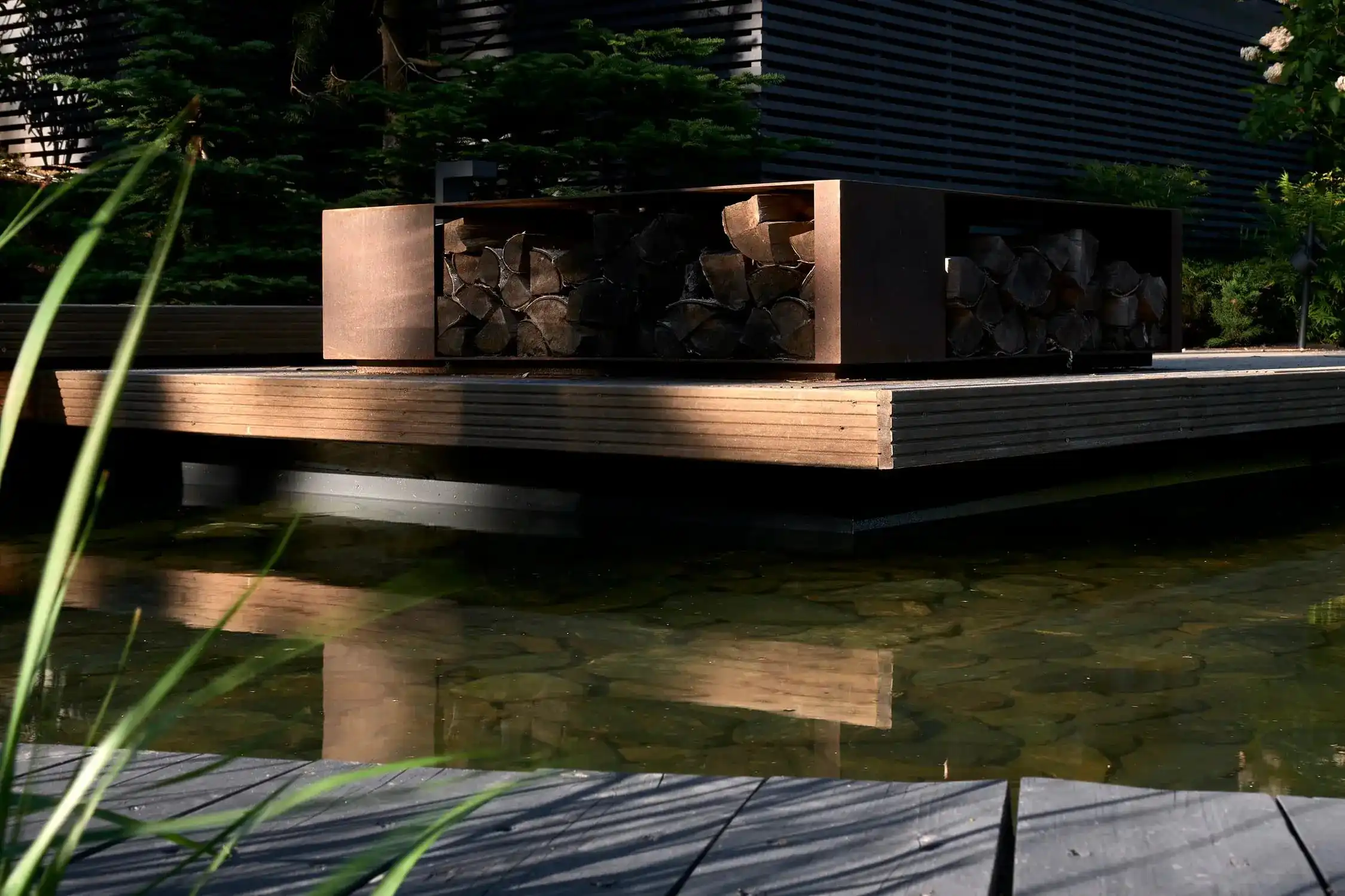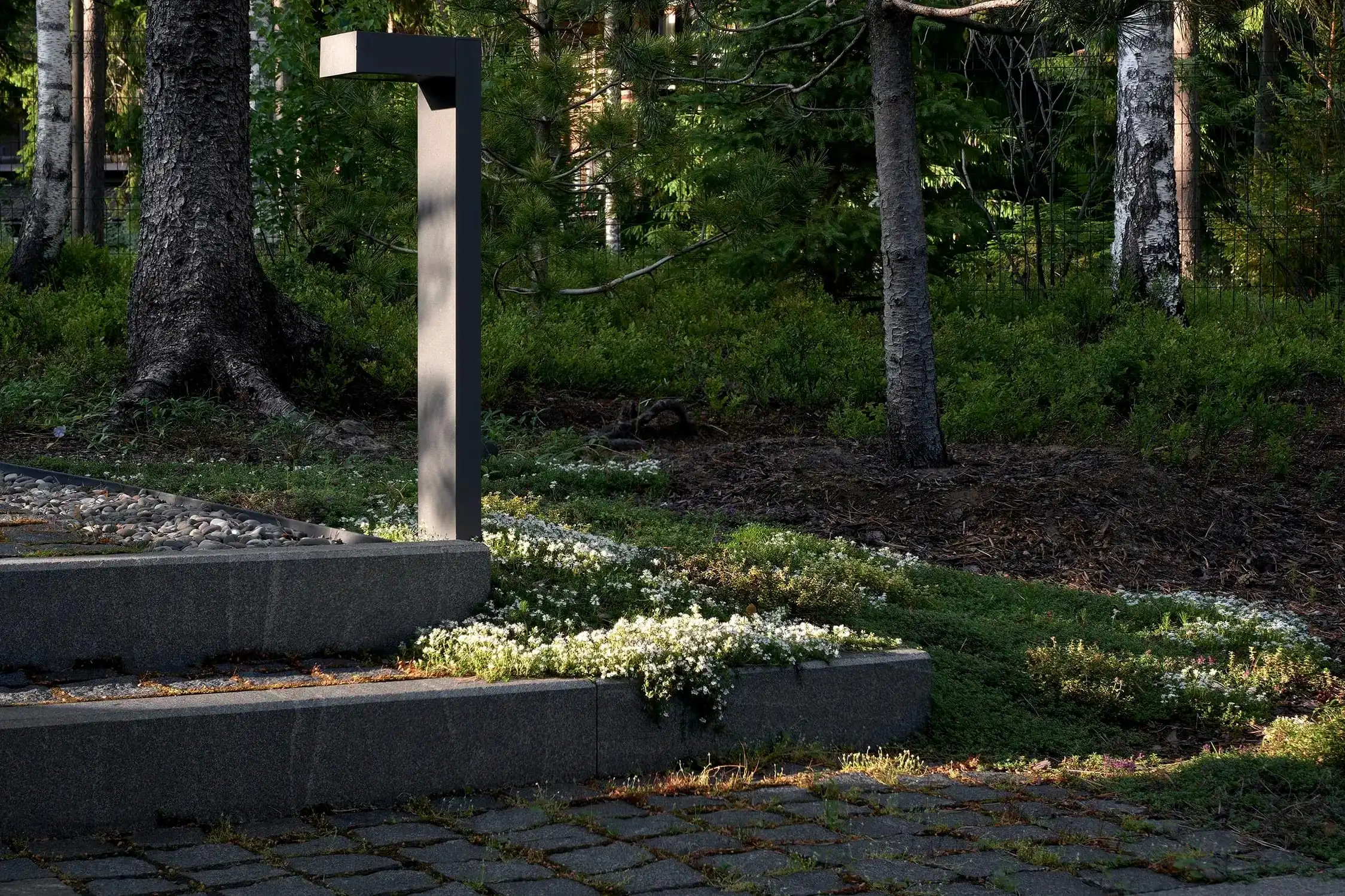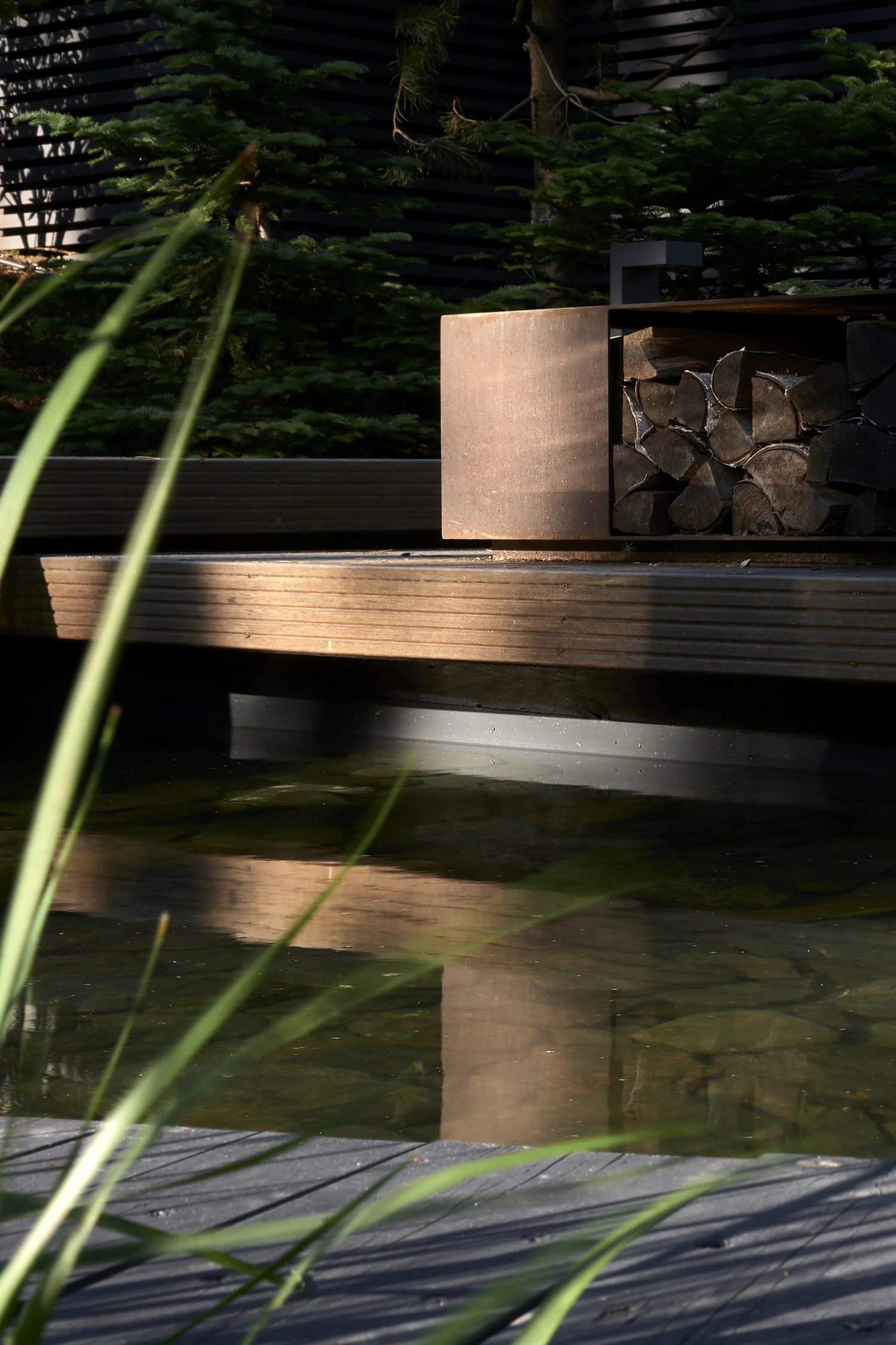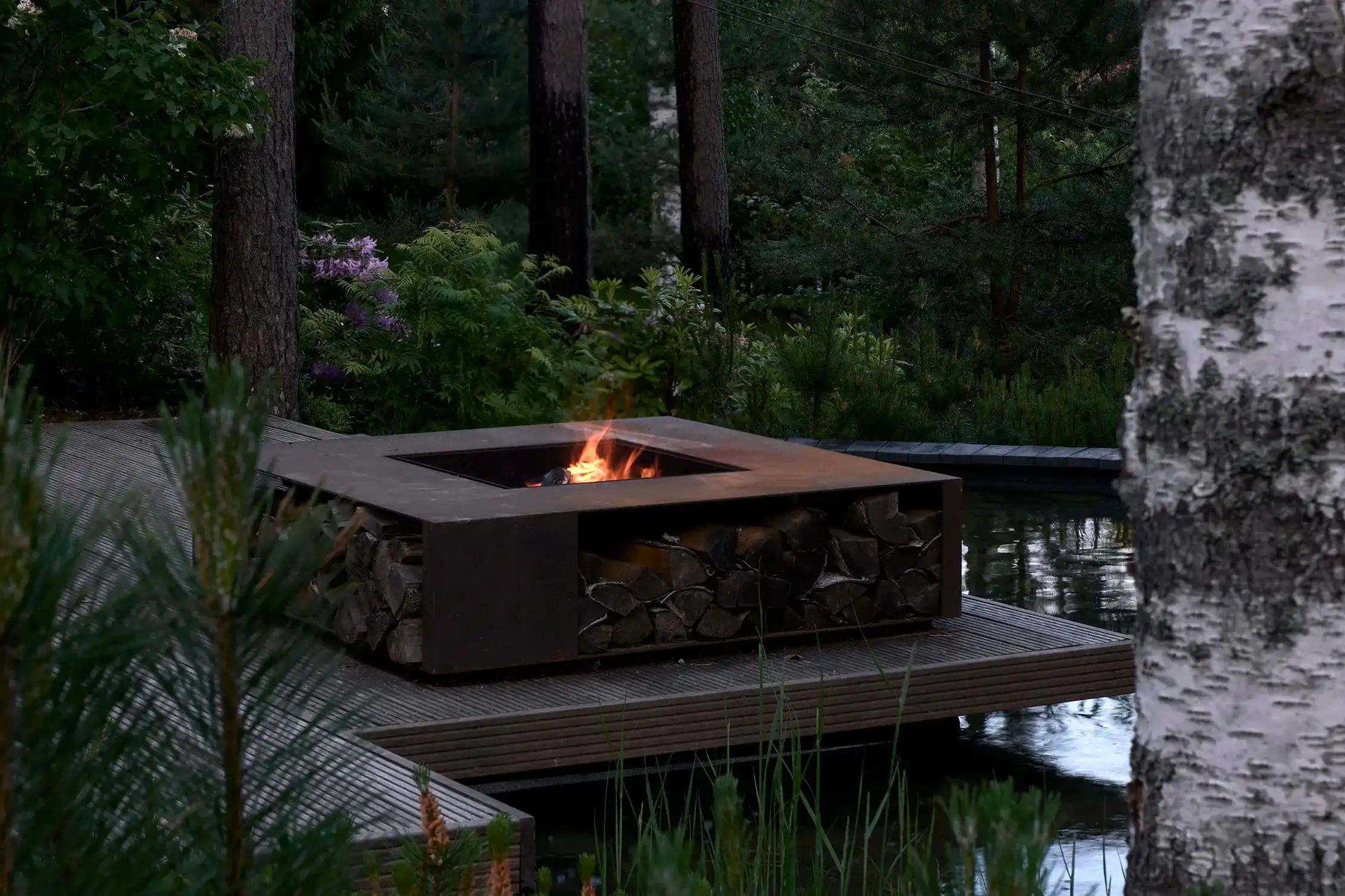 По склону с небольшим уклоном направление подчёркивают ступени-брусья, едва проглядывающие из травы — эта пошаговая тропа более декоративна. Наименее нагруженный переход от бани с купелью к очагу, окружённому прудом, составлен из деревянных платформ. Для круглогодичного удобства часть переходов сделали с подогревом.