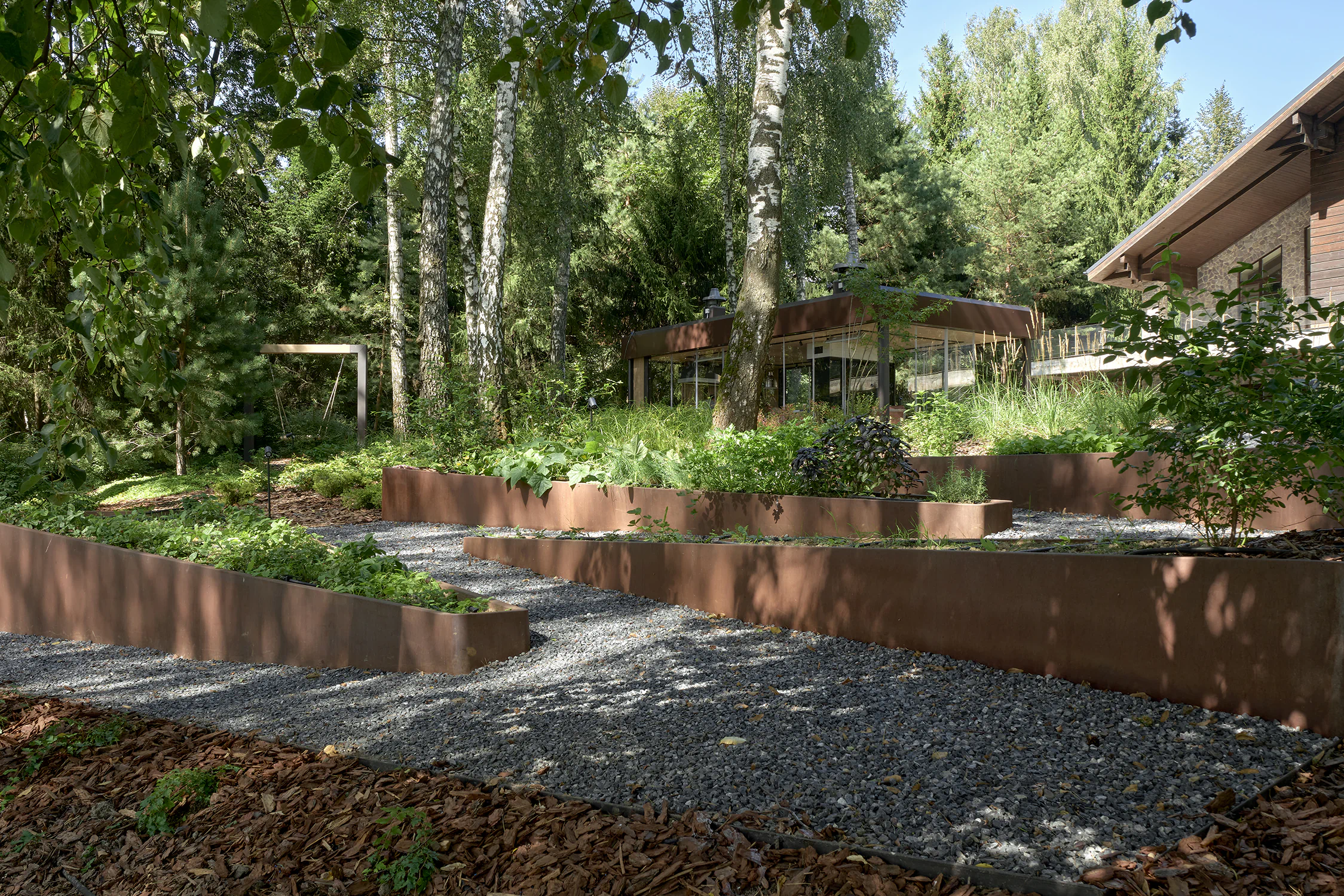 Одно из неожиданных решений — декоративный огород на крутом склоне с автоматической системой полива. Его расположили вдоль пандусов из кортеновских каркасов — спускаясь к воде, можно с лёгкостью сорвать созревшие ягоды или же собрать свежую зелень к столу. При этом углы его фасок иллюзорны в своей остроте — их округлая форма при соприкосновении с нежной кожей человека не нанесёт повреждений.