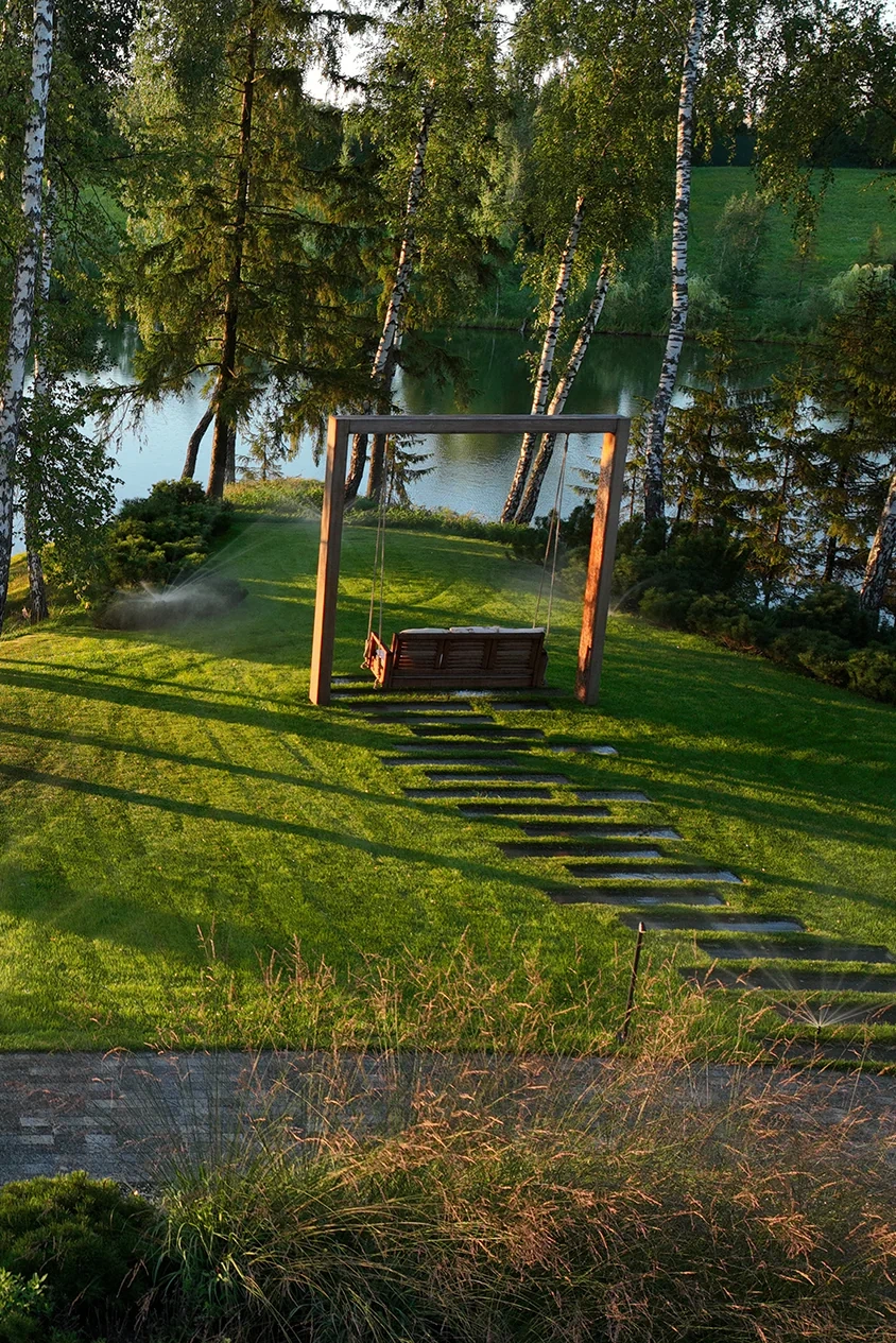 Необычный элемент сада — долина из цветов. Это маршрут для основного движения и в то же время дизайн, который связывает всё вместе. Она начинается от въезда в дом, проходит между главным домом, домом детей и выходит в овраг и далее спускается вниз к реке, формируя не только эстетику, но и обеспечивая биодренаж. Также на участке разместили плодовый сад, луговые и лесные растения, обеспечивающие непрерывное цветение в разные периоды года.