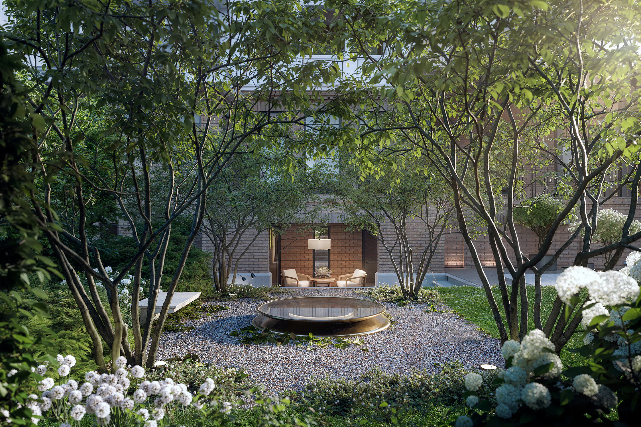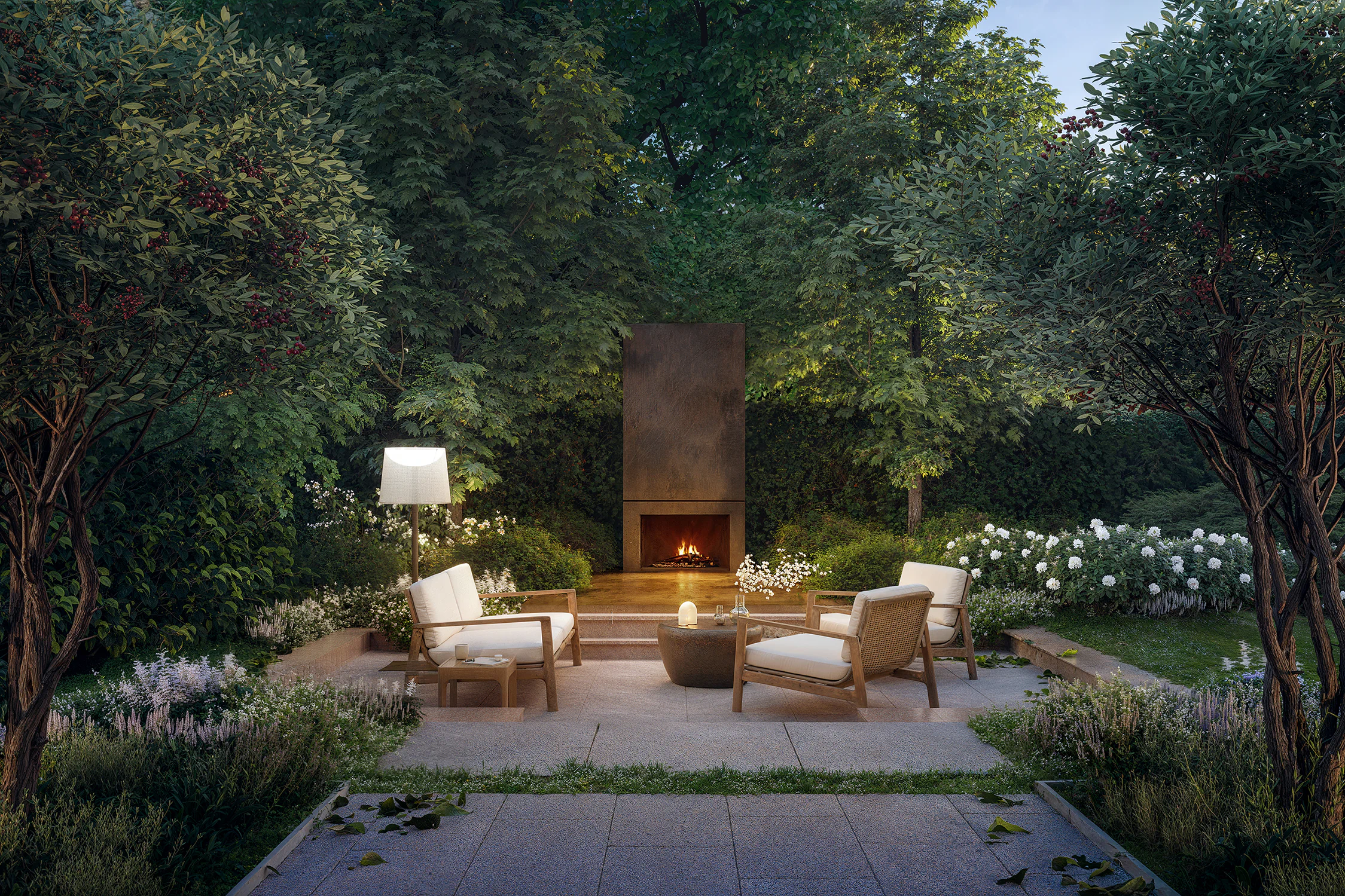 В укромной зоне среди многовековых деревьев мы расположили камин – здесь можно собираться всей семьёй, вести долгие беседы вечерами и наблюдать за языками пламени, танцующими под успокаивающий треск поленьев. Территория обрамлена массивными деревьями с крупными раскидистыми кронами, отбрасывающими лёгкие полутени и дарящими прохладу в знойный день. На летней террасе мы установили округлый плоский фонтан: его водная гладь отражает солнечные лучи и разливается солнечными зайчиками по всему участку. Они играют с симметрично расположенными вокруг деревьями и рисуют на них причудливые узоры.