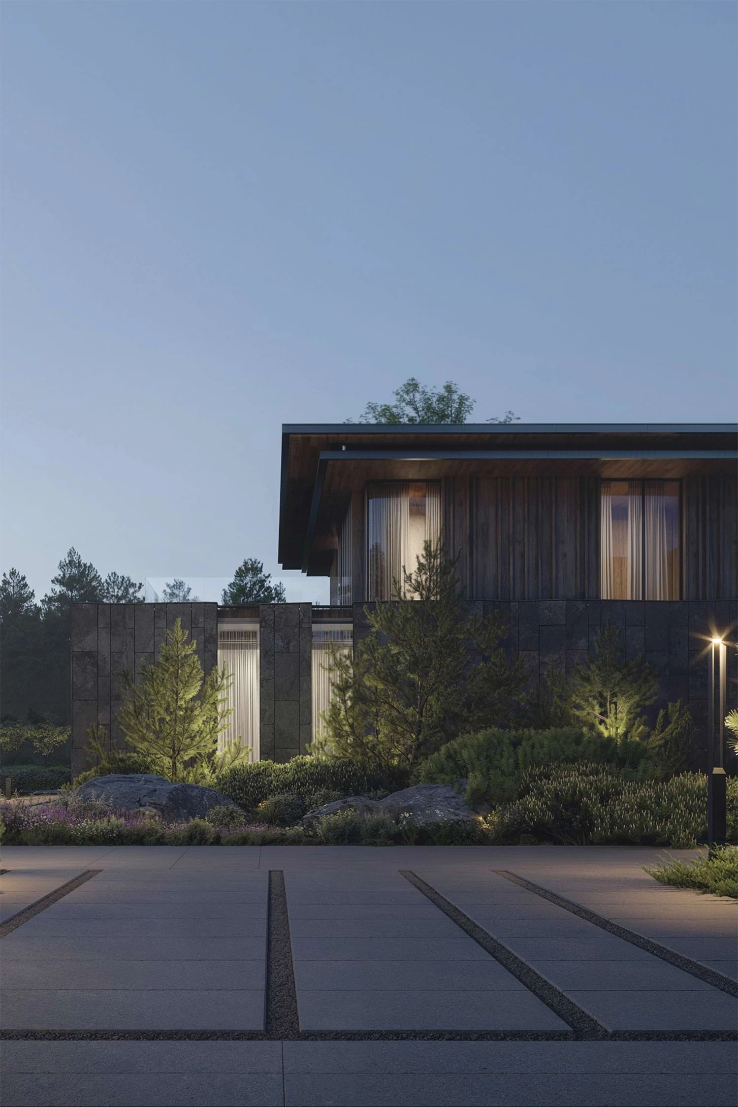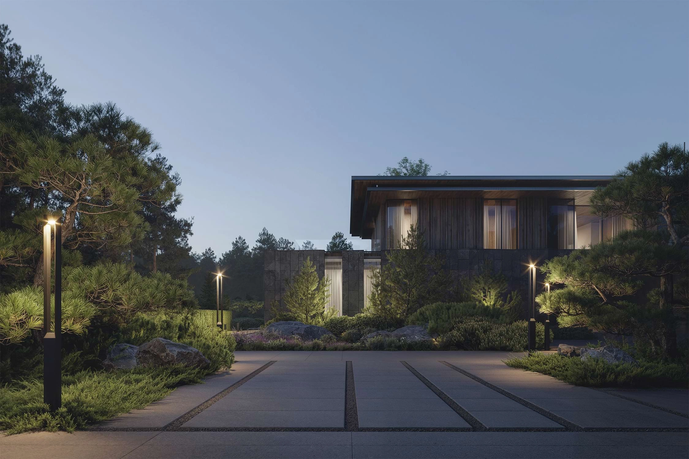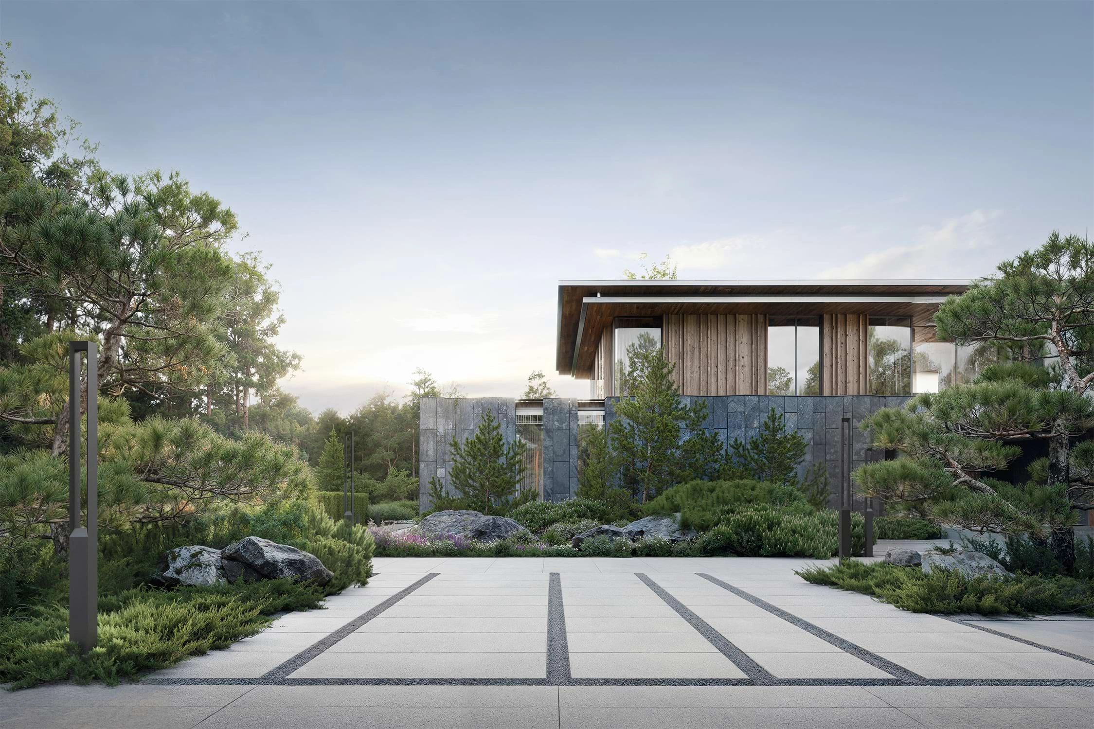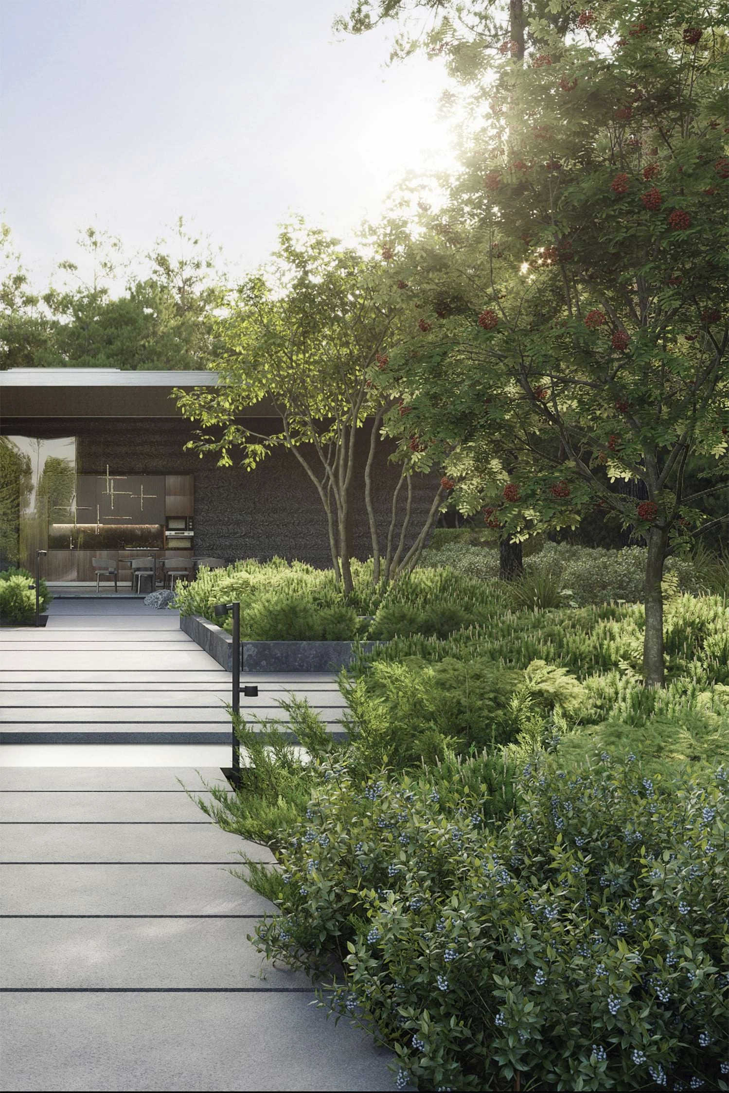 Дом, внушительный по масштабу, органично вписан в природу. Сад не противостоит зданию, а обнимает его, смягчает, превращая в часть живого пейзажа. Маршрут по саду охватывает разные зоны благоустройства с собственным характером, светом и настроением. От парадного входа в строгом и лаконичном стиле до солнечного плодового сада и нуарного лиственного леса — на протяжении прогулки человек замедляется, останавливается, изучает, чувствует. Мы сознательно ломаем линейность участка, меняя покрытия, растительность, освещение и материалы, чтобы путь не казался бесконечным коридором, а раскрывался как череда неожиданных пейзажей.