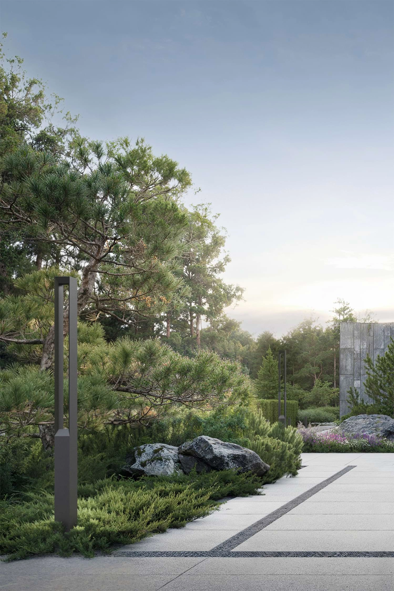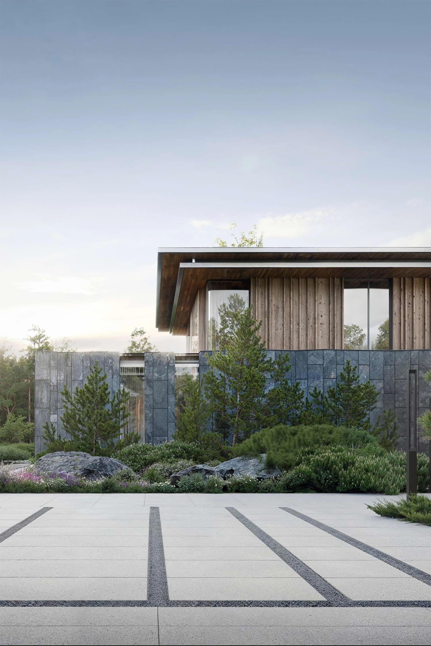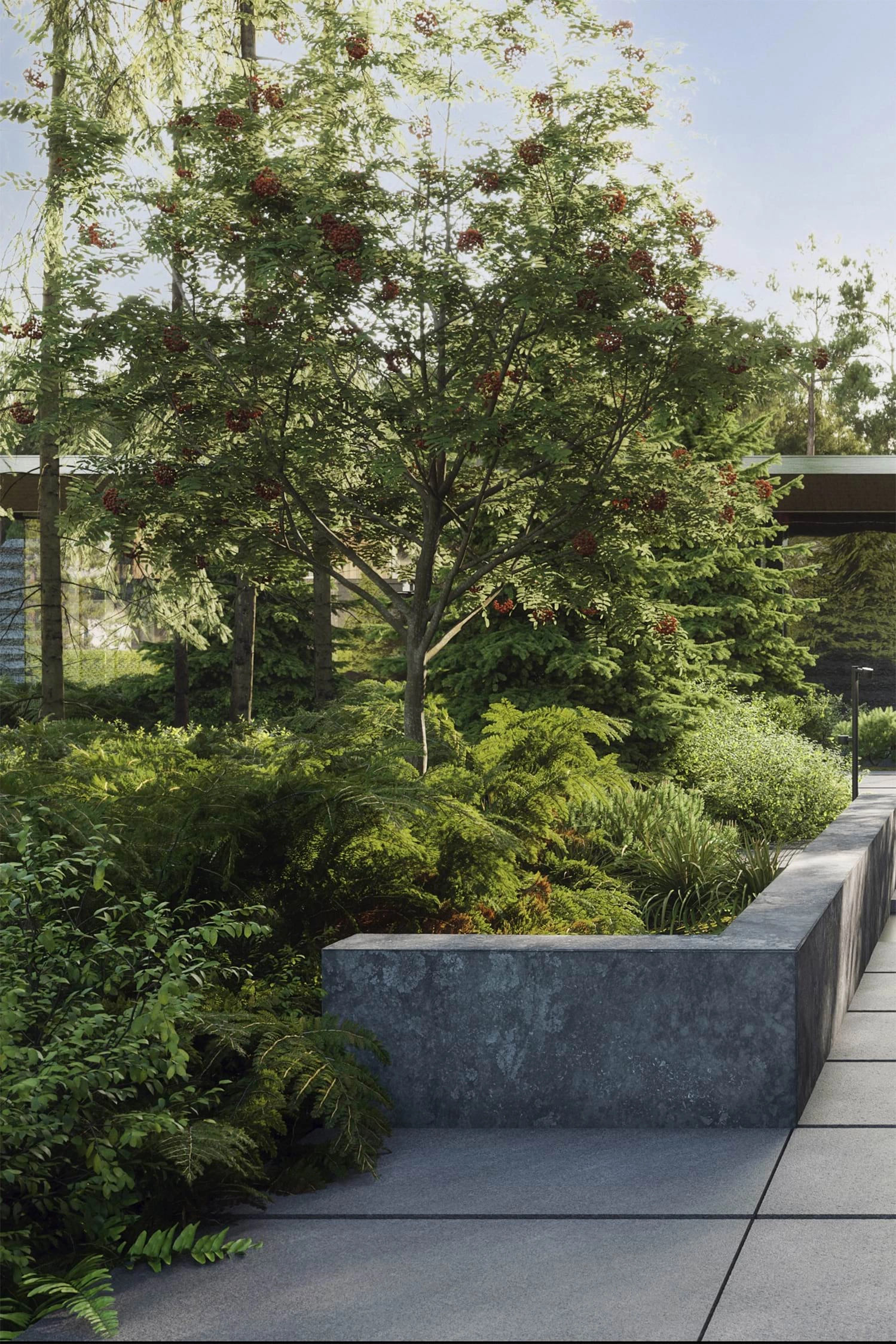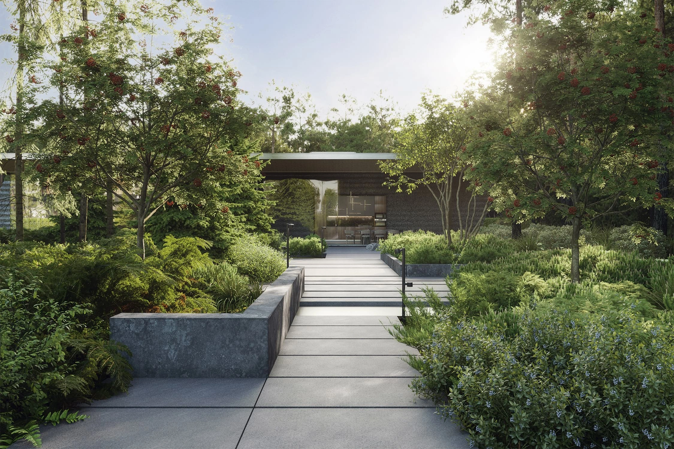 Дом, внушительный по масштабу, органично вписан в природу. Сад не противостоит зданию, а обнимает его, смягчает, превращая в часть живого пейзажа. Маршрут по саду охватывает разные зоны благоустройства с собственным характером, светом и настроением. От парадного входа в строгом и лаконичном стиле до солнечного плодового сада и нуарного лиственного леса — на протяжении прогулки человек замедляется, останавливается, изучает, чувствует. Мы сознательно ломаем линейность участка, меняя покрытия, растительность, освещение и материалы, чтобы путь не казался бесконечным коридором, а раскрывался как череда неожиданных пейзажей.