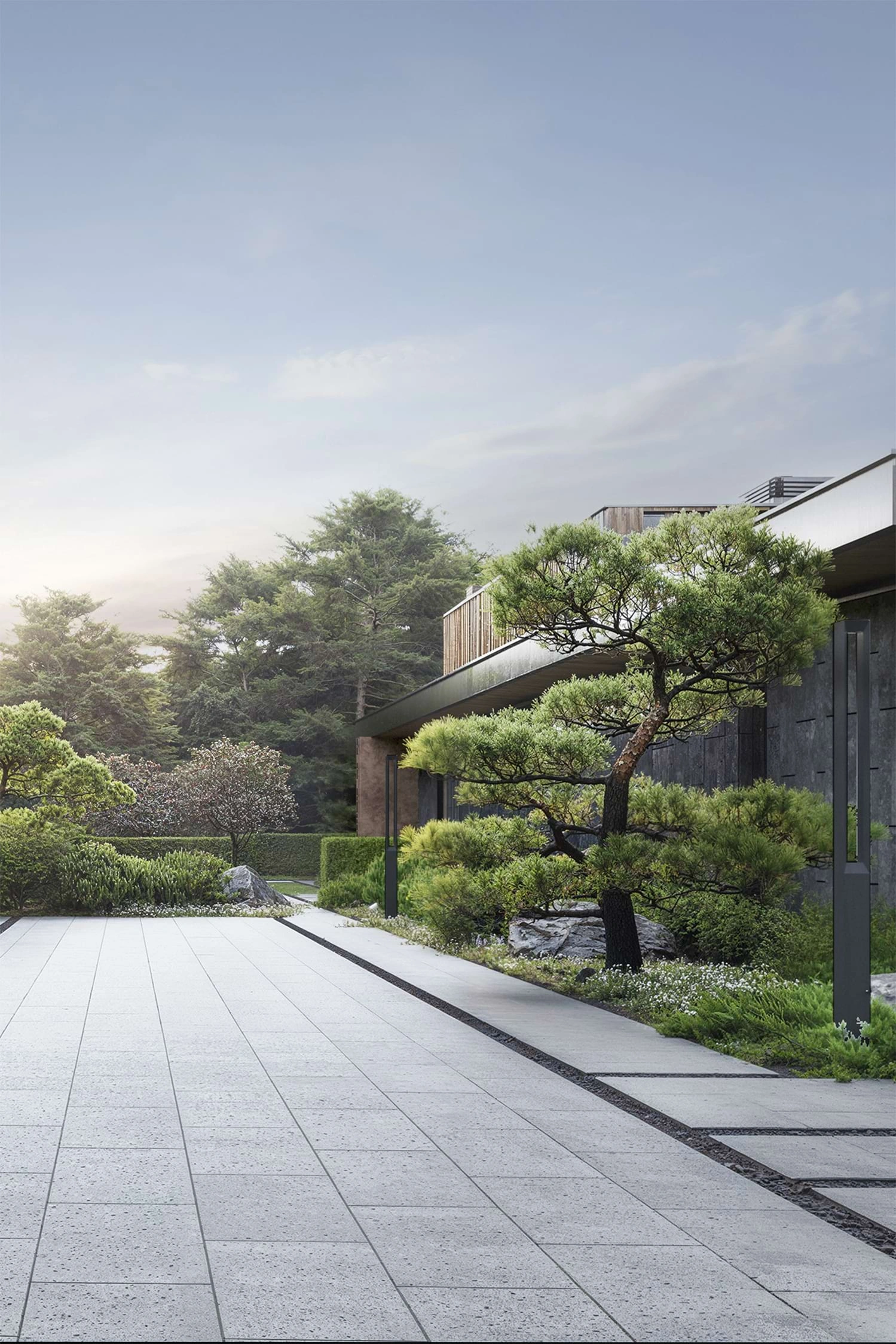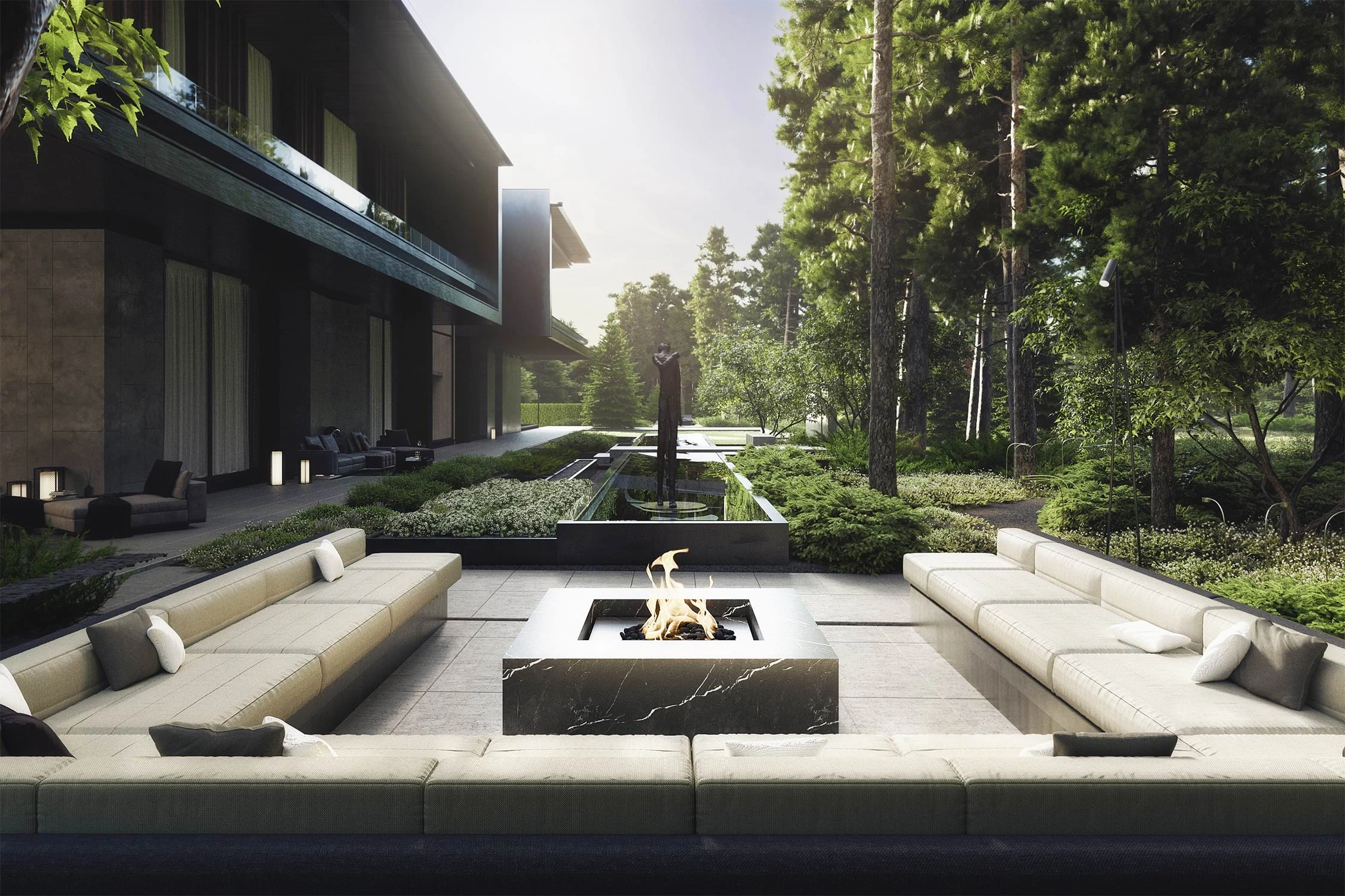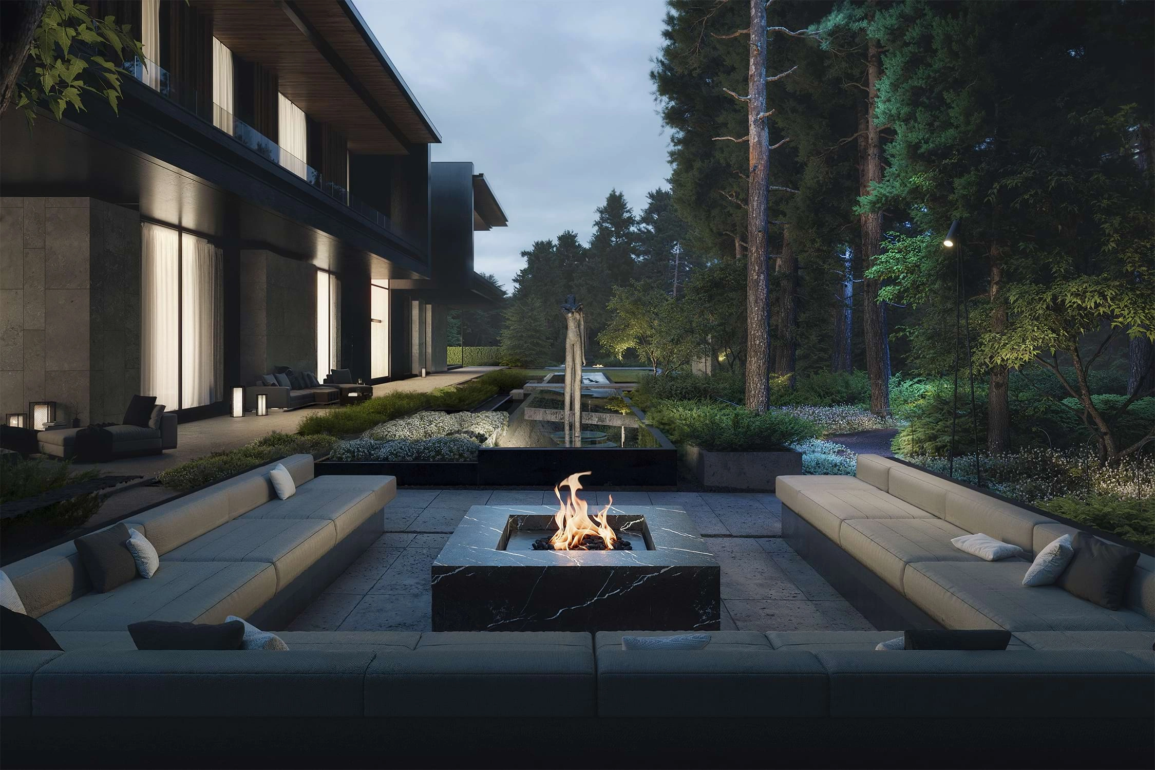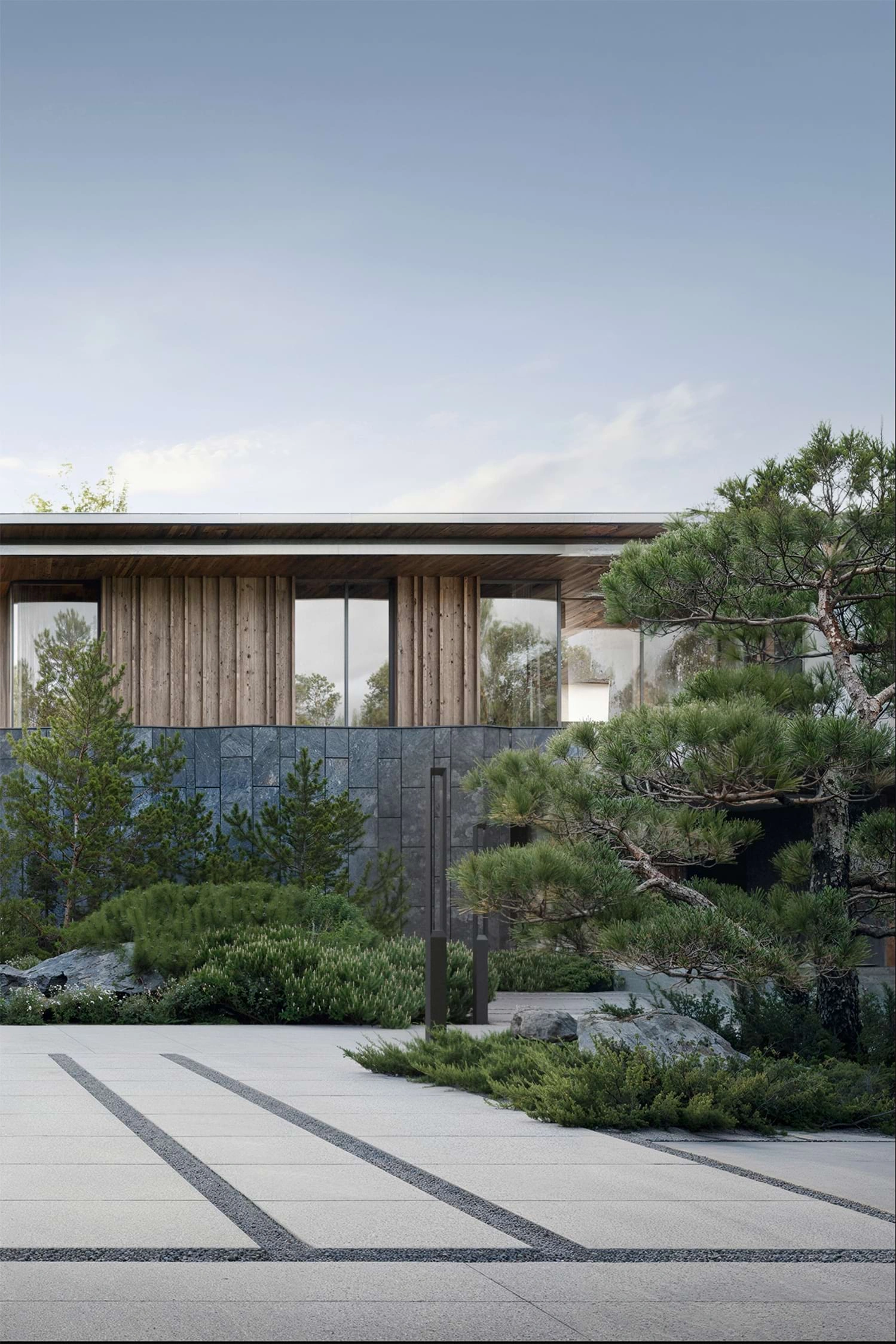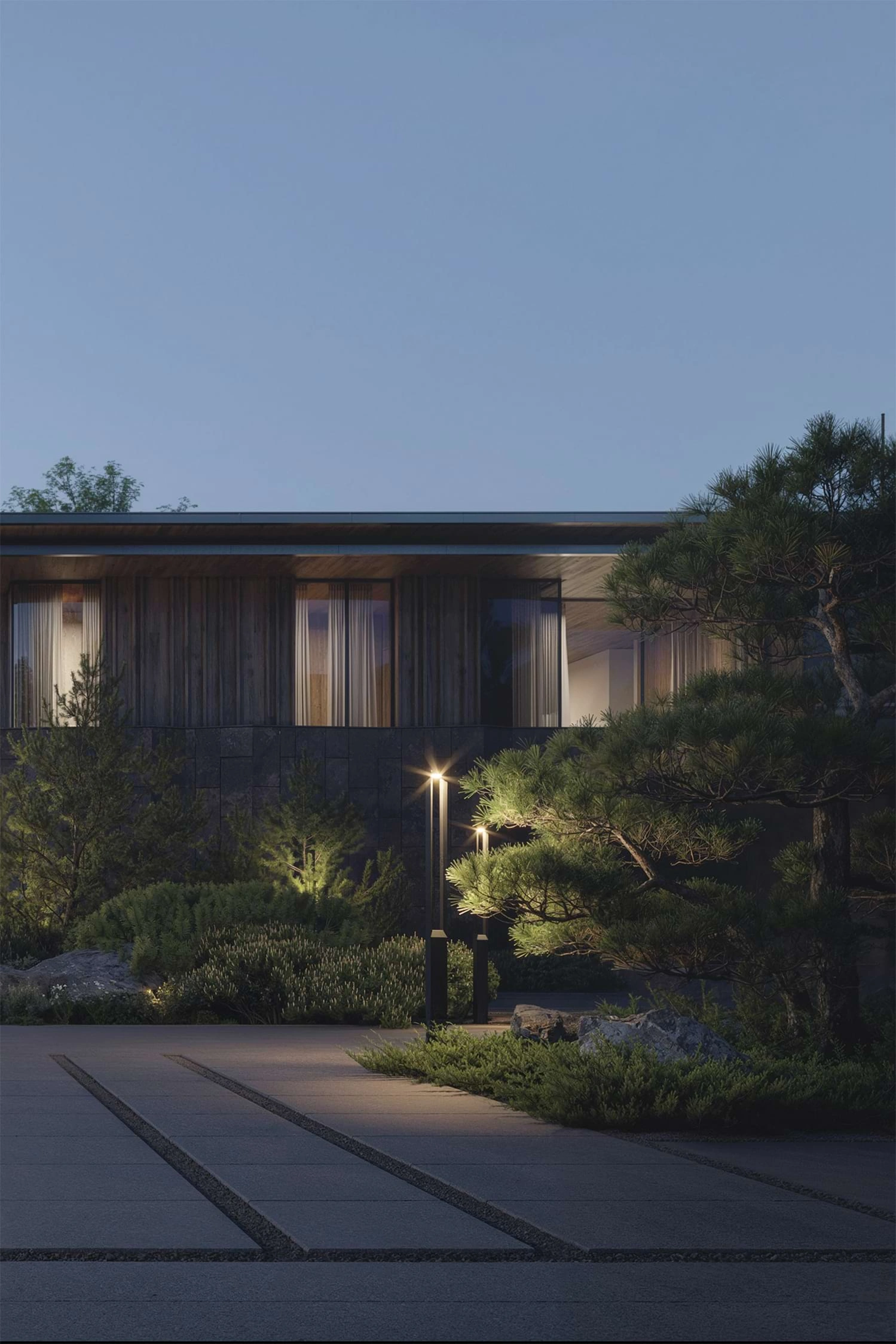 Дом, внушительный по масштабу, органично вписан в природу. Сад не противостоит зданию, а обнимает его, смягчает, превращая в часть живого пейзажа. Маршрут по саду охватывает разные зоны благоустройства с собственным характером, светом и настроением. От парадного входа в строгом и лаконичном стиле до солнечного плодового сада и нуарного лиственного леса — на протяжении прогулки человек замедляется, останавливается, изучает, чувствует. Мы сознательно ломаем линейность участка, меняя покрытия, растительность, освещение и материалы, чтобы путь не казался бесконечным коридором, а раскрывался как череда неожиданных пейзажей.