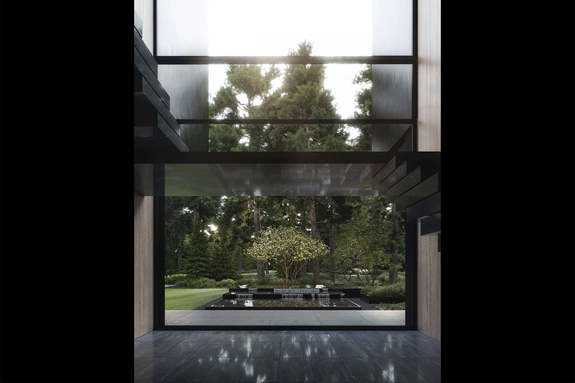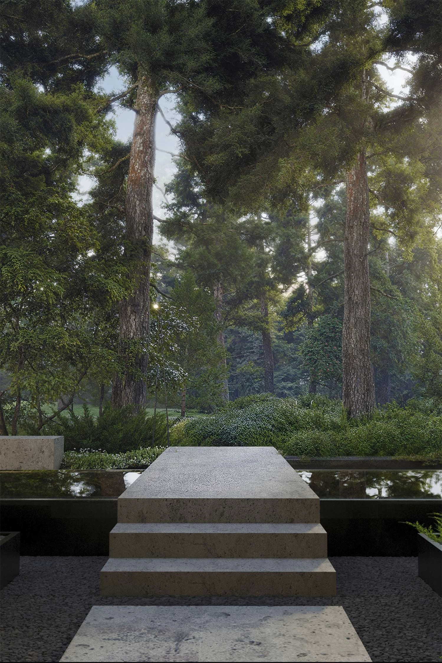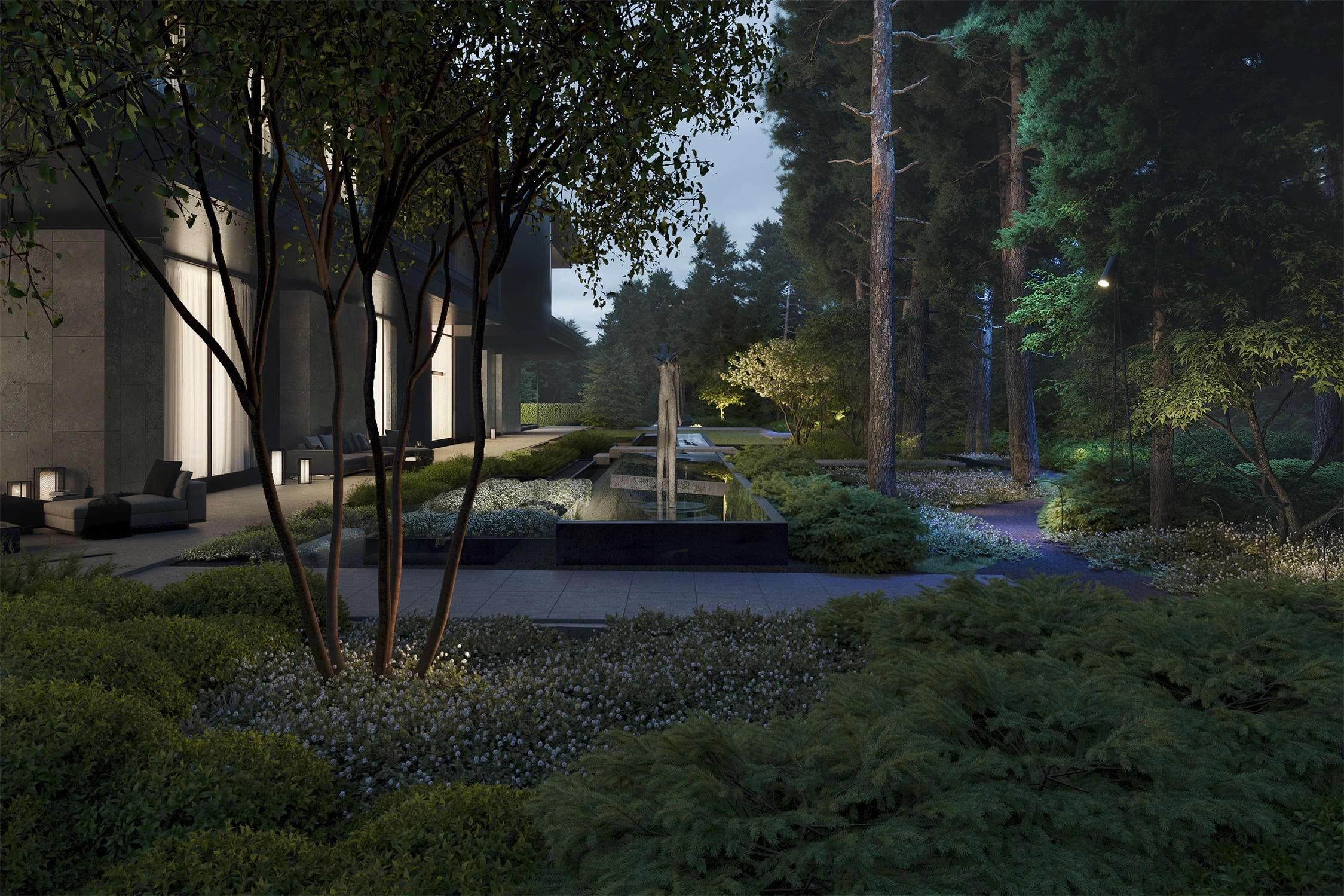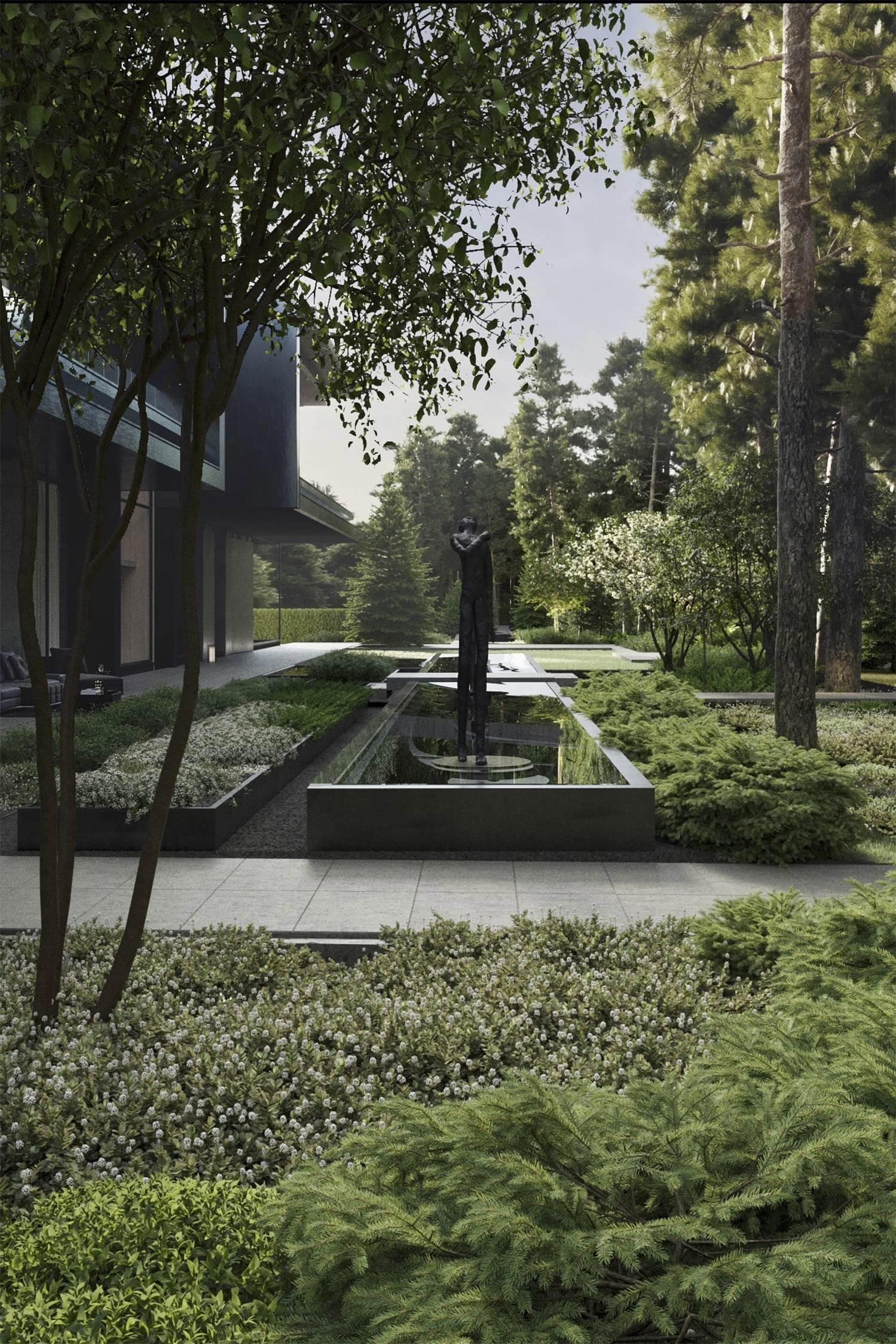 Центральная композиционная ось сада — визуальная и смысловая — тянется от входа в дом через стеклянный атриум и лестницу прямо к вытянутому водному объекту длиной 20 метров. Вода отвечает архитектуре террасы и создаёт иллюзию глубины, отражая лес и удваивая пространство.