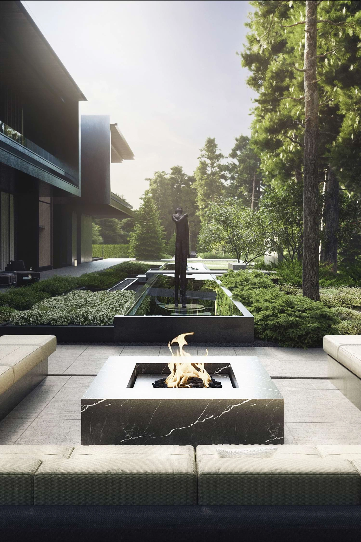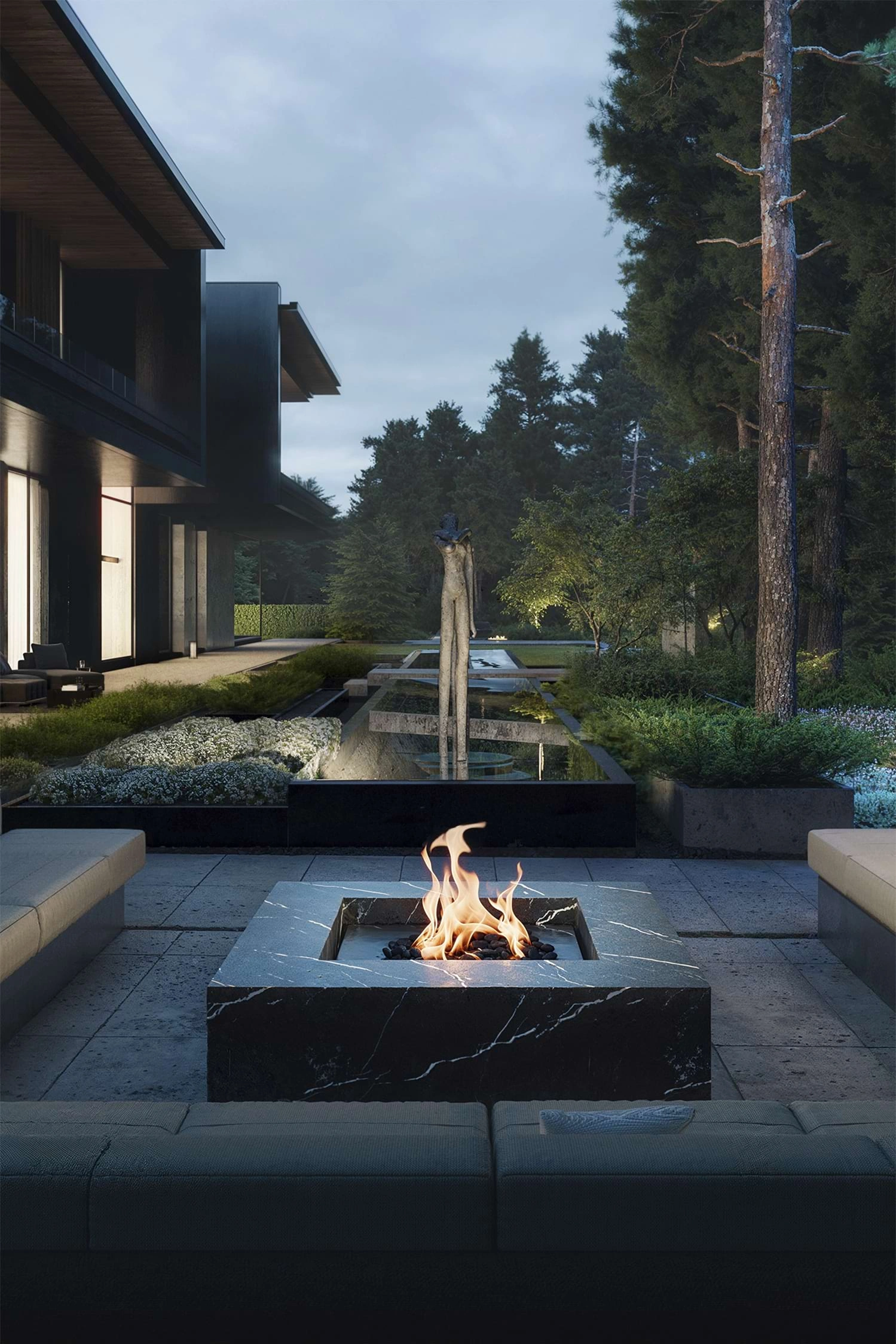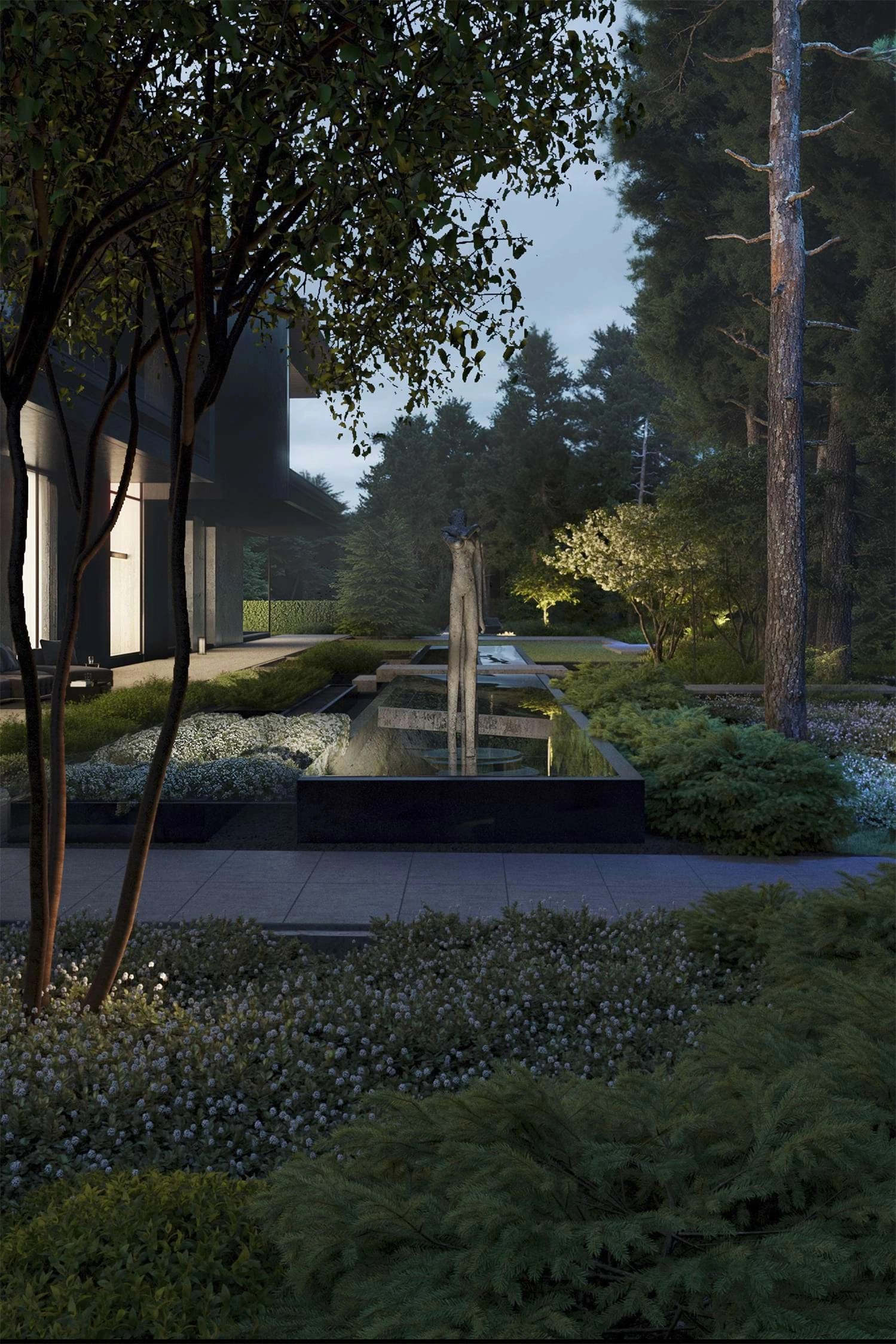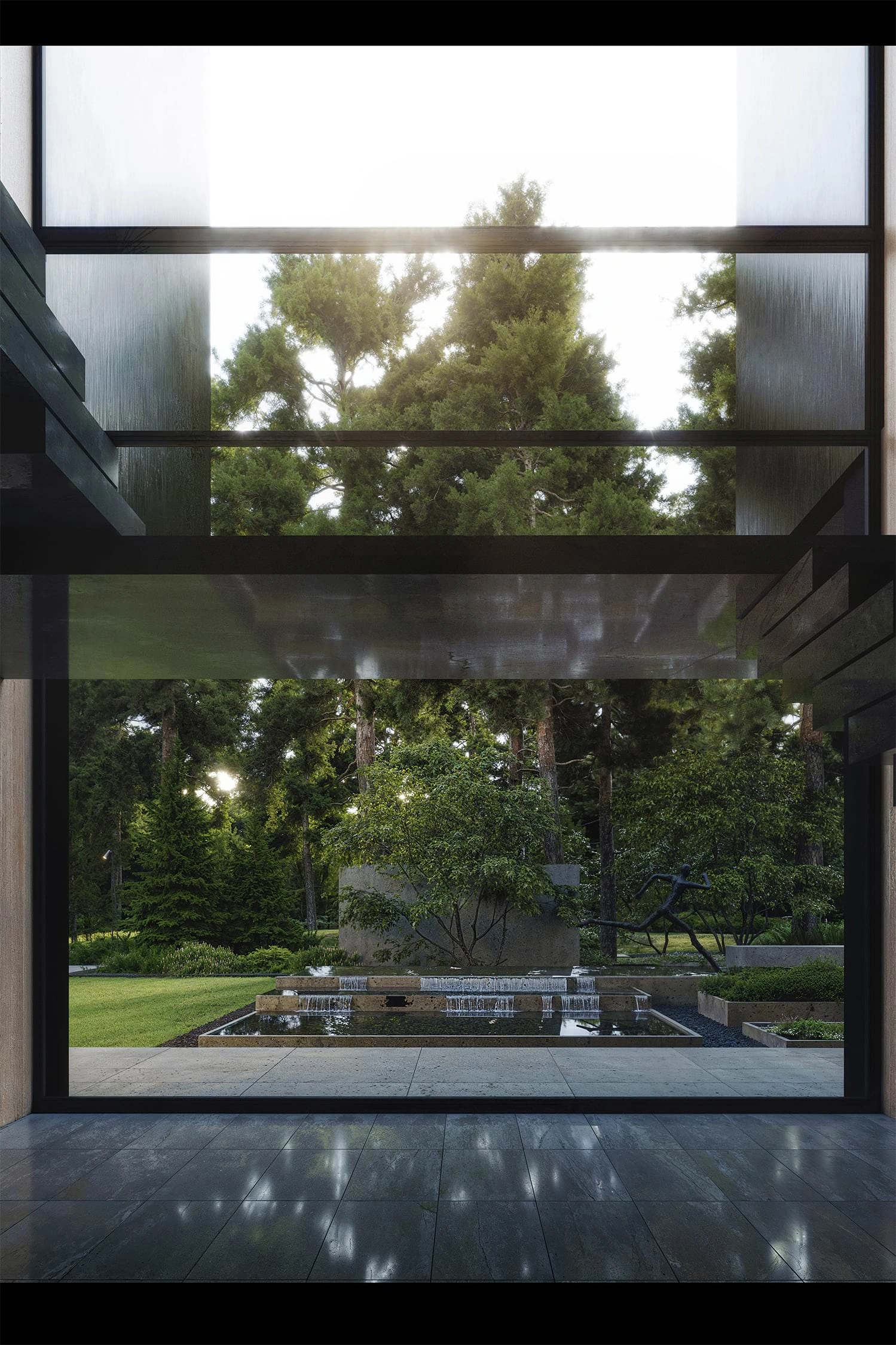 Центральная композиционная ось сада — визуальная и смысловая — тянется от входа в дом через стеклянный атриум и лестницу прямо к вытянутому водному объекту длиной 20 метров. Вода отвечает архитектуре террасы и создаёт иллюзию глубины, отражая лес и удваивая пространство.