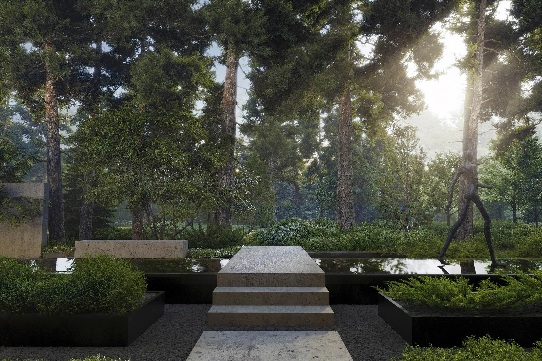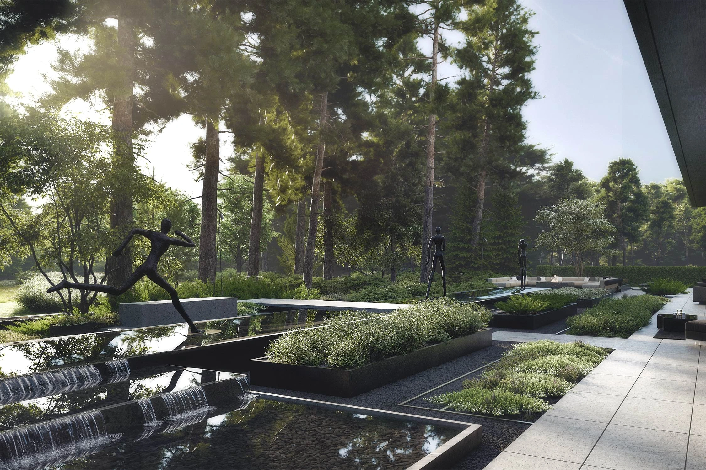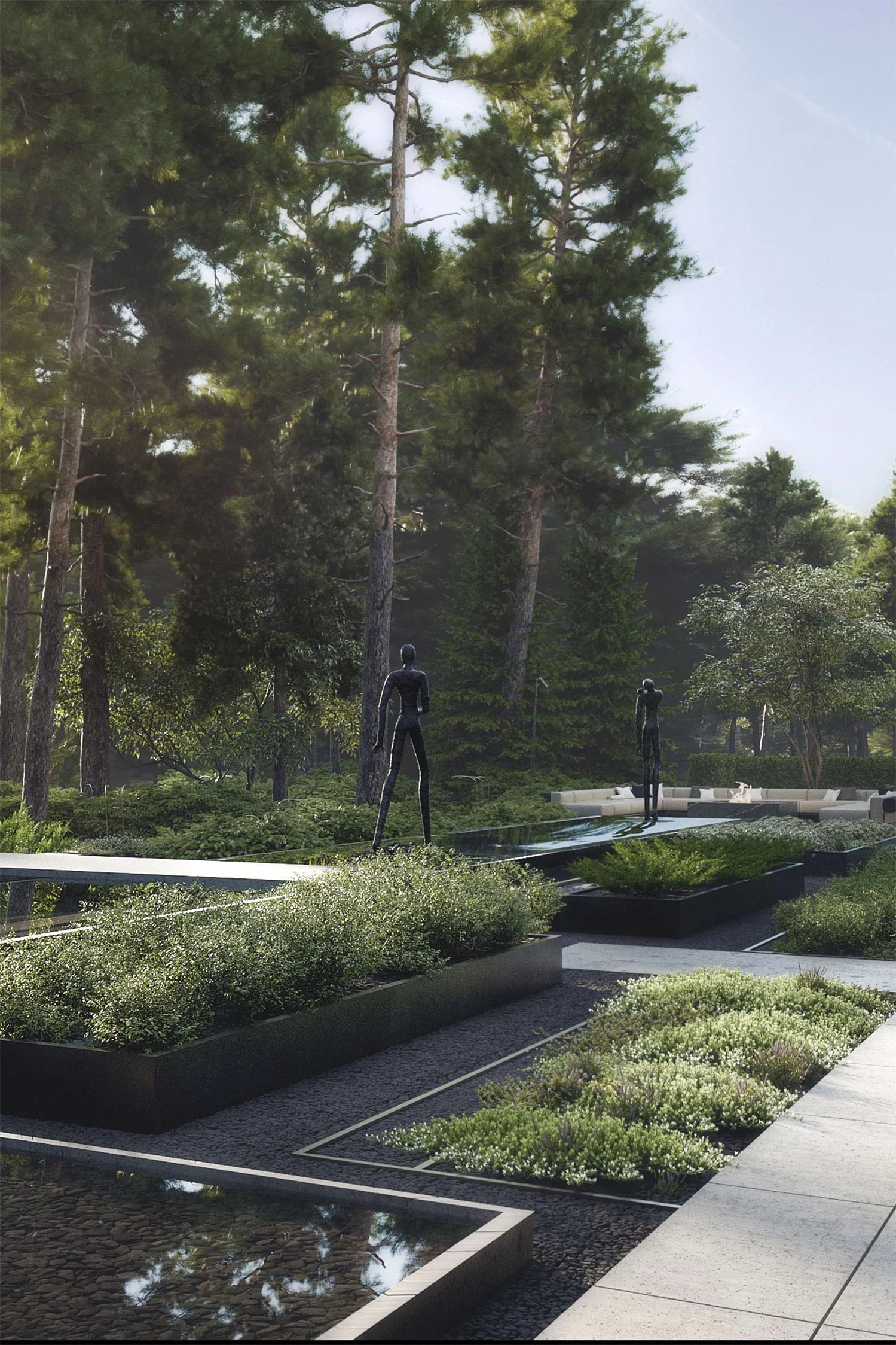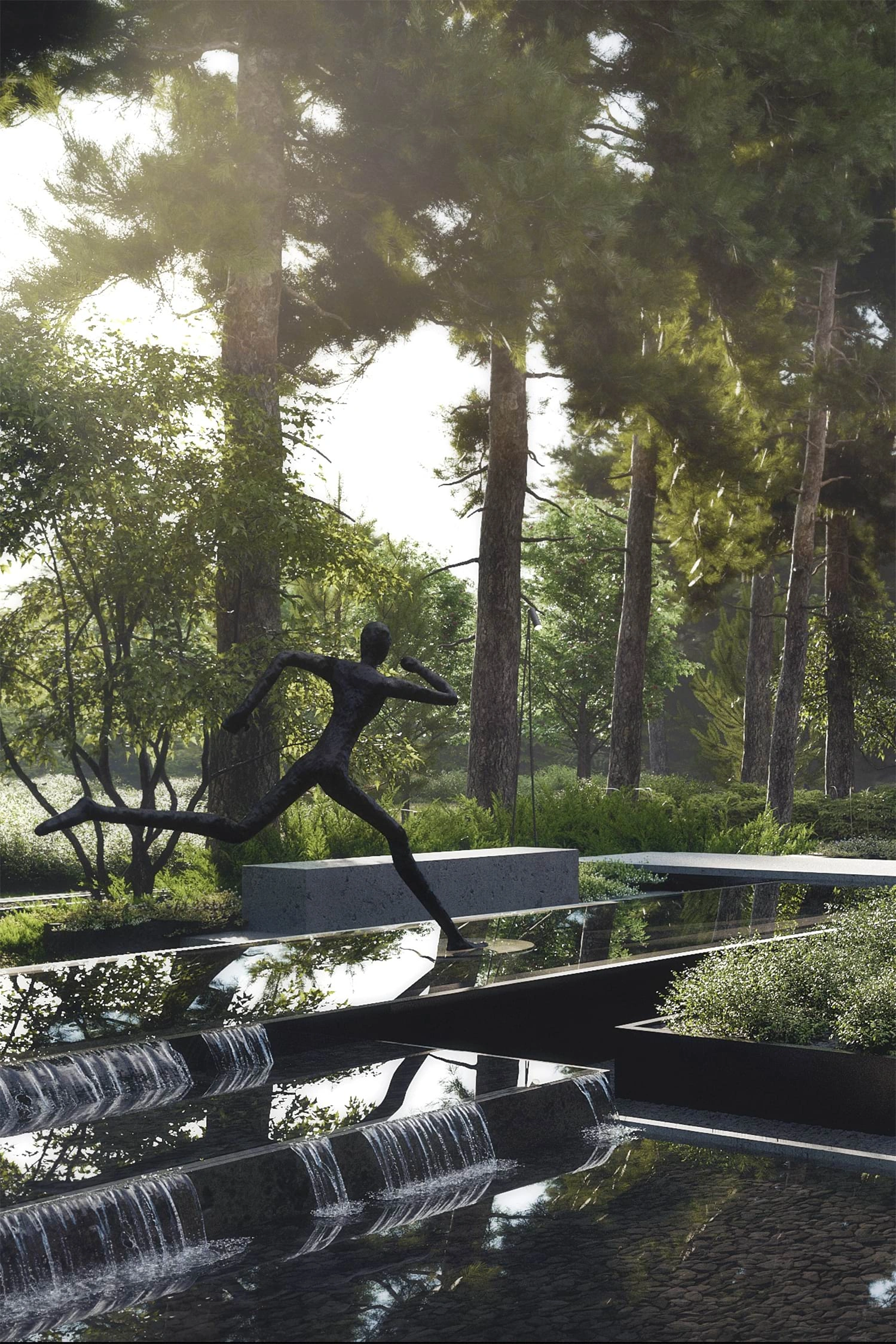 Визуальной доминантой сада является композиция из трехметровых скульптур на воде — бегущий, идущий и стоящий человек — метафора разных скоростей жизни, движения и замедления.
