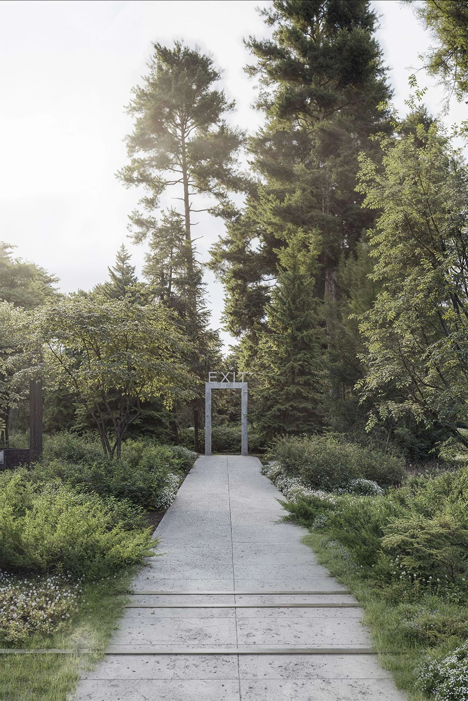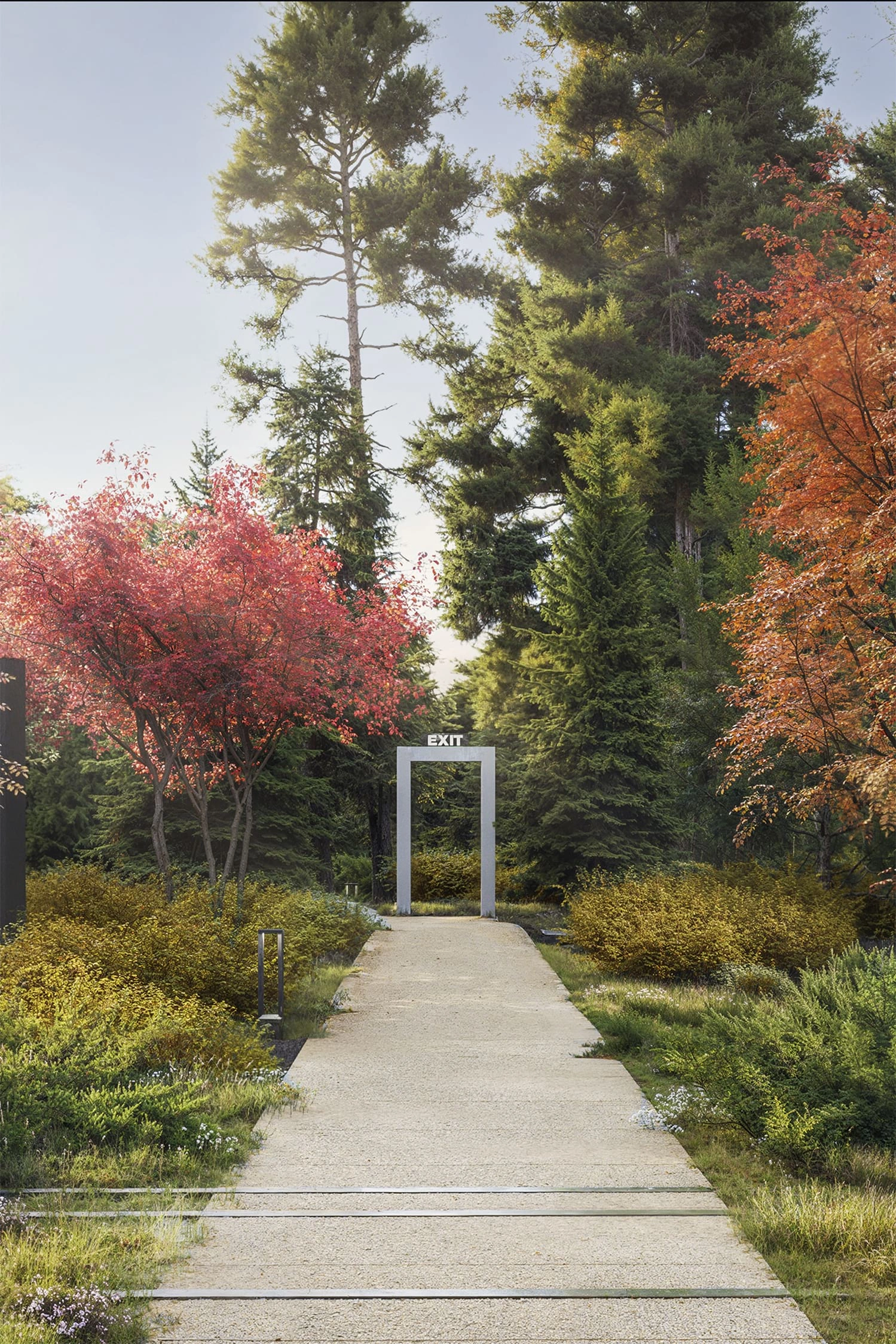 Ключевой материал проекта — металл, отсылающий к миру железных дорог: настоящие рельсы, сетчатые настилы, латунные детали, арка в лесу с ироничной табличкой exit, будто сошедшей с перрона вокзала. Эти элементы придают саду современный, немного брутальный характер, но без агрессии — лишь сдержанная сила и уважение к профессии владельца.